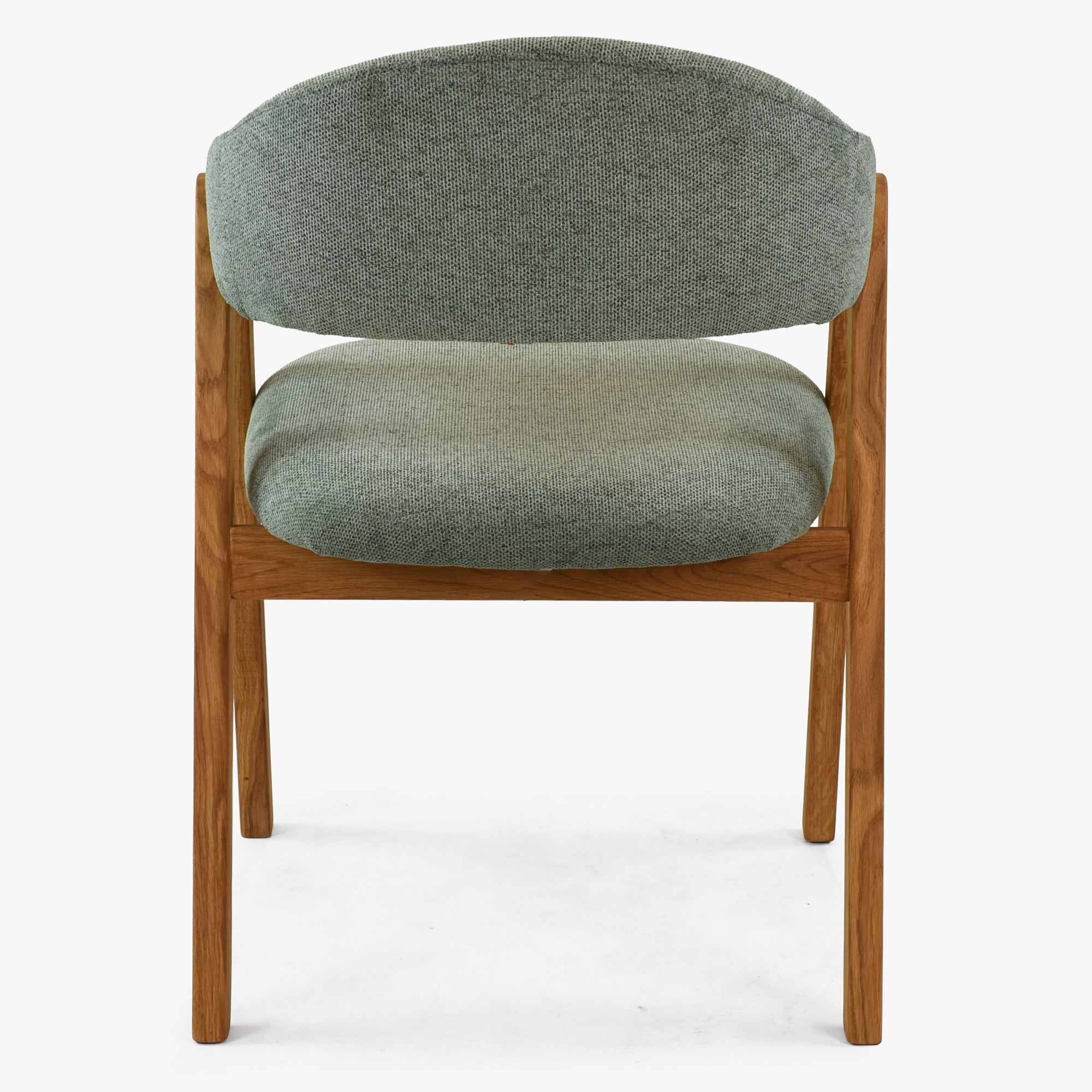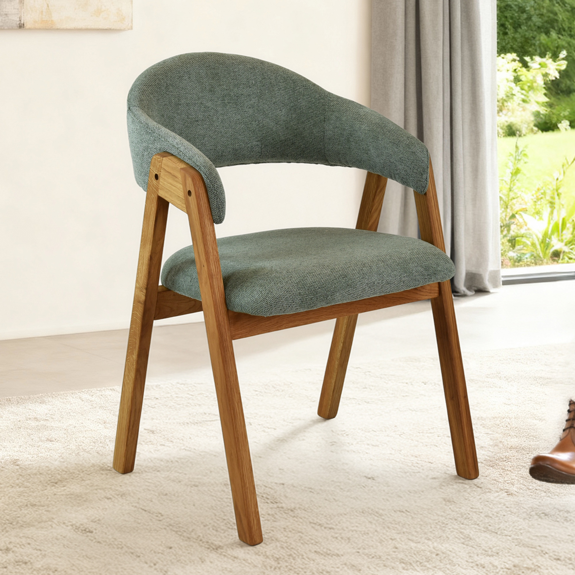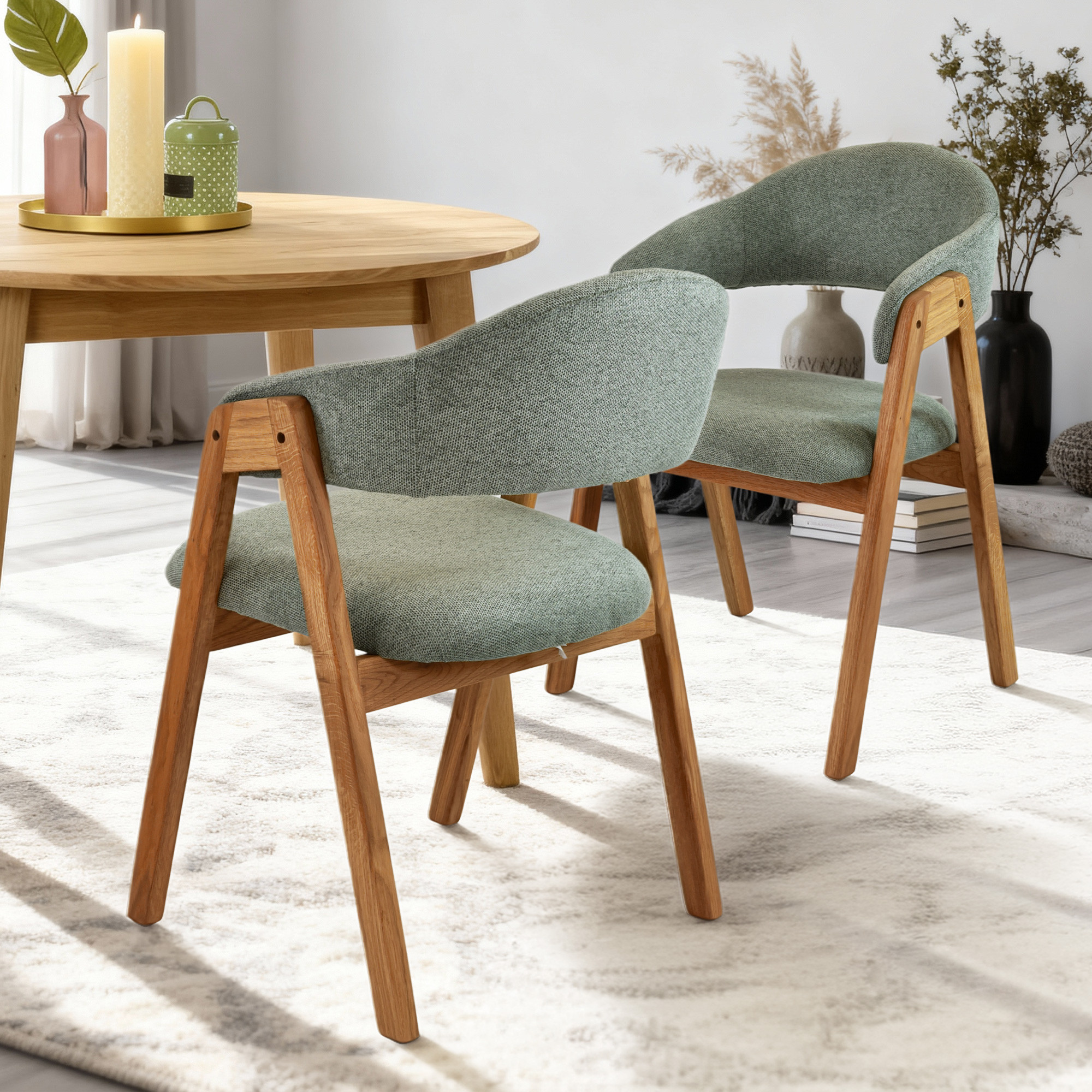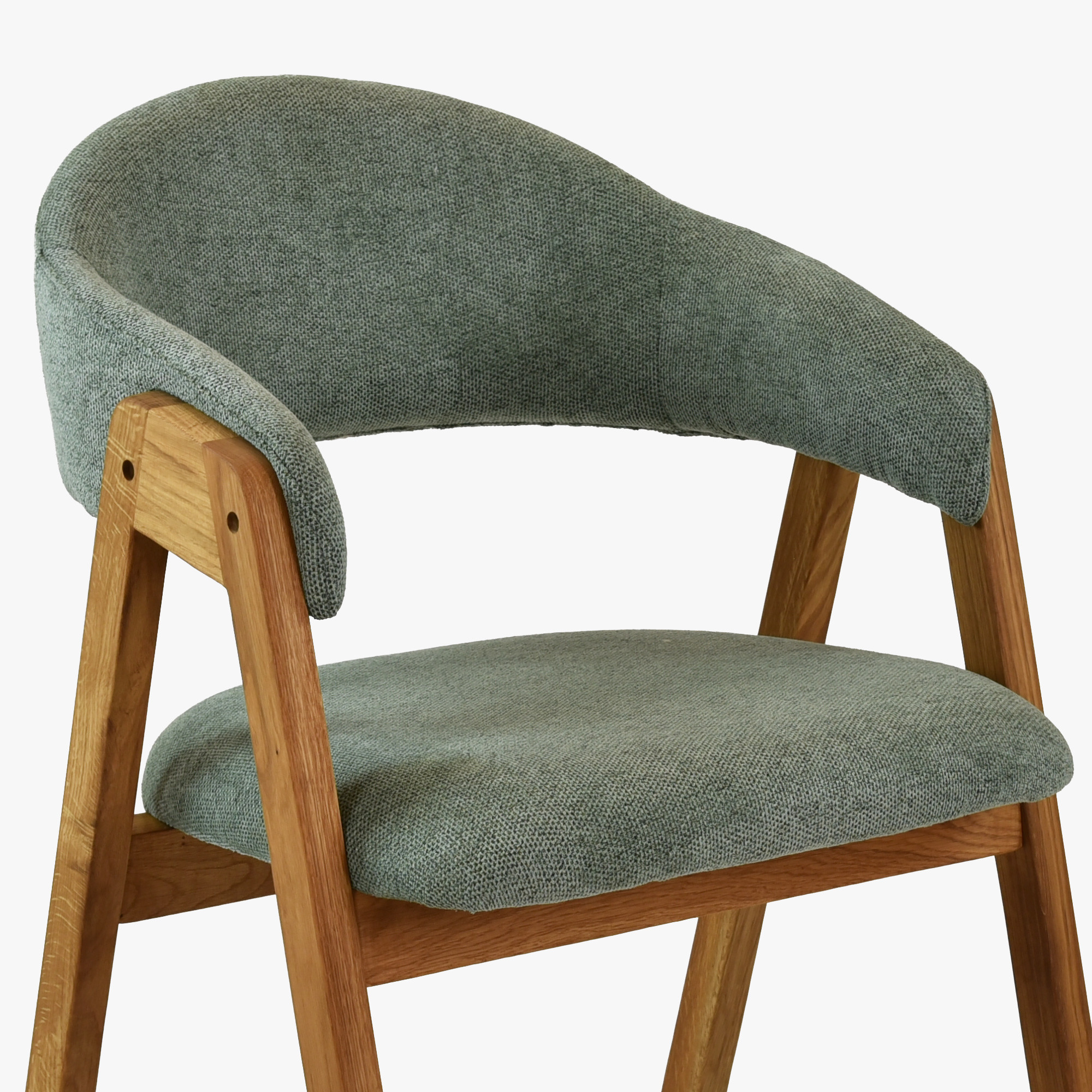Entdecken Sie die perfekte Kombination aus Eleganz und Komfort mit unserem Esszimmerstuhl aus massivem Eichenholz. Dieser gepolsterte Stuhl mit Armlehnen bringt zeitloses Design und außergewöhnlichen Sitzkomfort in Ihr Interieur. Sitzfläche und Rückenlehne sind mit hochwertigem Stoff in zartem mintgrau bezogen, der perfekt zum natürlichen Farbton des naturfarbenen Eichenholzes passt. Das Eichenholz ist sorgfältig mit dänischem Öl behandelt, das die natürliche Maserung betont und gleichzeitig die Oberfläche vor Abnutzung schützt.