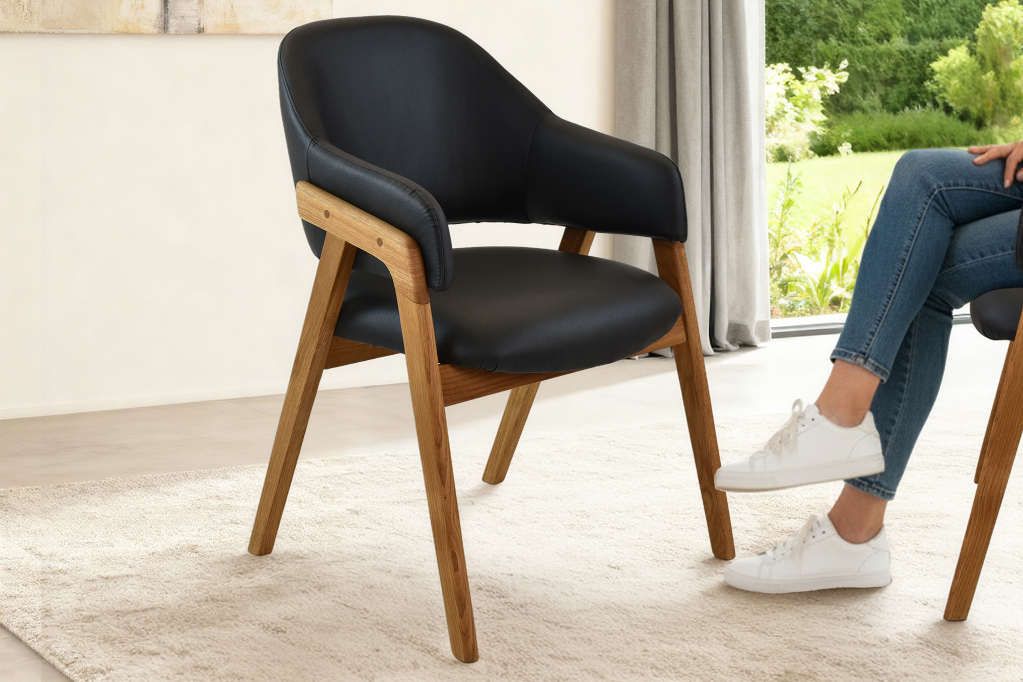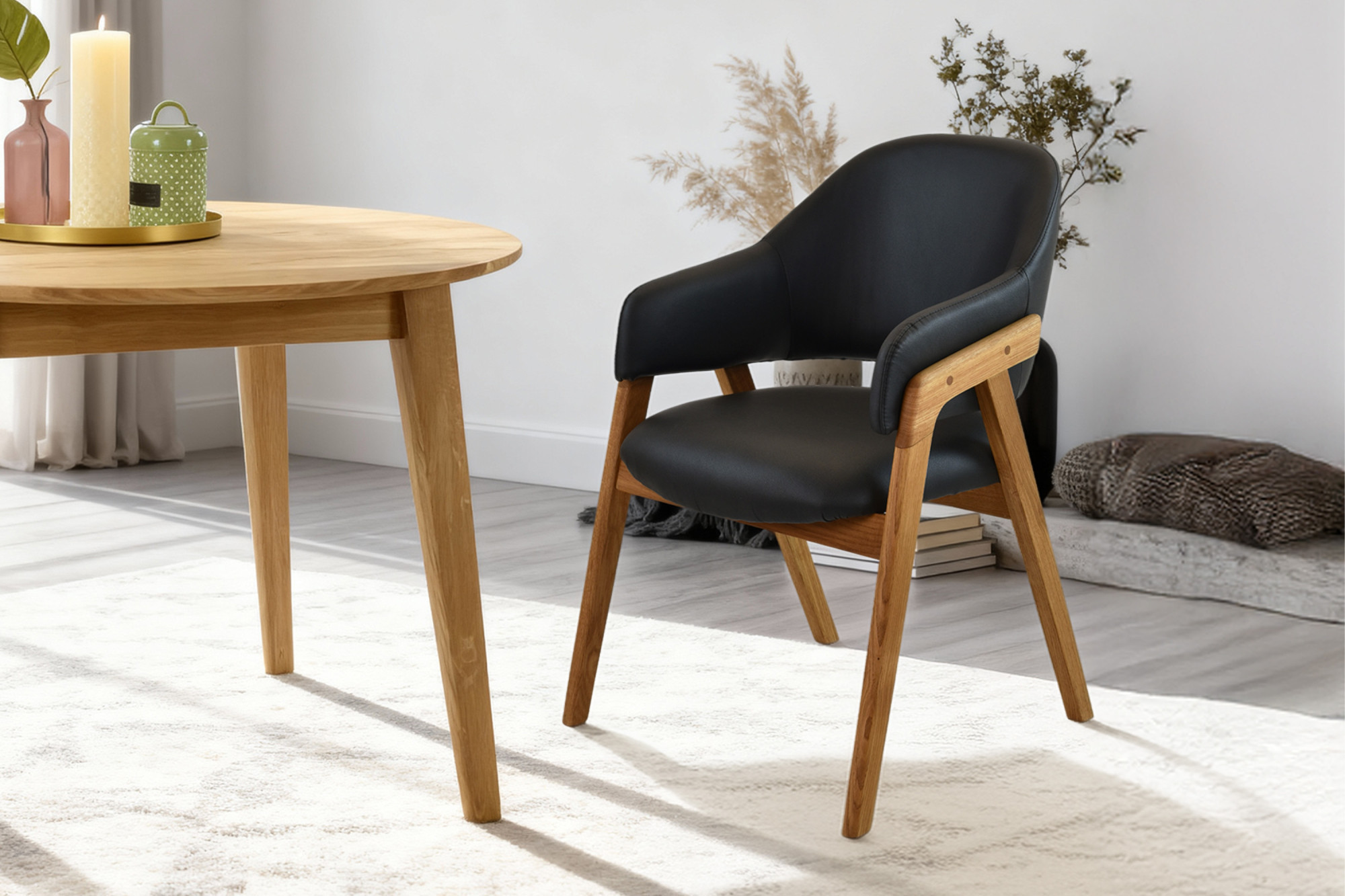Wenn Sie in Möbel für Ihr Zuhause investieren, möchten Sie sicher sein, dass Sie Qualität erhalten, die hält. Unser Eichenstuhl mit Armlehnen ist nicht nur ein ästhetisches Element Ihres Interieurs – es ist eine Investition in Komfort und Stil für viele Jahre. Die Kombination aus massivem Eichenholz und hochwertiger Polsterung aus veganem Leder bietet Ihnen das Beste aus beiden Welten: natürliches Aussehen und fühlbare Holzqualität zusammen mit luxuriösem Komfort weicher Polsterung.