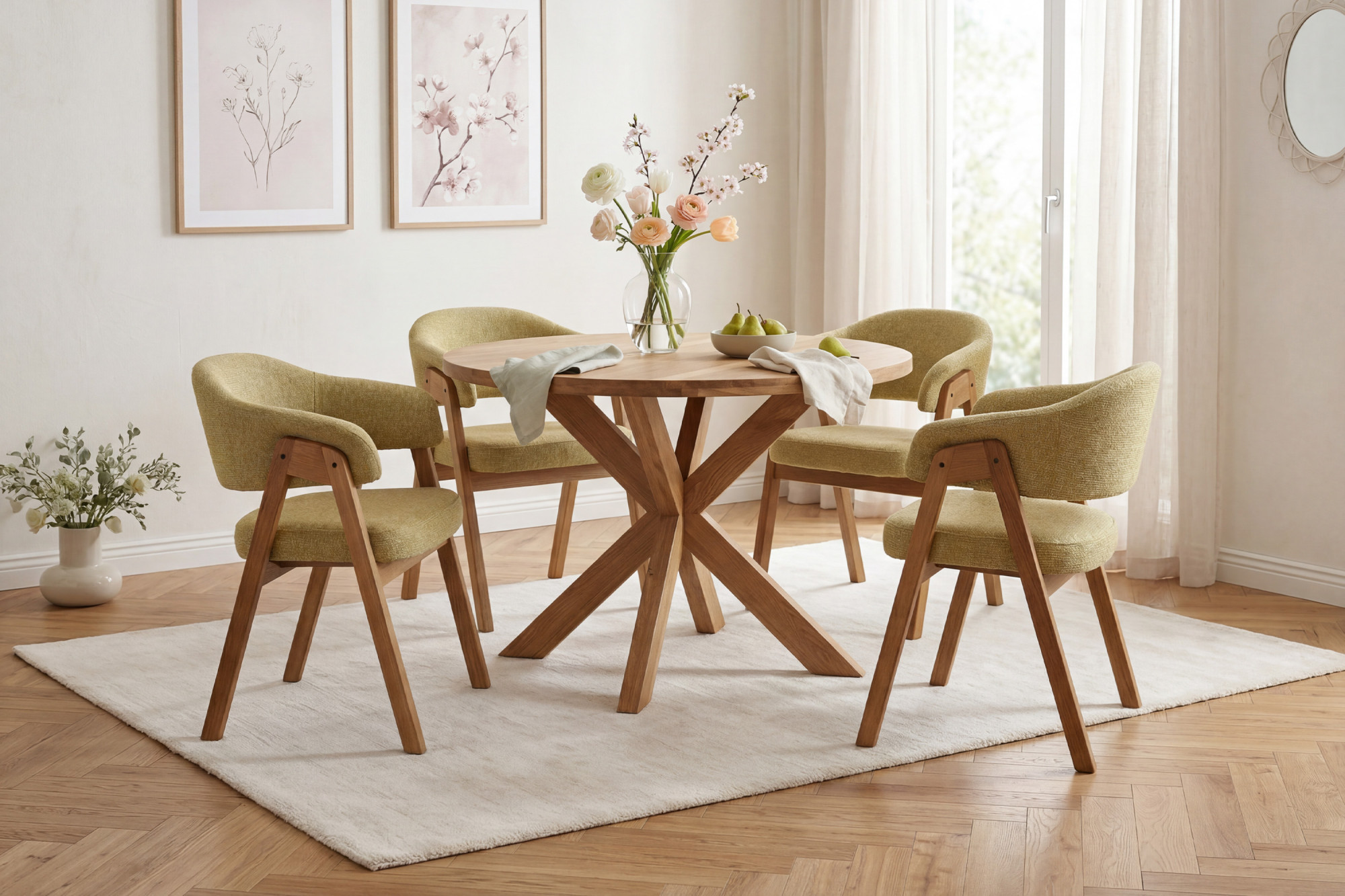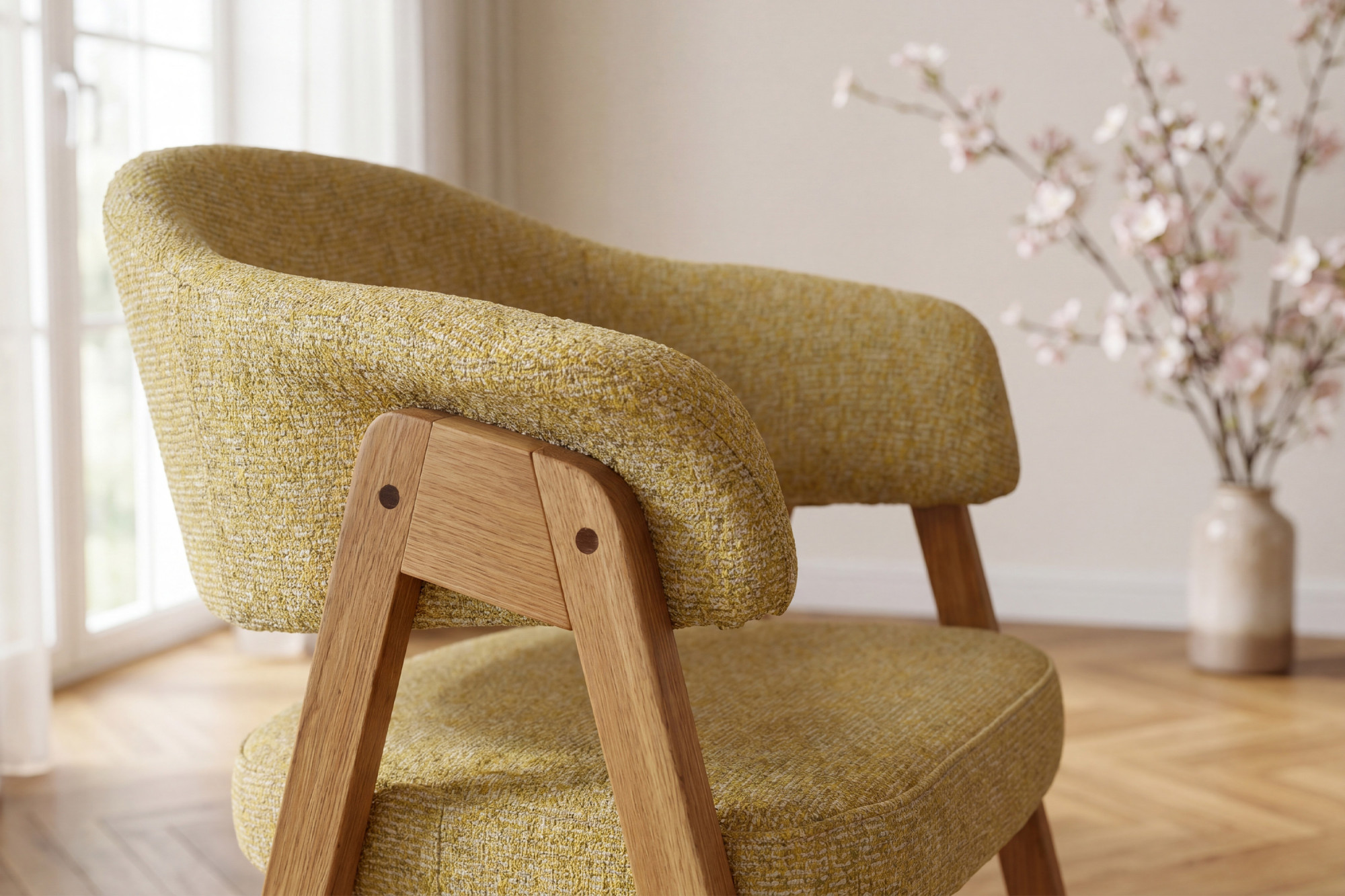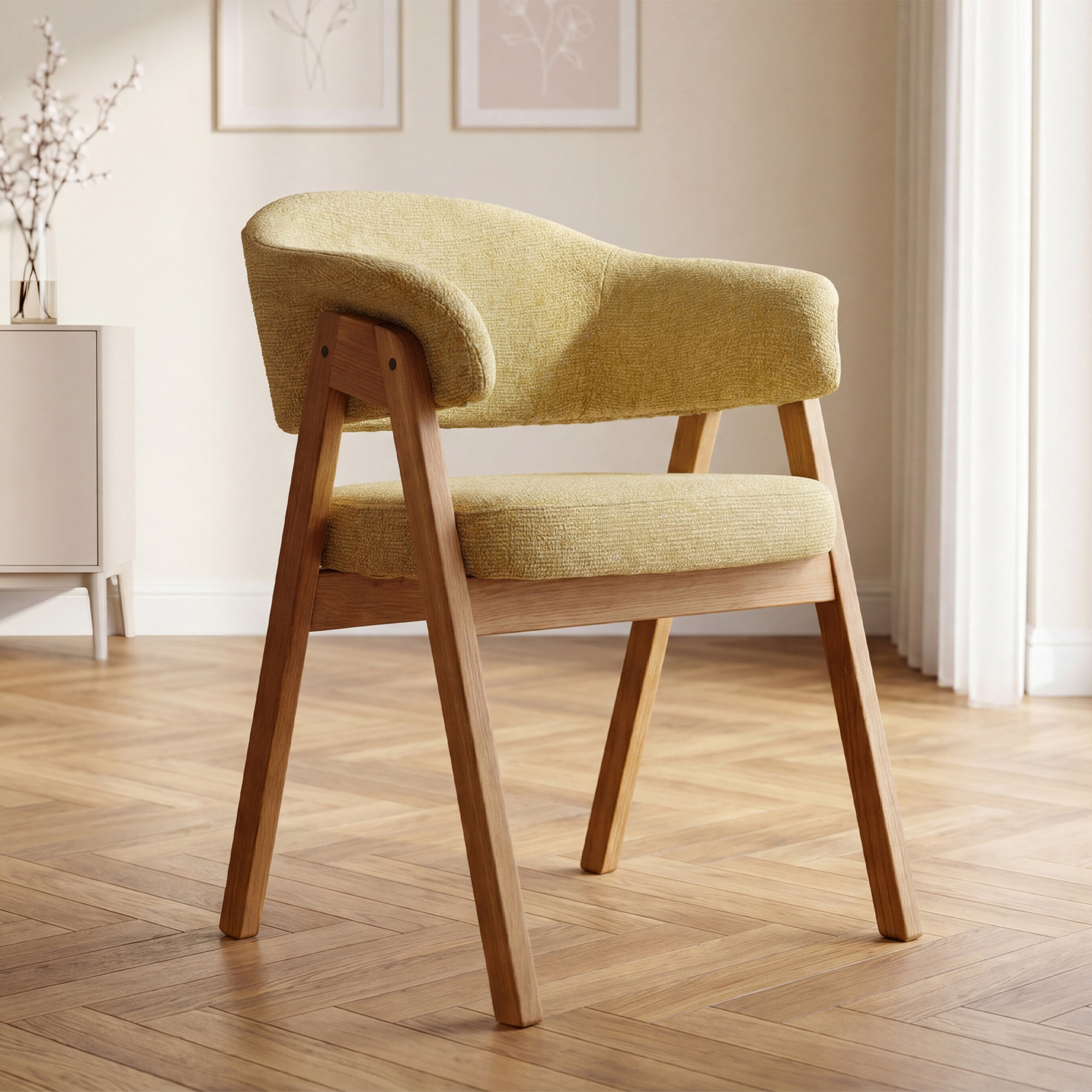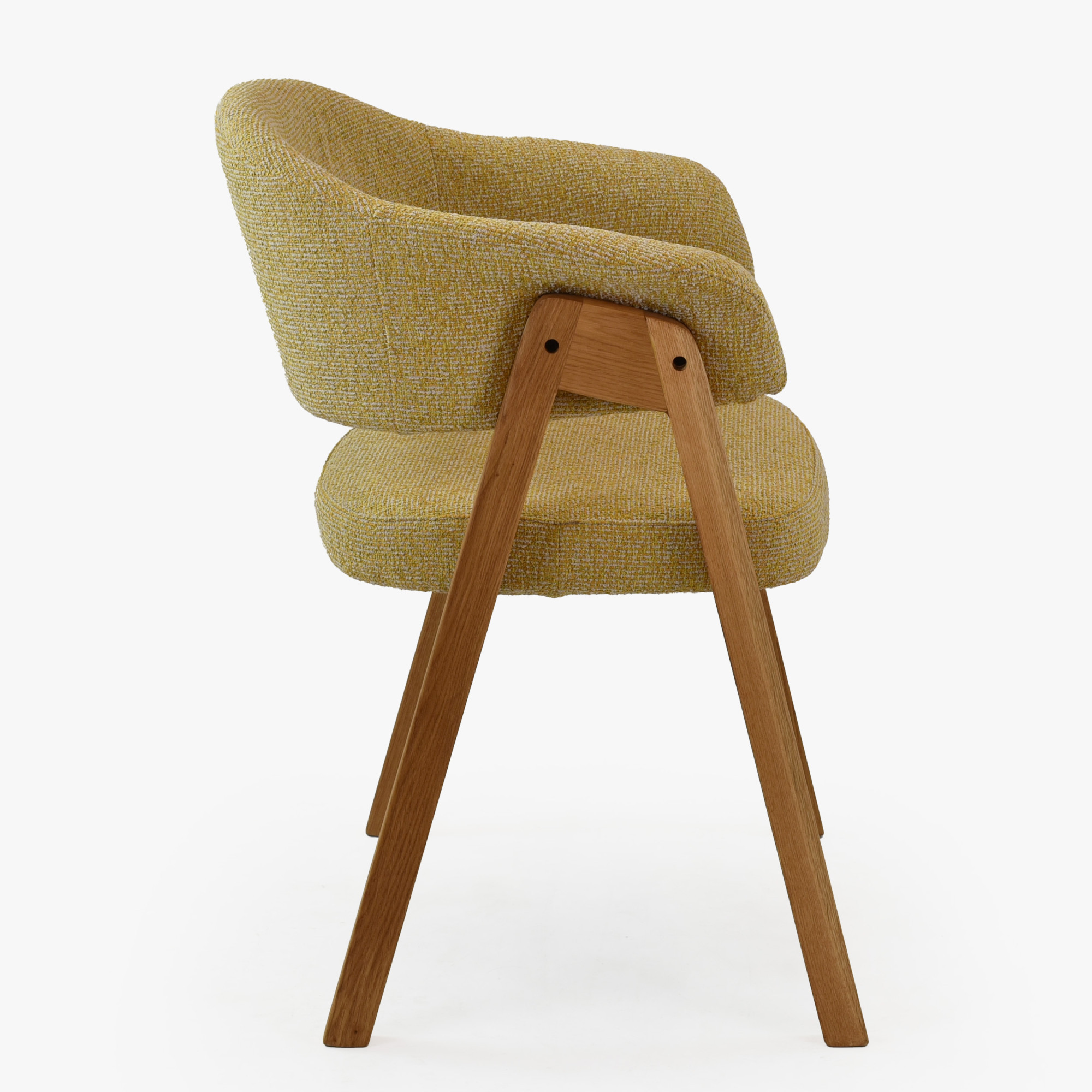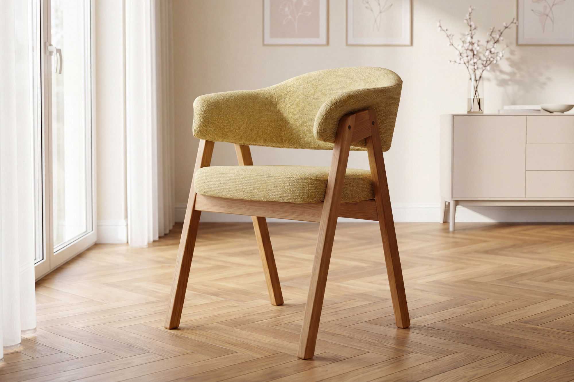 Der Eichenstuhl Mona mit Armlehnen ist eine hervorragende Wahl für Kunden, die einen hochwertigen Massivholz-Esstischstuhl mit Fokus auf Komfort, Langlebigkeit und zeitloses Design suchen. Durch die Kombination aus ehrlichem Eichenholz, präziser Verarbeitung und strapazierfähigem Polster erhalten Sie ein Möbelstück, das Ihnen jahrelang zuverlässig dient. Die natürliche Eiche im Farbton natural lässt sich leicht mit weiteren Möbelstücken kombinieren, und der gelbe Bezug verleiht dem Raum Gemütlichkeit und einen individuellen Stil.