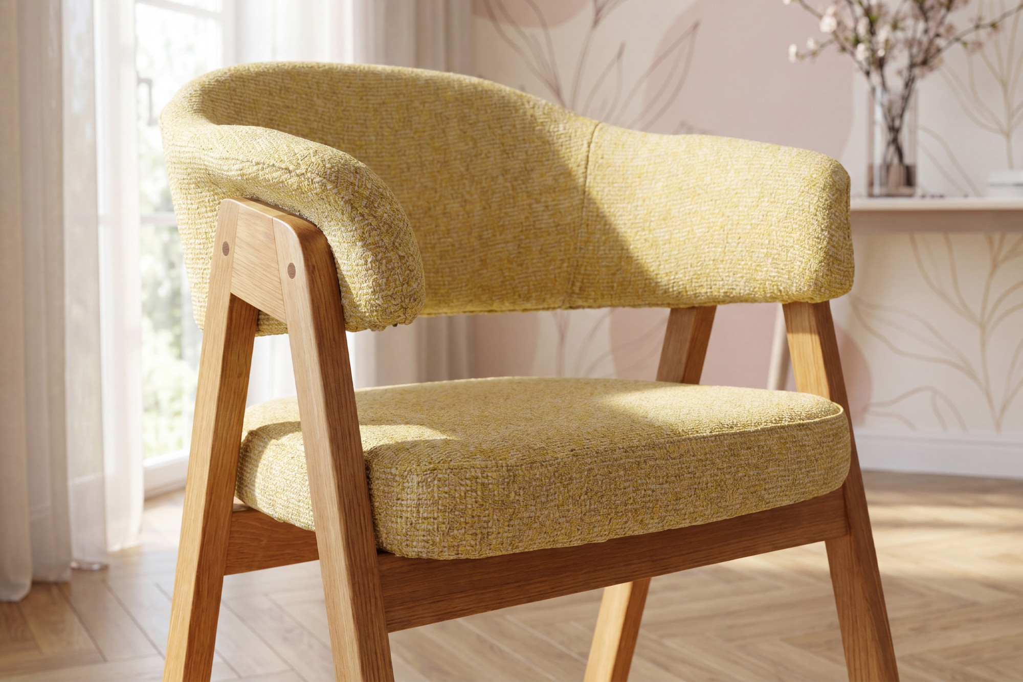 Eichenstuhl mit Armlehnen Mona, gelb – gepolsterter Massivholz-Esstischstuhl