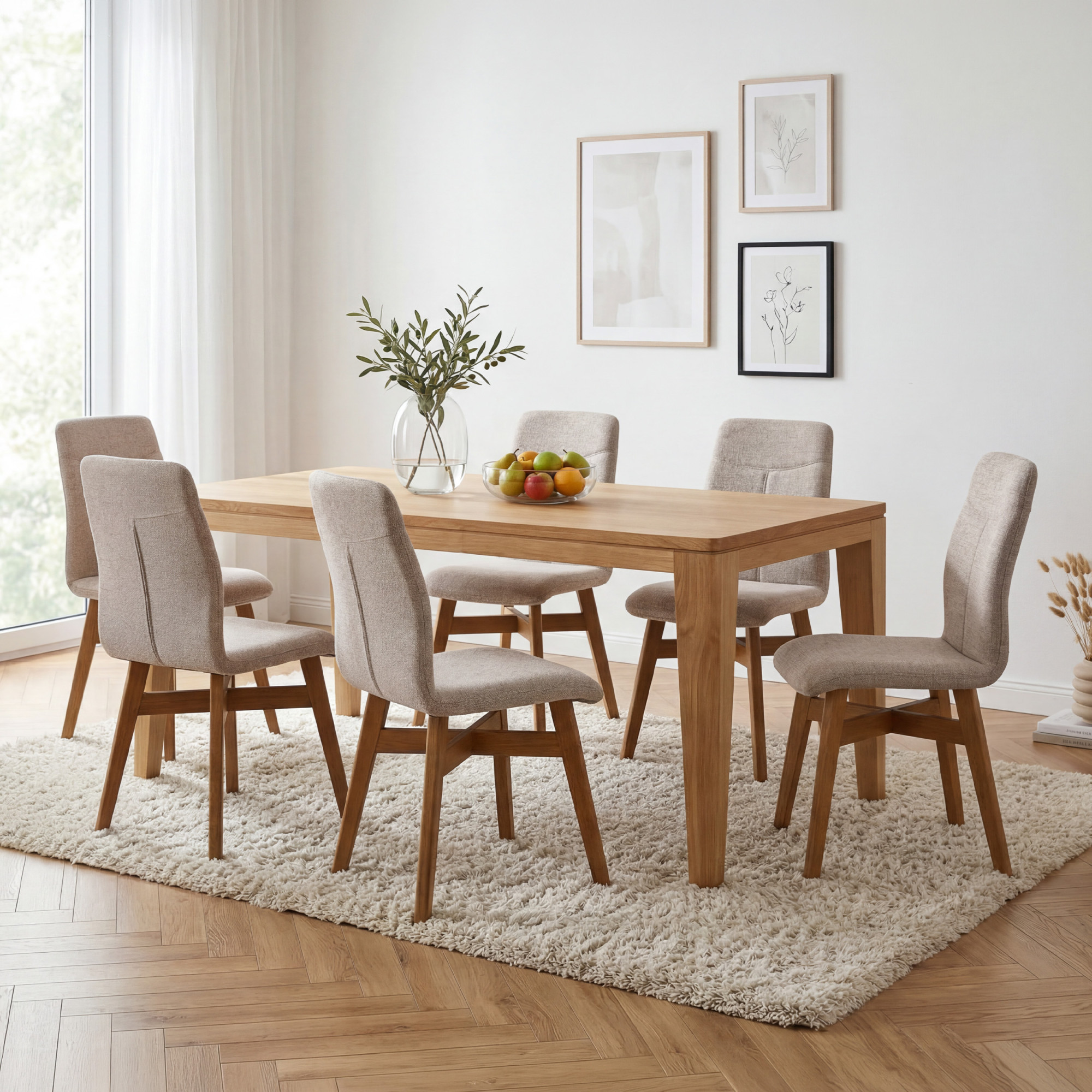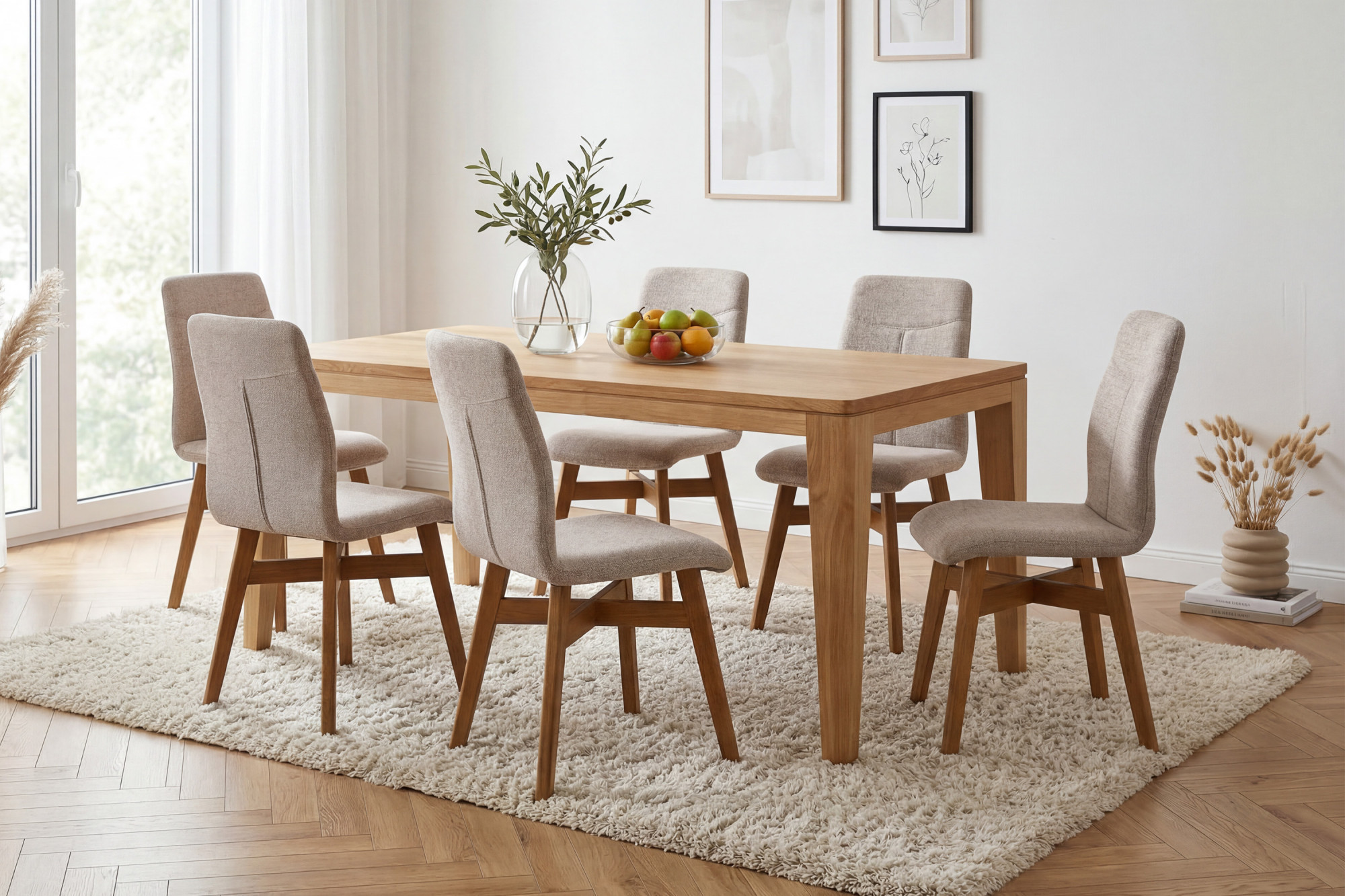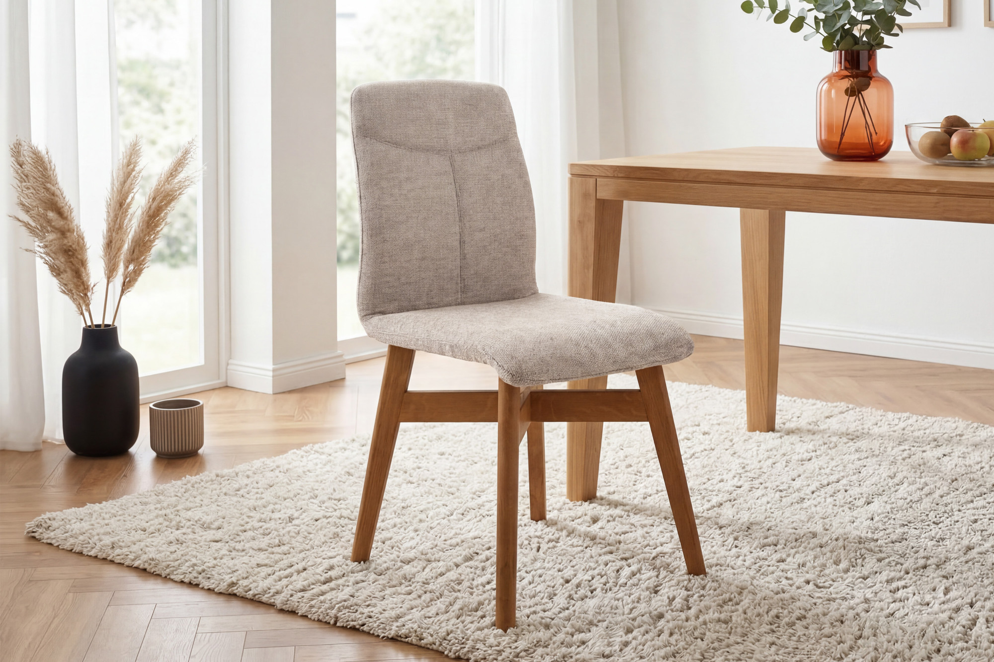 * Auf dem Bild ein Eichen- Esszimmertisch York Öl 160 x 90 und der Esszimmer- Stuhl York in Grau - easy clean Stoff