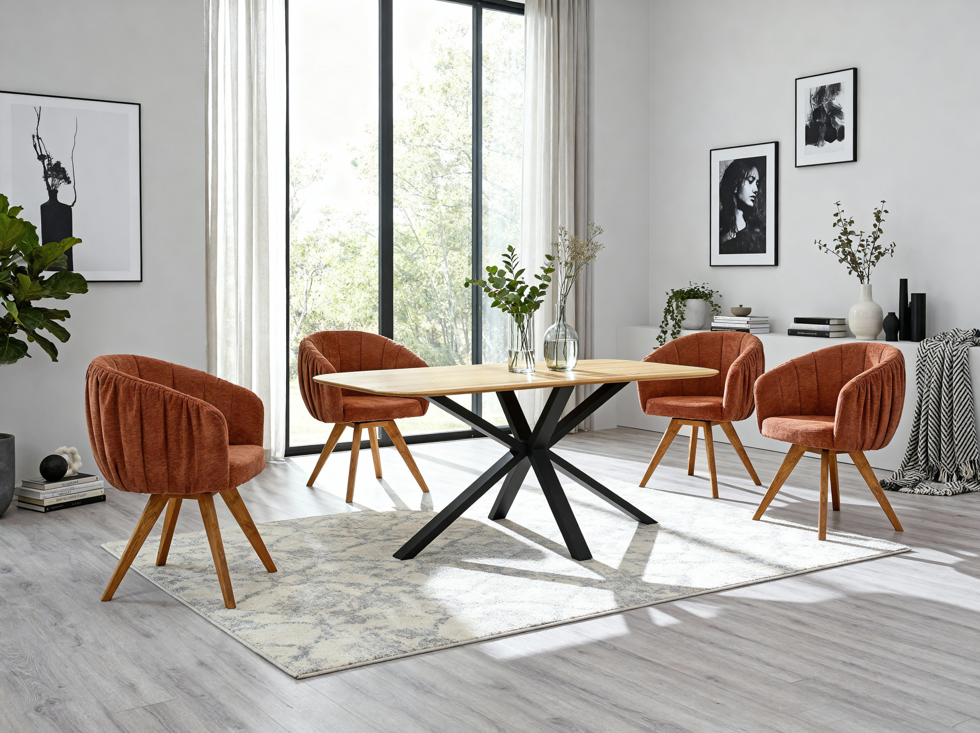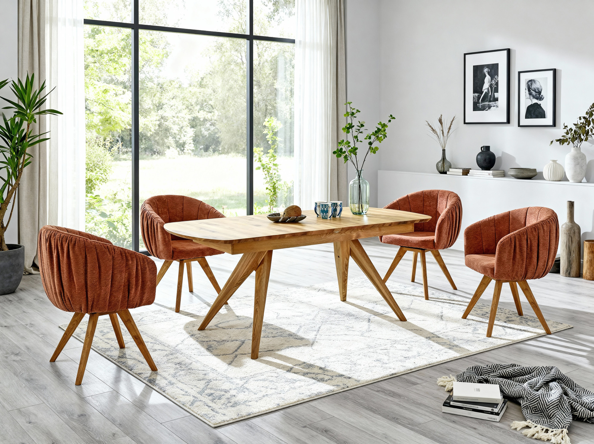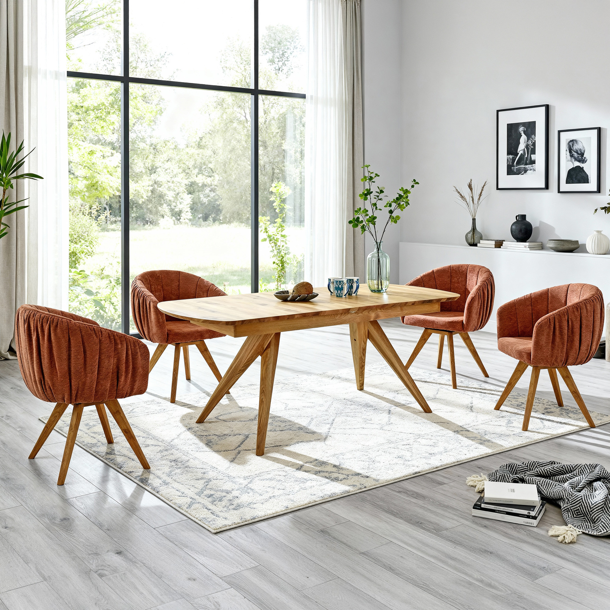 * Auf dem Bild ausziehbarer Eichentisch Anor und der Eichen- Stuhl mit drehbarem Sitz in Orange Elba