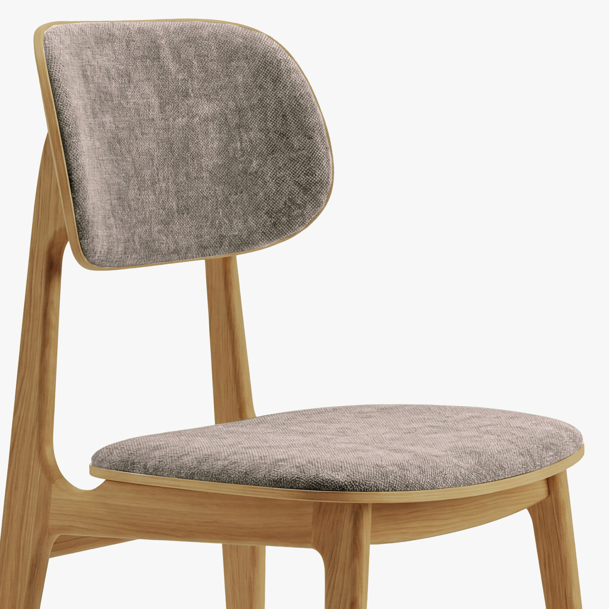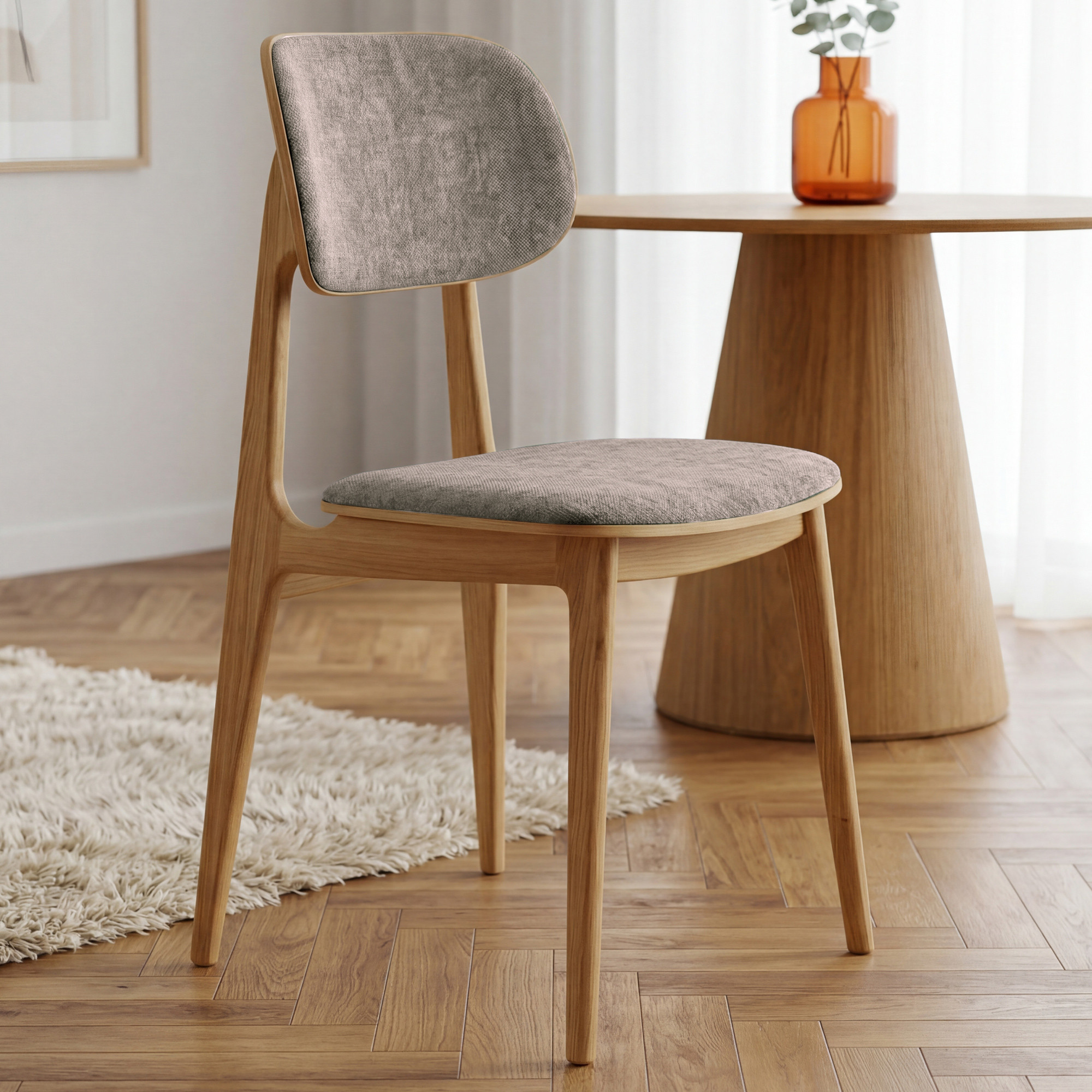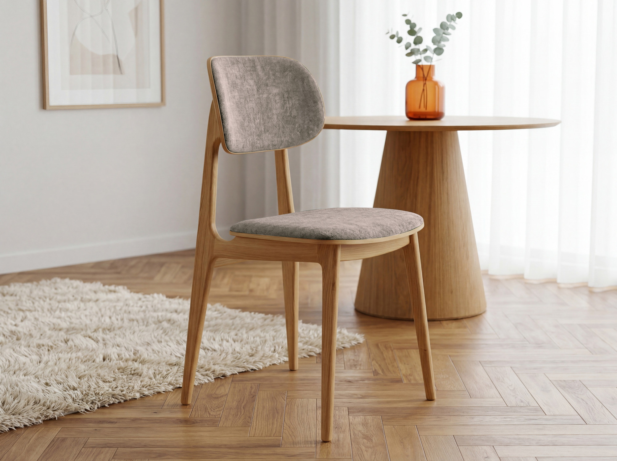 Der Esszimmerstuhl Vard ist eine elegante Wahl für alle, die einen hochwertigen gepolsterten Stuhl mit zeitlosem Design suchen. Die Konstruktion aus massivem Eichenholz verleiht dem Stuhl natürliche Schönheit und außergewöhnliche Widerstandsfähigkeit. Sitzfläche und Rückenlehne sind mit robustem Mistral-Stoff in grau-braunem Ton Taupe bezogen, der zu 100 % aus Polyester besteht und im Martindale-Test einen Wert von über 100.000 Zyklen erreicht. Dank der glatten, organisch geformten Linien passt dieser Stuhl hervorragend in moderne wie auch skandinavisch gestaltete Innenräume.