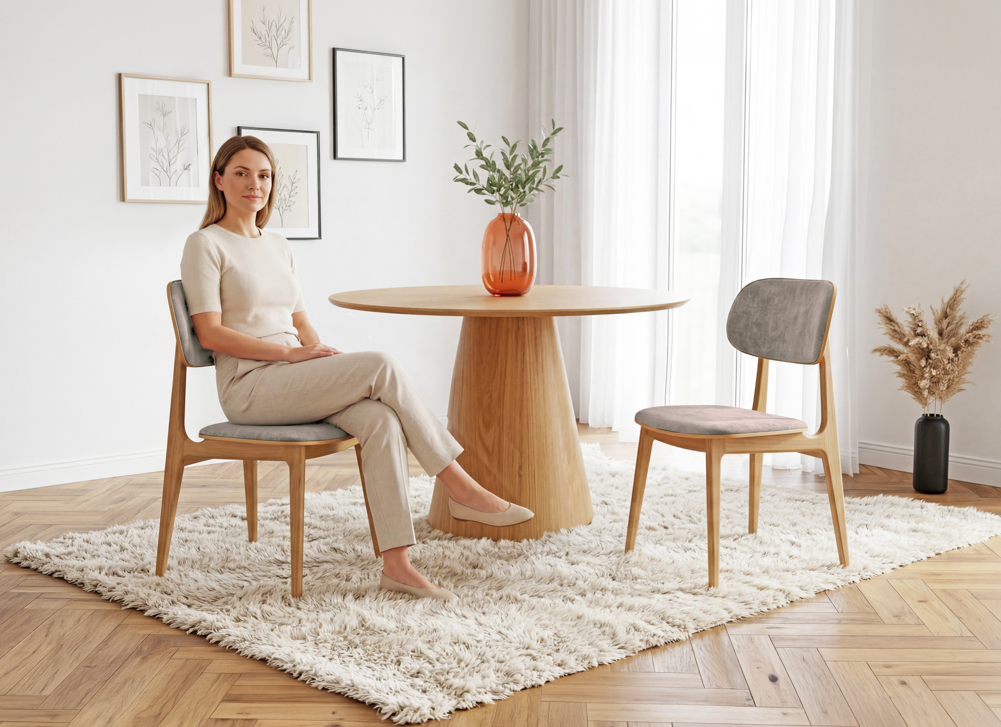 Ja, der Eichenstuhl Vard harmoniert hervorragend mit weiteren Eichenmöbeln – Esstischen, Kommoden und Regalen. Der grau-braune Ton Taupe ist vielseitig und lässt sich leicht mit verschiedenen Einrichtungsstilen kombinieren.