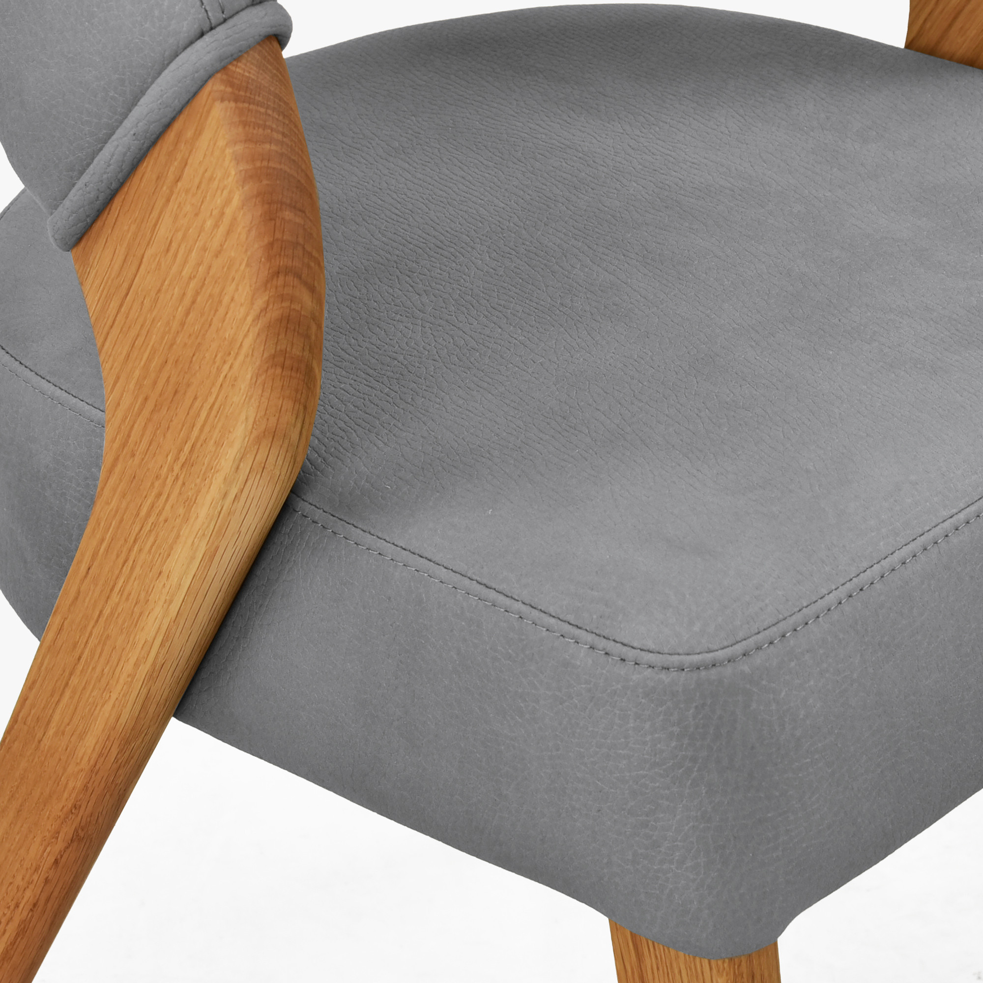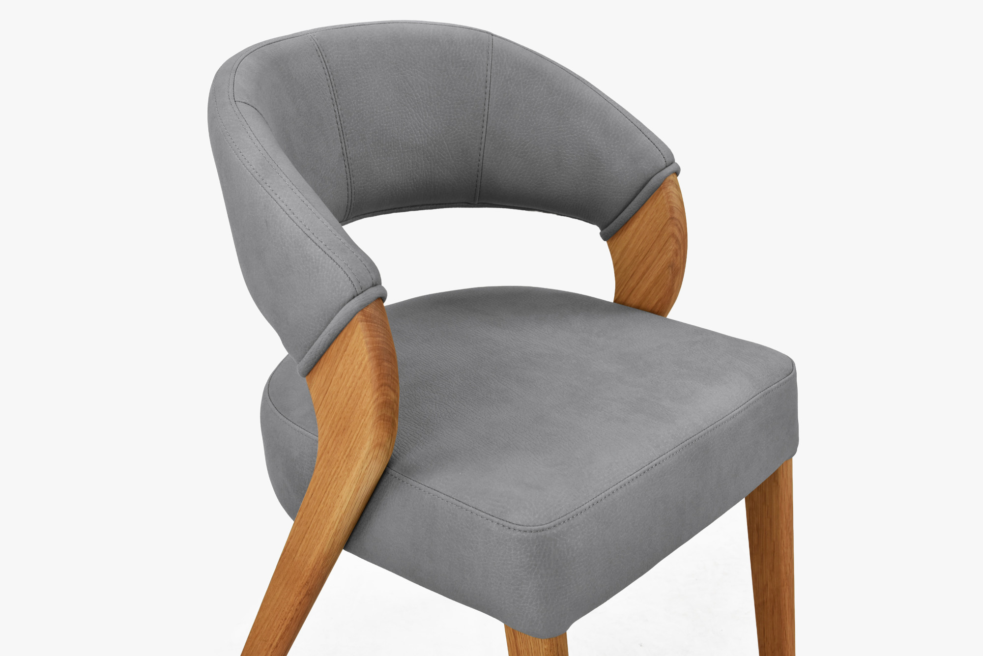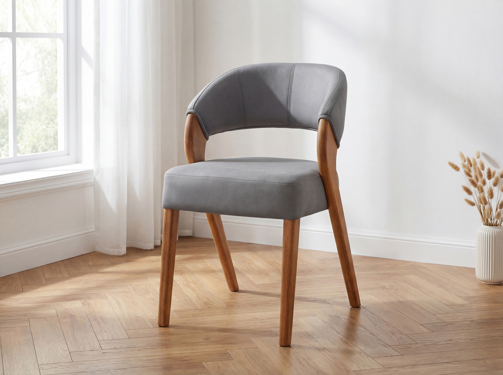 Wenn Sie einen Esszimmerstuhl suchen, der Luftigkeit und sanfte Eleganz in Ihr Interieur bringt, ist dieser Designstuhl mit Bezug aus widerstandsfähigem Texas-Stoff in hellgrauer Ausführung genau das Richtige. Die weichen Rundungen der Rückenlehne gehen fließend in den bequemen Sitz über und schaffen eine geschlossene Silhouette, die auf den ersten Blick beeindruckt. Massive Eichebeine, behandelt mit natürlichem Öl, verleihen dem Stuhl natürliche Wärme und bilden einen schönen Kontrast zum hellen Polster. Die ergonomische Form der Rückenlehne garantiert Ihnen bequemen Sitz auch bei langen Familienessen.