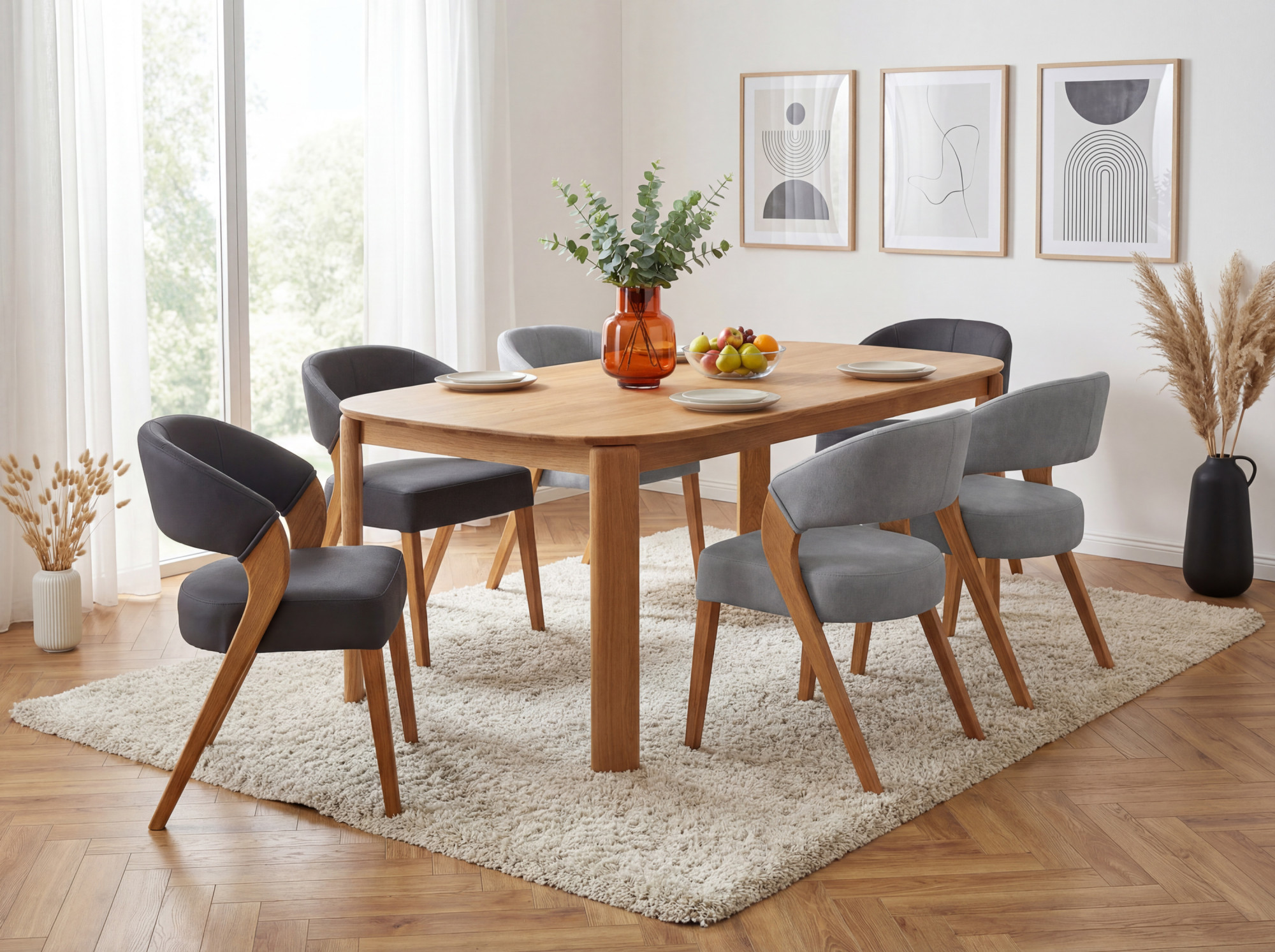 Der Bezugsstoff Texas aus 100 % Polyester mit einem Gewicht von 480 g/m² gehört zu den widerstandsfähigsten Polstermaterialien – im Martindale-Test erreicht er 60.000–70.000 Zyklen. Die Pilling-Beständigkeit entspricht Stufe 4 und die Farbbeständigkeit bei Trockenreiben wird mit der höchsten Stufe 5 bewertet. Die gesamte tragende Konstruktion besteht aus FSC-zertifiziertem massiven Eichenholz, was die Stabilität und eine umweltbewusste Herkunft des Materials garantiert. Der Stuhl wird komplett montiert geliefert – nach dem Auspacken stellen Sie ihn direkt an den Tisch.