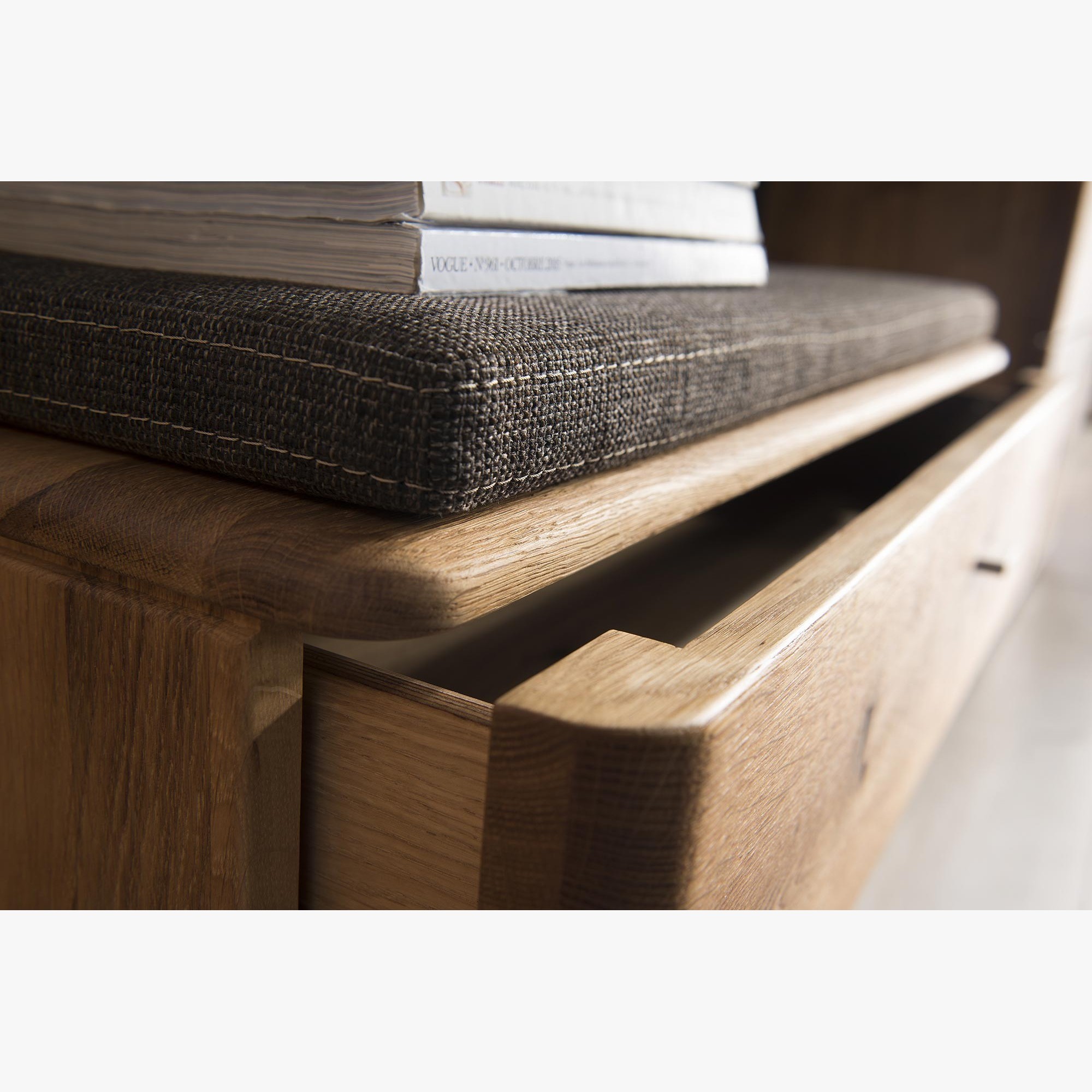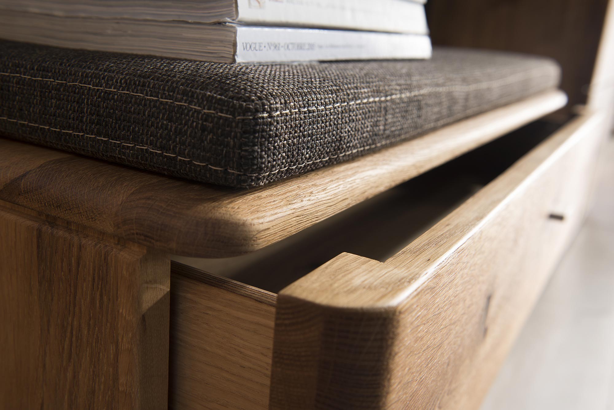 Flurbank aus der Kollektion Texas. Das Modell Typ 61 ist aus exklusivem Eichenholz gefertigt. Sie können Ihr Set nach Ihren Wünschen aus allen Teilen der Kollektion Texas zusammenstellen. Die Sitzbank hat auf der linken Seite oben eine Schublade hinter einer Tür. Die Beschläge sind mit Soft-Close-Verschluss. Ein bequemer Kissen gehört ebenfalls dazu. Die Möbel sind mit hochwertigem, deutschem Livos-Öl behandelt, das umweltfreundlich ist.