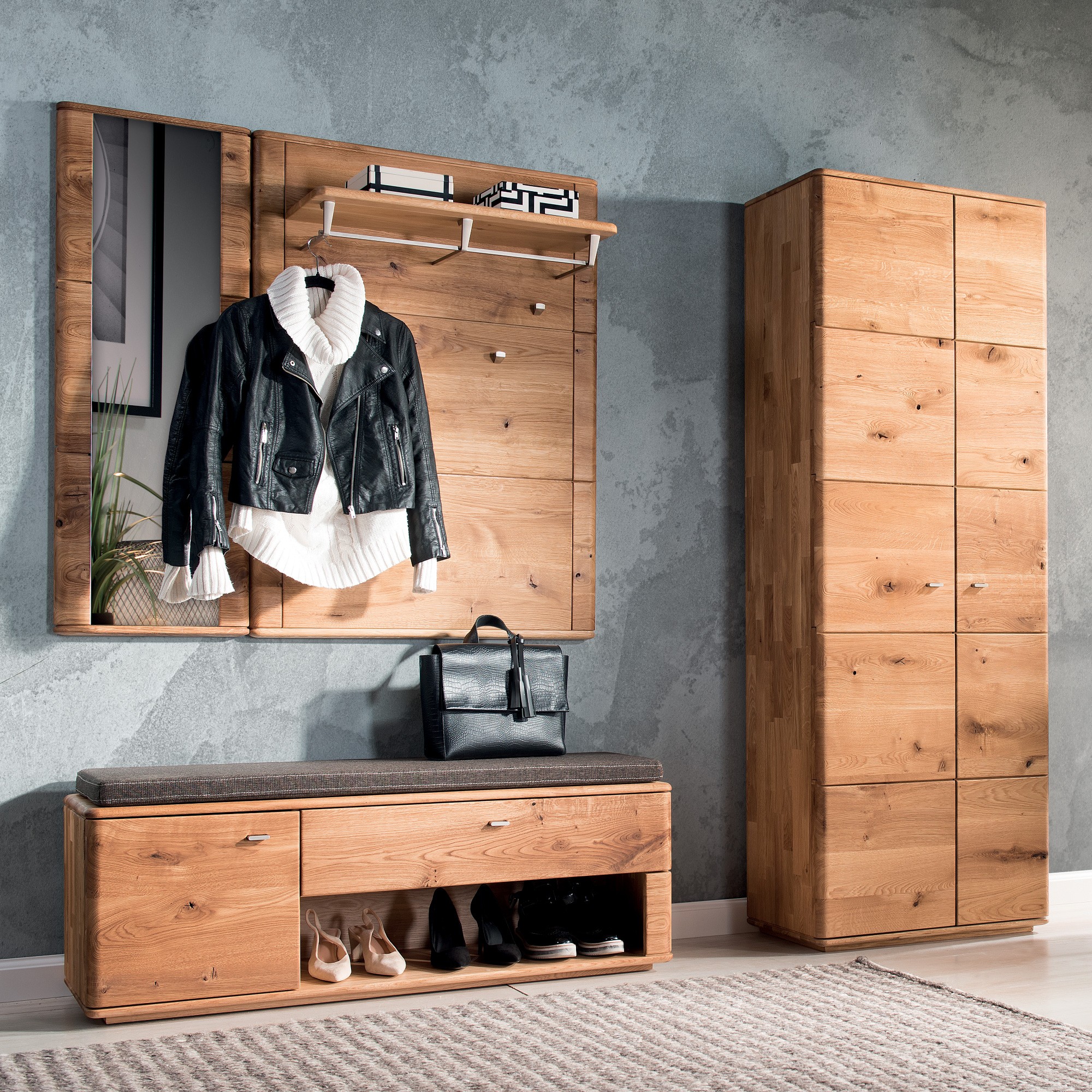 Exklusive Flurmöbel aus massivem Eichenholz. Die Kollektion Texas steht für luxuriöse Möbel für anspruchsvolle Kunden. Die Möbel sind aus natürlichem Eichenholz gefertigt. Sie können sich auch ein eigenes Flurset zusammenstellen. Die Möbel werden bereits montiert geliefert. Alle Türen und Schubladen sind mit Soft-Close-Verschlüssen ausgestattet.