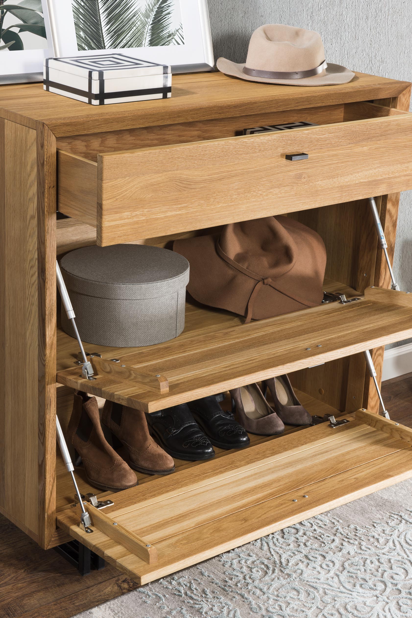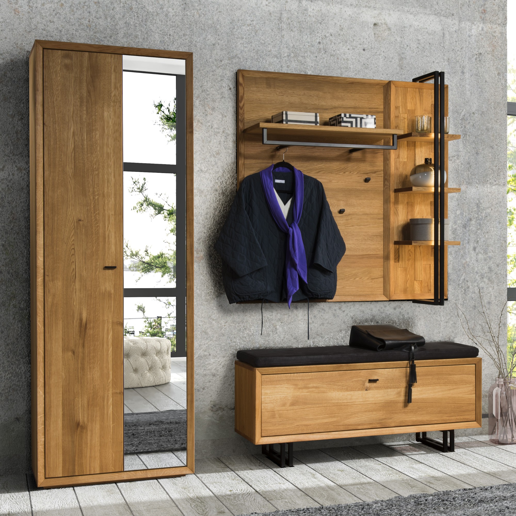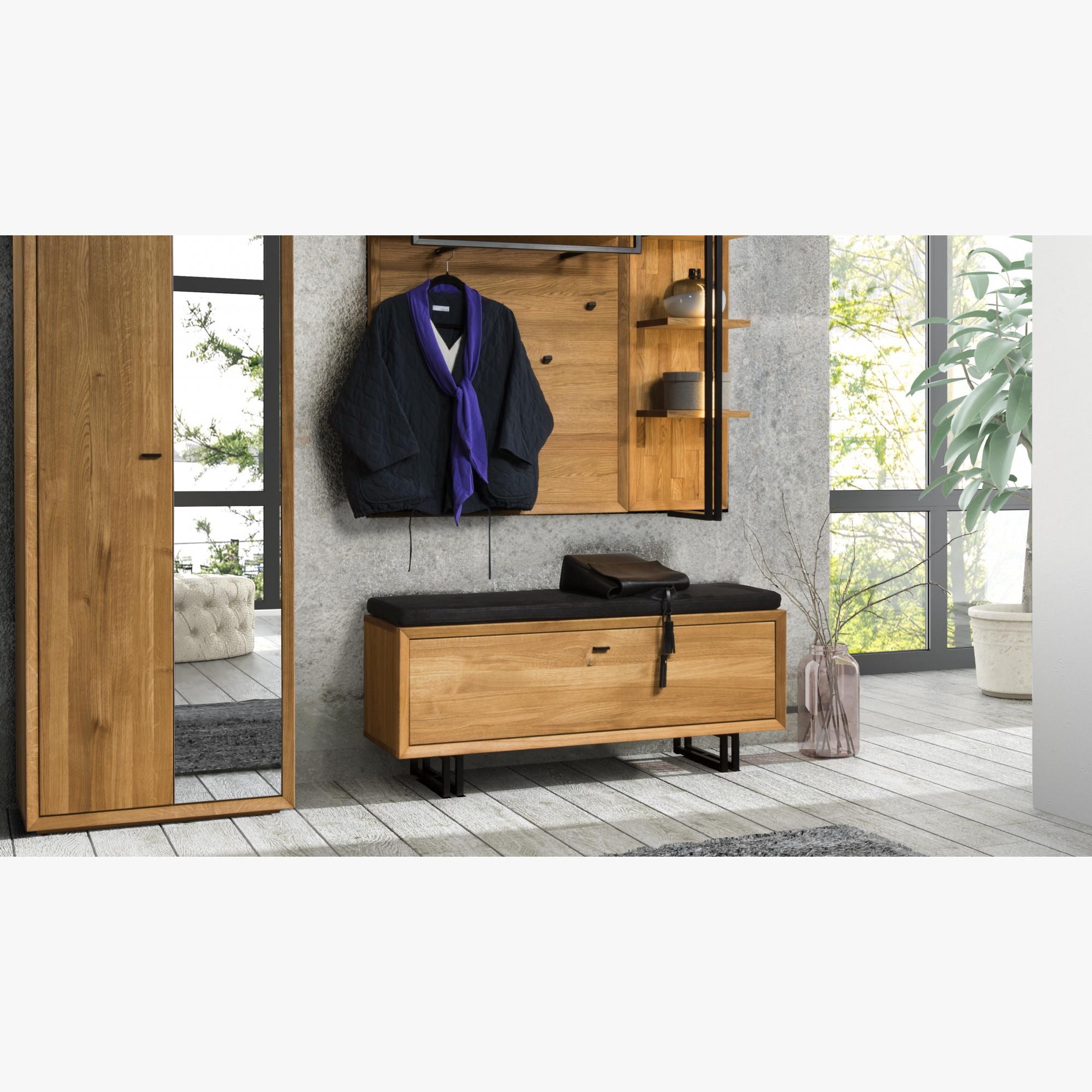 Luxuriöse Garderobenmöbel aus Eichenholz in Kombination mit natürlichem Eichenfurnier. Das Set enthält einen wunderschönen Schuhschrank Vilo mit viel Platz für Ihre Schuhe. Schuhschrank auf Füßen, der auch zum Anziehen geeignet ist. Im Set ist außerdem ein zweitüriger Schrank inklusive Spiegel enthalten. Und eine Kombination aus Wandpaneelen und Wandregalen. Wirklich exklusiv und designorientiert, das sind die Hauptmerkmale der Eichenmöbel der Kollektion 2020 mit dem Namen VILO. Die Eichenmöbel Vilo sind vor allem für den Flur bestimmt, wo sie in Form von Garderobenwänden und Schuhschränken eingesetzt werden.