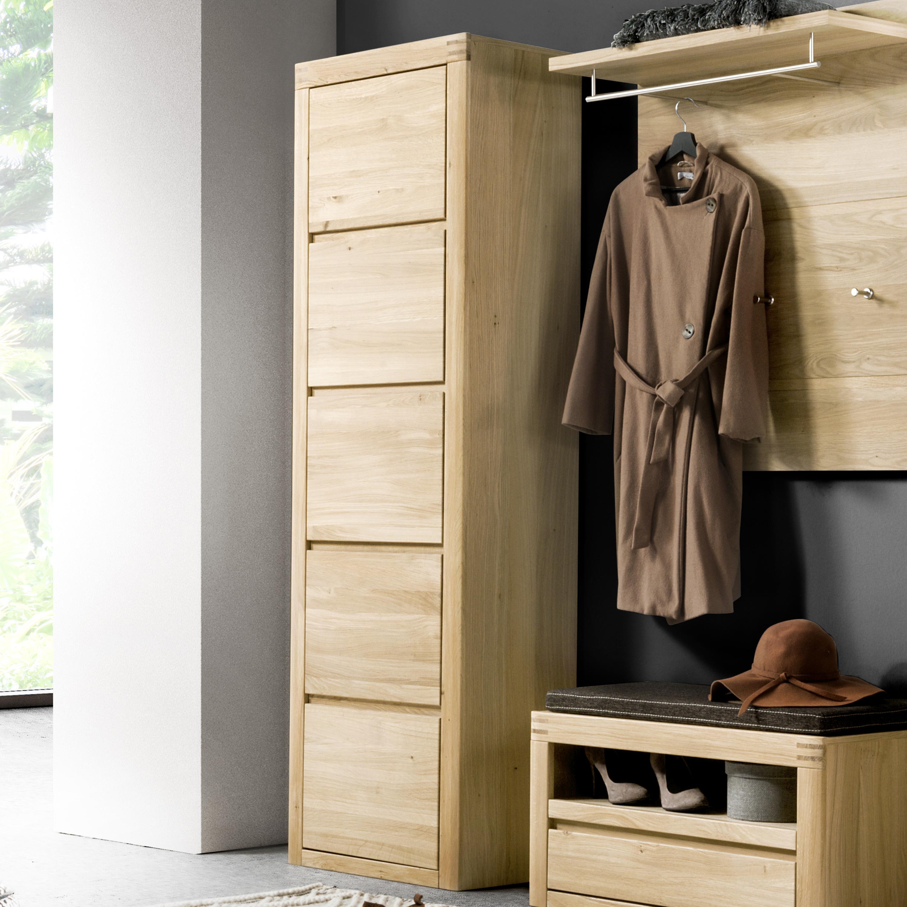 Garderobenmöbel für den Flur gefertigt aus Eichenholz in Kombination mit natürlicher Eichenfurnier. Das Design des hellfarbigen Eichenholzes zieht sicher auf den ersten Blick Aufmerksamkeit auf sich. Die natürliche Holzstruktur und das naturbelassene Holz schaffen sofort beim Betreten Ihres Zuhauses eine einzigartige Atmosphäre. Die Anlage besteht aus 5 Elementen, alle Möbelteile, die montiert werden können, werden bereits zusammengesetzt geliefert.