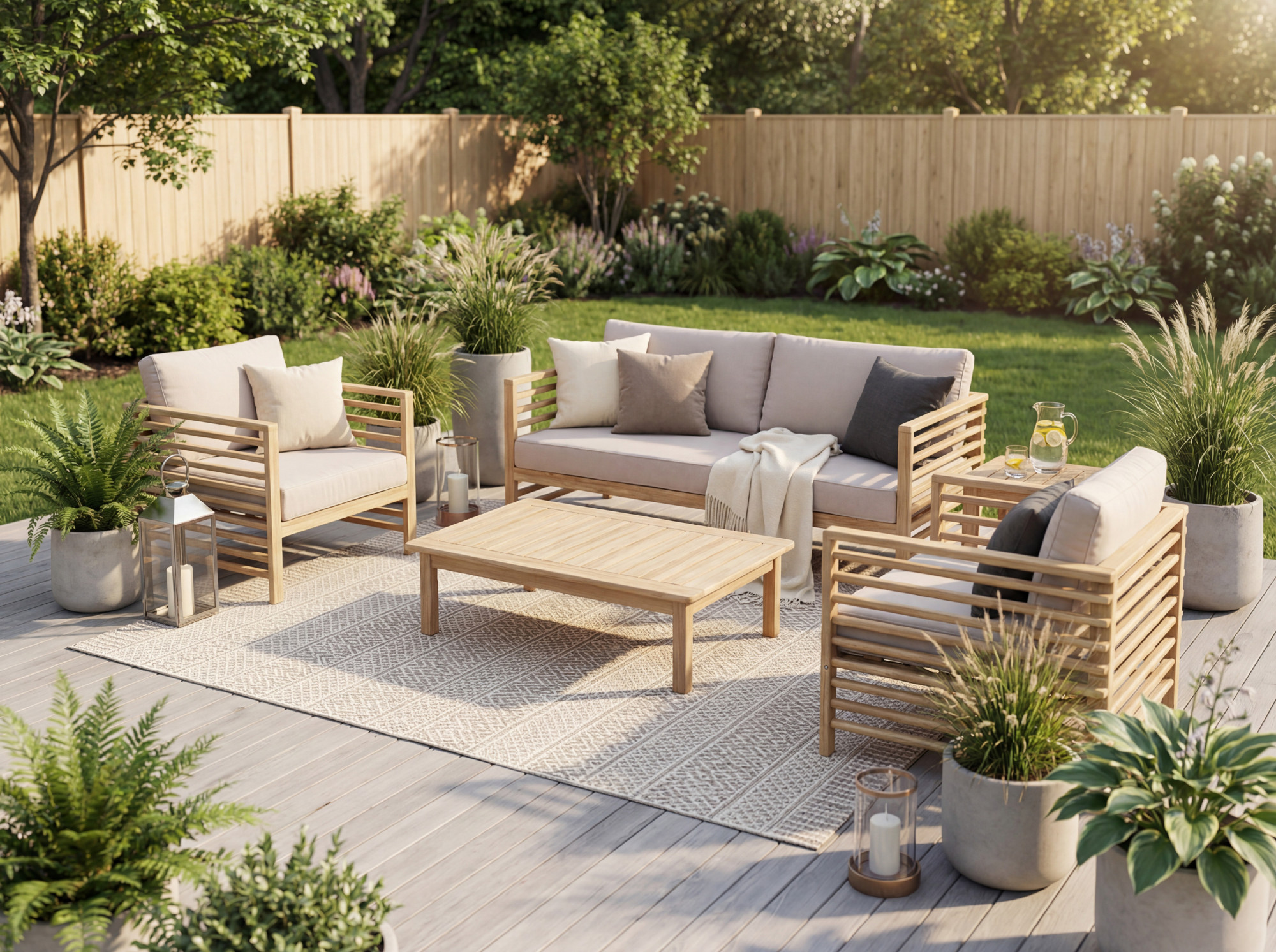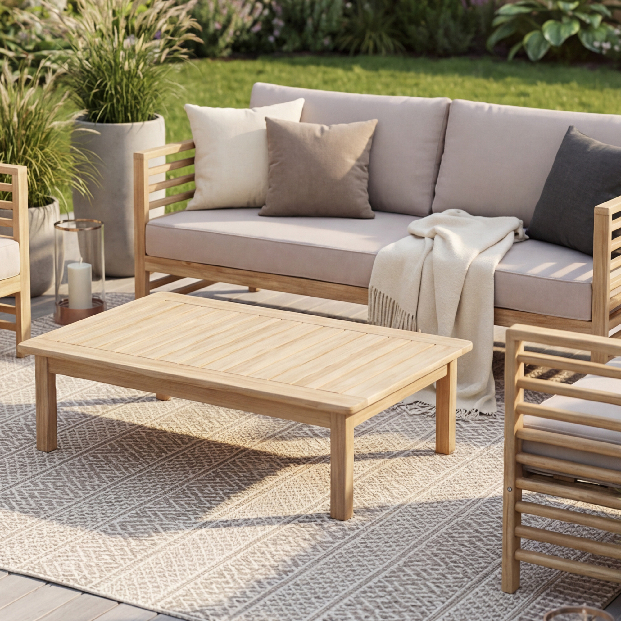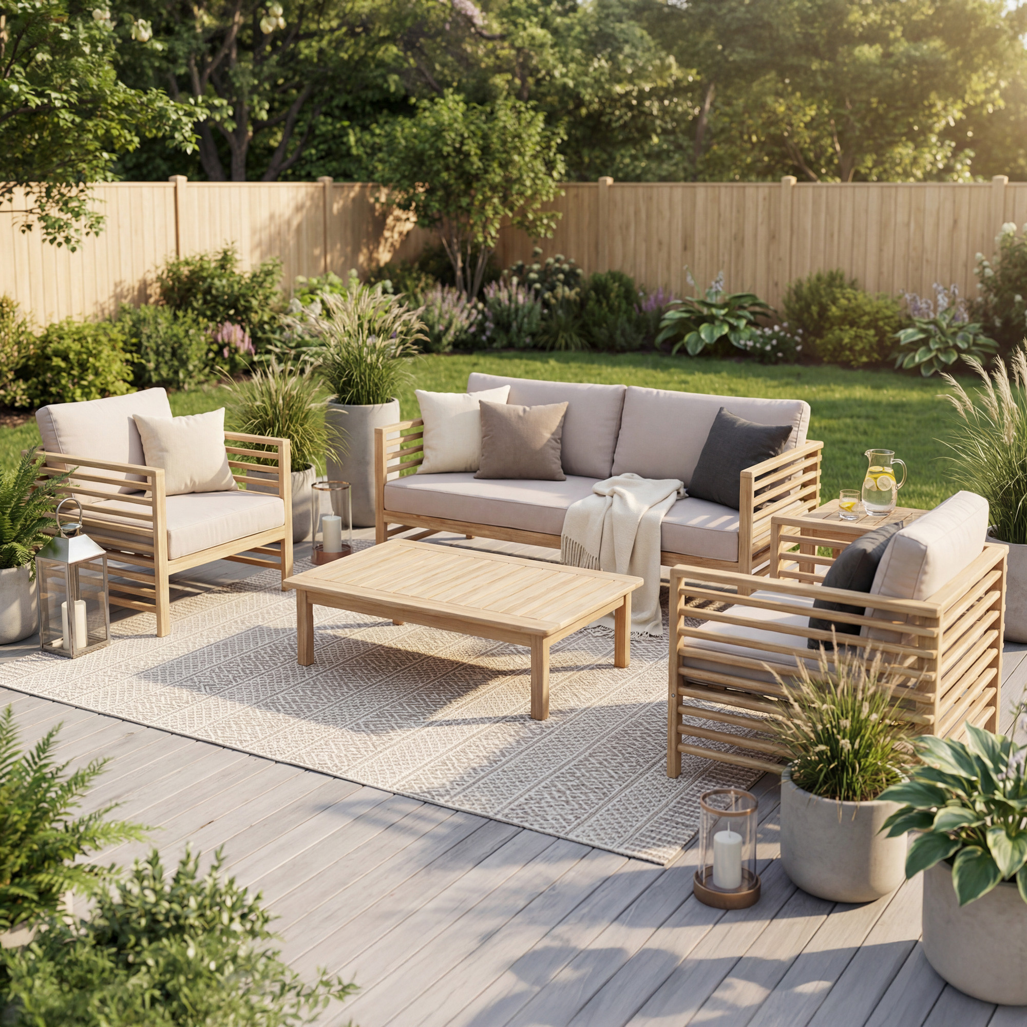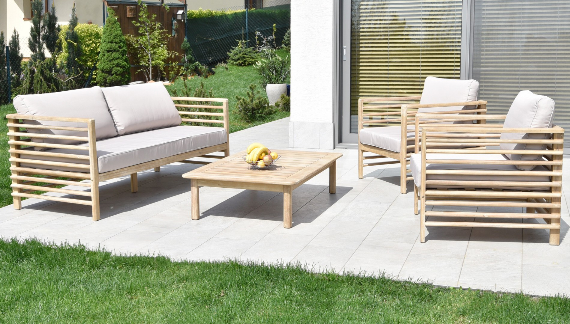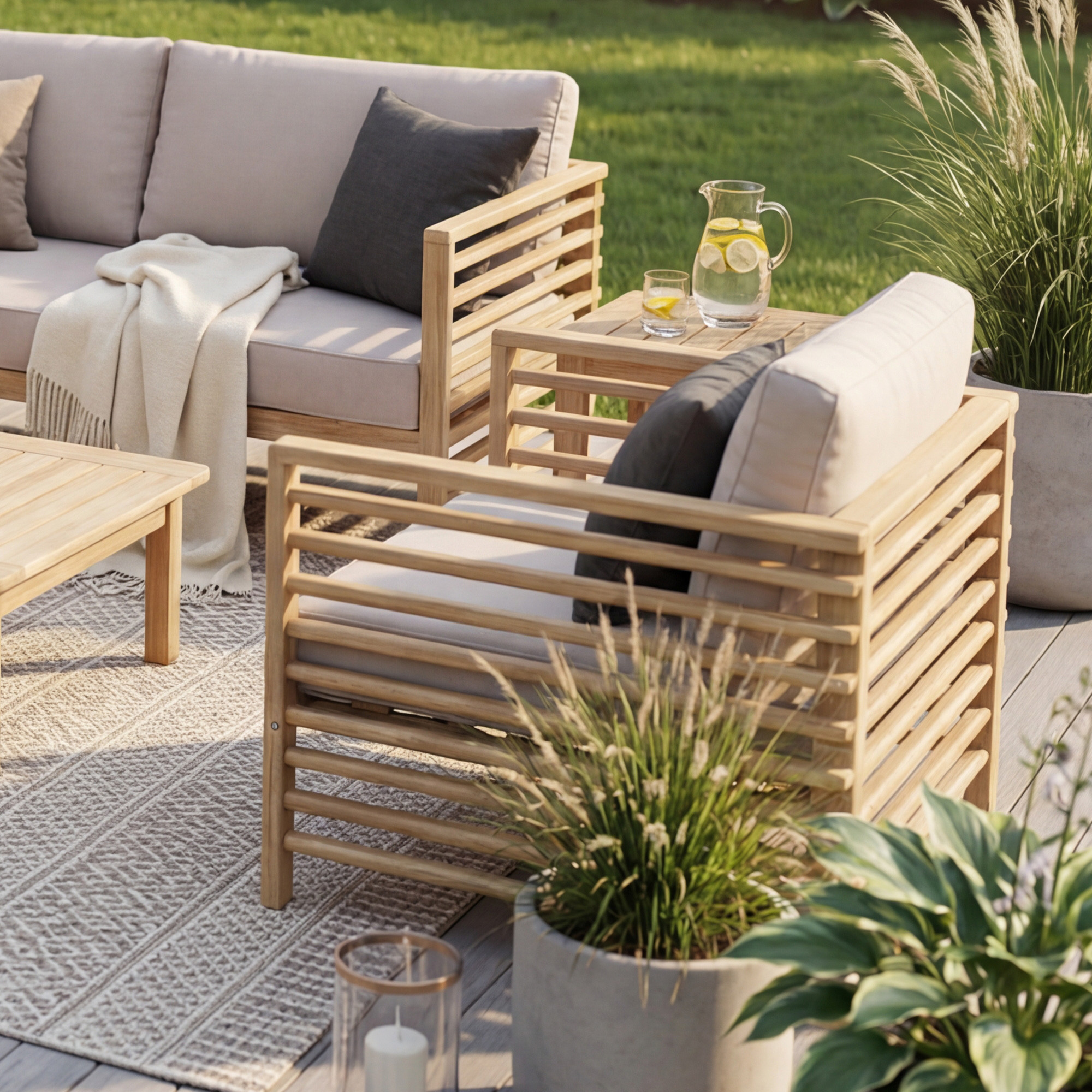 Wir präsentieren Ihnen unsere neue Gartengarnitur, die ein Symbol für Luxus, Komfort und unerwartet hohen Qualitätsstandard ist – ideal für Ihre Sommer- tage und -abende in der Natur. Diese Gartengarnitur ist handwerklich aus ausgewähltem Akazienholz in hellen, warmen Farbtönen gefertigt, die sanft mit der natürlichen Umgebung Ihres Gartens harmonieren. Mit modernem und minimalistischem Design wird diese Garnitur zum Mittelpunkt Ihrer Außenbereiche.