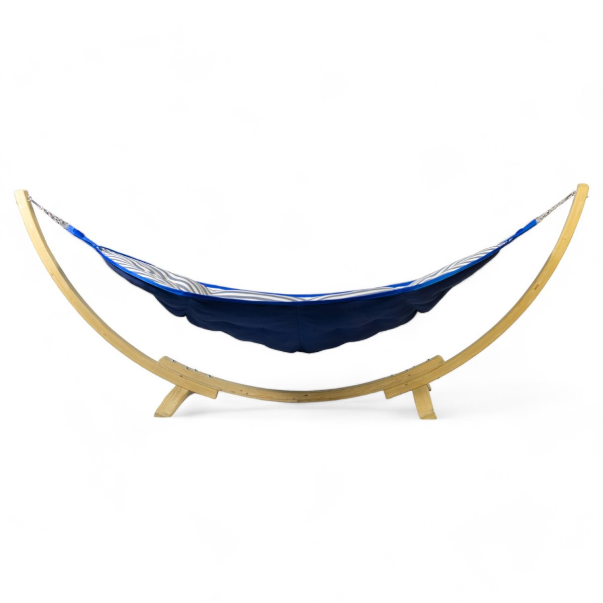 Gartenhängematte mit Holzrahmen und Netz in blauen Farbtönen