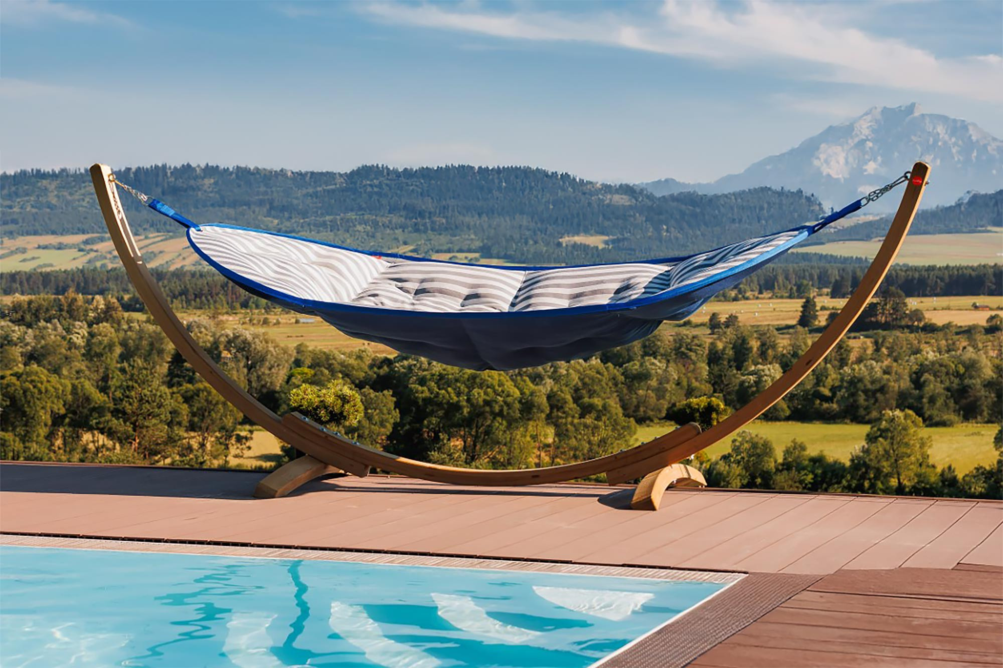 Wünschen Sie sich eine zuverlässige und geräumige Hängematte, die Ihnen einen komfortablen Platz zum Entspannen im Garten, auf der Terrasse oder am Pool bietet? Diese große Hängematte mit blauem Tuch ist so konzipiert, dass sie die Ansprüche auch der anspruchsvollsten Nutzer erfüllt. Dank hochwertigem Gewebe aus 100% Olefin (mit antibakterieller Ausrüstung und Cleanaboo-Technologie) können Sie sich auf ihre außergewöhnliche Beständigkeit gegen Meer- und Poolwasser verlassen, sodass die Hängematte auch bei ungünstigen Wetterbedingungen oder feuchter Umgebung nichts von ihrer Qualität verliert. Das Material ist zugleich flammhemmend, was zu Ihrer Sicherheit und der langen Lebensdauer des Produkts beiträgt. Dank der geräumigen Maße (Gesamtlänge 3357 cm, Liegelänge 260 cm, Breite 135 cm) bietet sie genügend Platz nicht nur für eine bequeme Entspannung einer Person, sondern auch zum Teilen des Wohlgefühls zu zweit. Die Hängematte mit maximaler Traglast von 150 kg überzeugt durch Stabilität. Die präzise Verarbeitung ist ein weiterer Grund, gerade diesem einzigartigen Stück den Vorzug zu geben. Sie passt hervorragend zum Breve-Ständer, mit dem sie ein vollwertiges Entspannungssystem bildet. Gönnen Sie sich Momente ungestörter Erholung an der frischen Luft oder im Innenbereich – die blaue Variante des Tuchs fügt sich zudem ideal in eine breite Palette von Stilrichtungen und Farbabstimmungen der Umgebung ein.