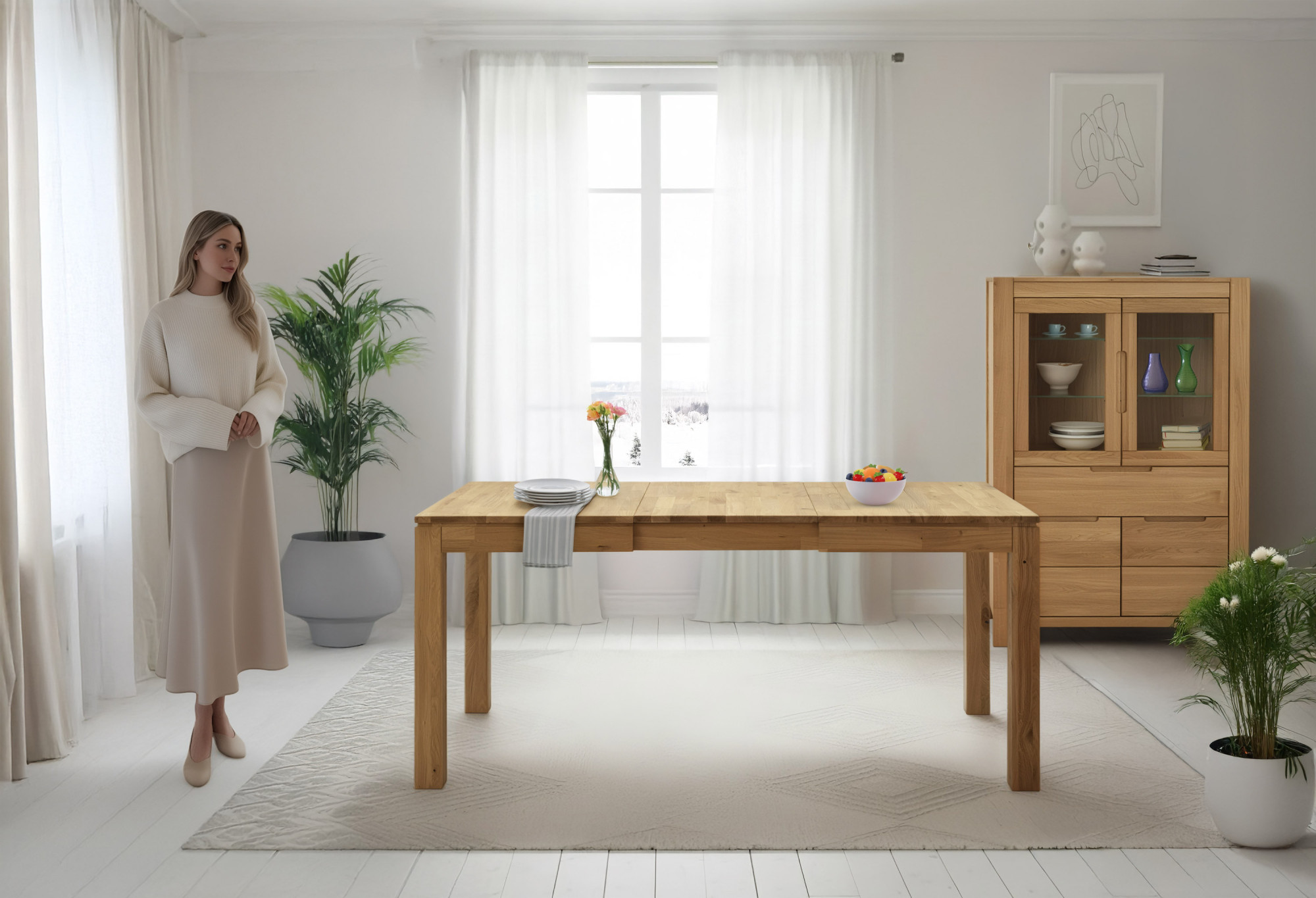 *auf dem Bild ausziehbarer Tisch Matus 120 XL, der auch einzeln erhältlich ist, an der Rückwand zweitürige Vitrine Oslo.
