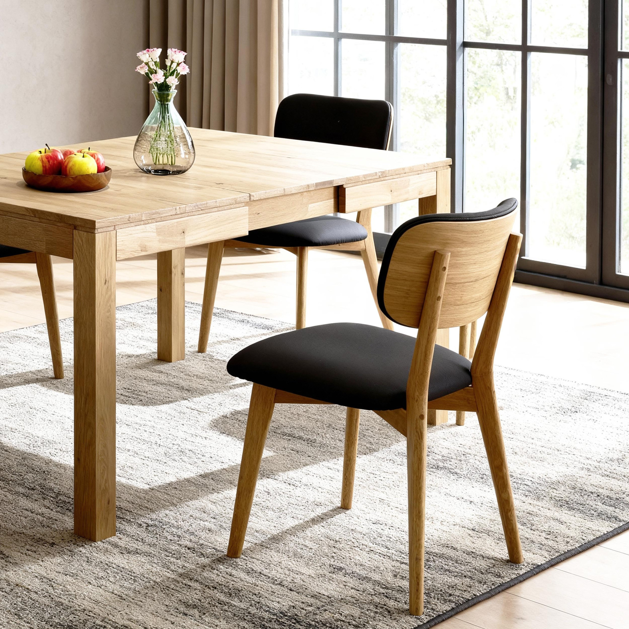 Set aus ausziehbarem Esstisch Eiche 120 x 80 und 4 Ledersesseln in schwarzer Farbe