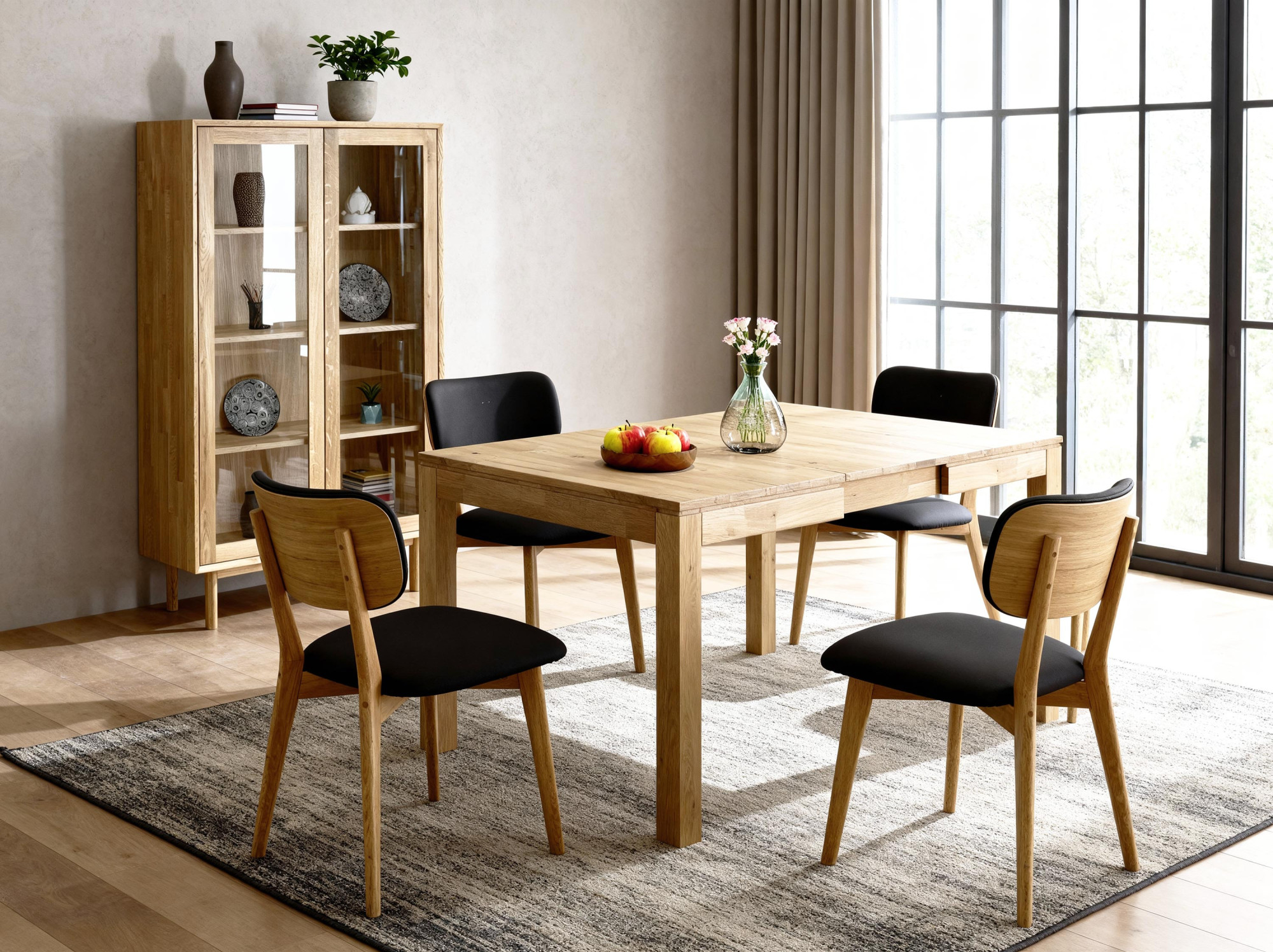 Zum Set gehören auch vier stilvolle Esszimmerstühle aus massivem Eichenholz, die perfekt zum Tisch passen. Sitzfläche und Rückenlehne sind mit echtem italienischem Leder in elegantem Schwarz gepolstert, was dem gesamten Set ein luxuriöses Aussehen und hohen Sitzkomfort verleiht. Die natürliche Ölbehandlung sorgt für Widerstandsfähigkeit gegen Beschädigungen und bewahrt die natürliche Holzstruktur. Ein weiterer Vorteil ist die Möglichkeit, das Set mit weiteren Eichenmöbeln zu kombinieren und so ein harmonisches Interieur zu schaffen. Das verwendete Holz ist FSC-zertifiziert, was eine umweltbewusste Holzwirtschaft und Nachhaltigkeit garantiert. Dieses Set ist somit nicht nur praktisch, sondern auch ein Design-Highlight in Ihrem Zuhause.