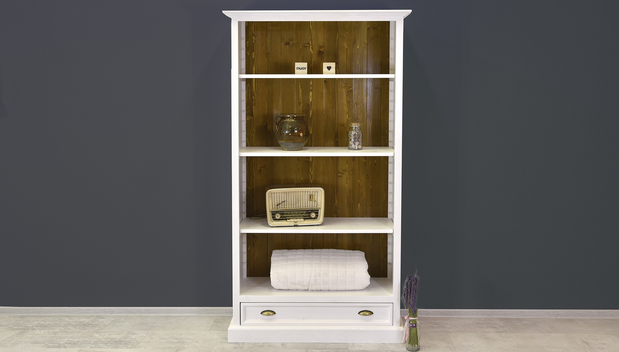 Holzregal im Provence-Stil ist ein stilvolles und praktisches Möbelstück, das den Charme der französischen Provinz in Ihr Interieur bringt. Es ist aus 100% massivem Kiefernholz gefertigt, was Stabilität, Festigkeit und Langlebigkeit garantiert. Die weißen Teile des Regals sind mit umweltfreundlicher und schadstofffreier Farbe lackiert, während die braunen Flächen mit hochwertigem Lack behandelt sind, der die Oberfläche schützt und zugleich die natürliche Maserung des Holzes betont. Das Regal ist mit drei höhenverstellbaren Einlegeböden ausgestattet, sodass Sie es einfach an Ihre Bedürfnisse anpassen können. Es wird komplett montiert geliefert und ist sofort einsatzbereit.