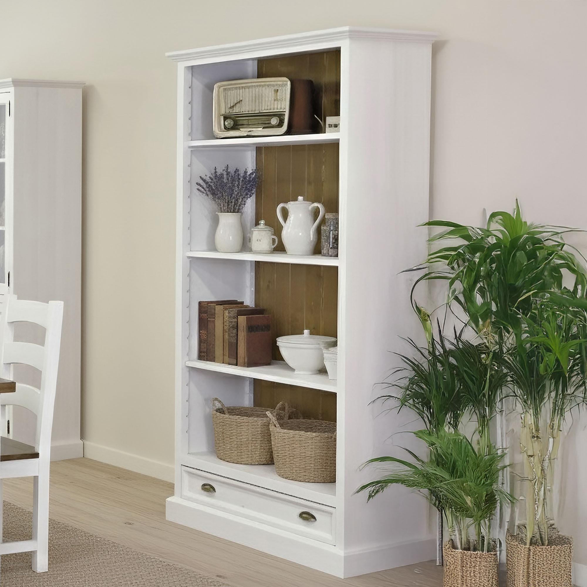 Die Kollektion Provence, zu der auch dieses Regal gehört, wurde mit Fokus auf Eleganz, Praktikabilität und zeitloses Design entworfen. Die Oberflächenbehandlung kombiniert Wachsen und Lackieren, um eine lange Lebensdauer zu gewährleisten und gleichzeitig die natürliche Schönheit des Kiefernholzes hervorzuheben. Dank der universellen weiß-braunen Farbgebung lässt es sich leicht mit anderen Möbeln der Provence-Kollektion kombinieren. Selbstverständlich verfügt es auch über ein FSC-Holz-Zertifikat, das bestätigt, dass das verwendete Material aus verantwortungsvollen und ökologischen Quellen stammt. Dieses Regal ist die ideale Wahl für alle, die eine praktische Lösung im eleganten rustikalen Stil suchen.