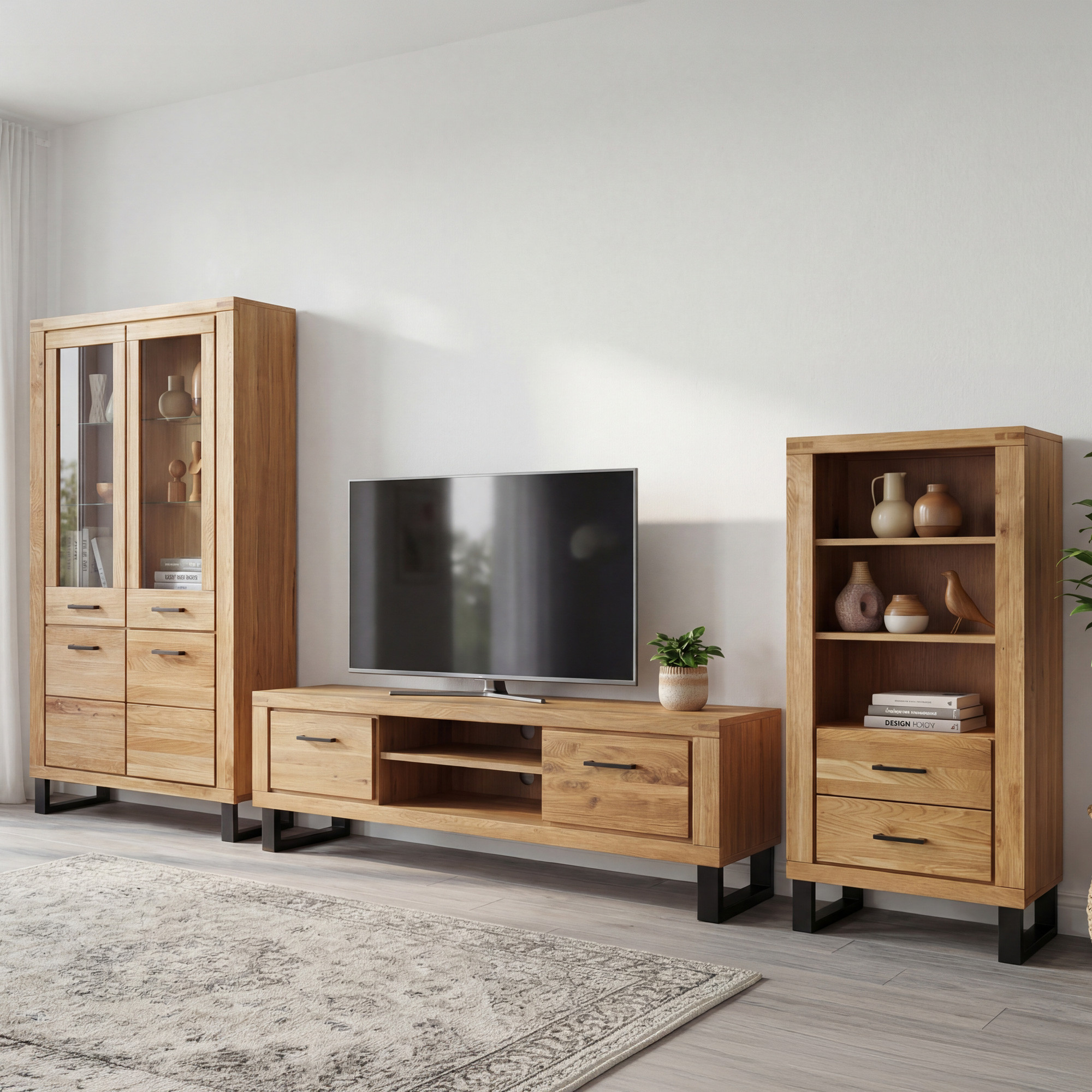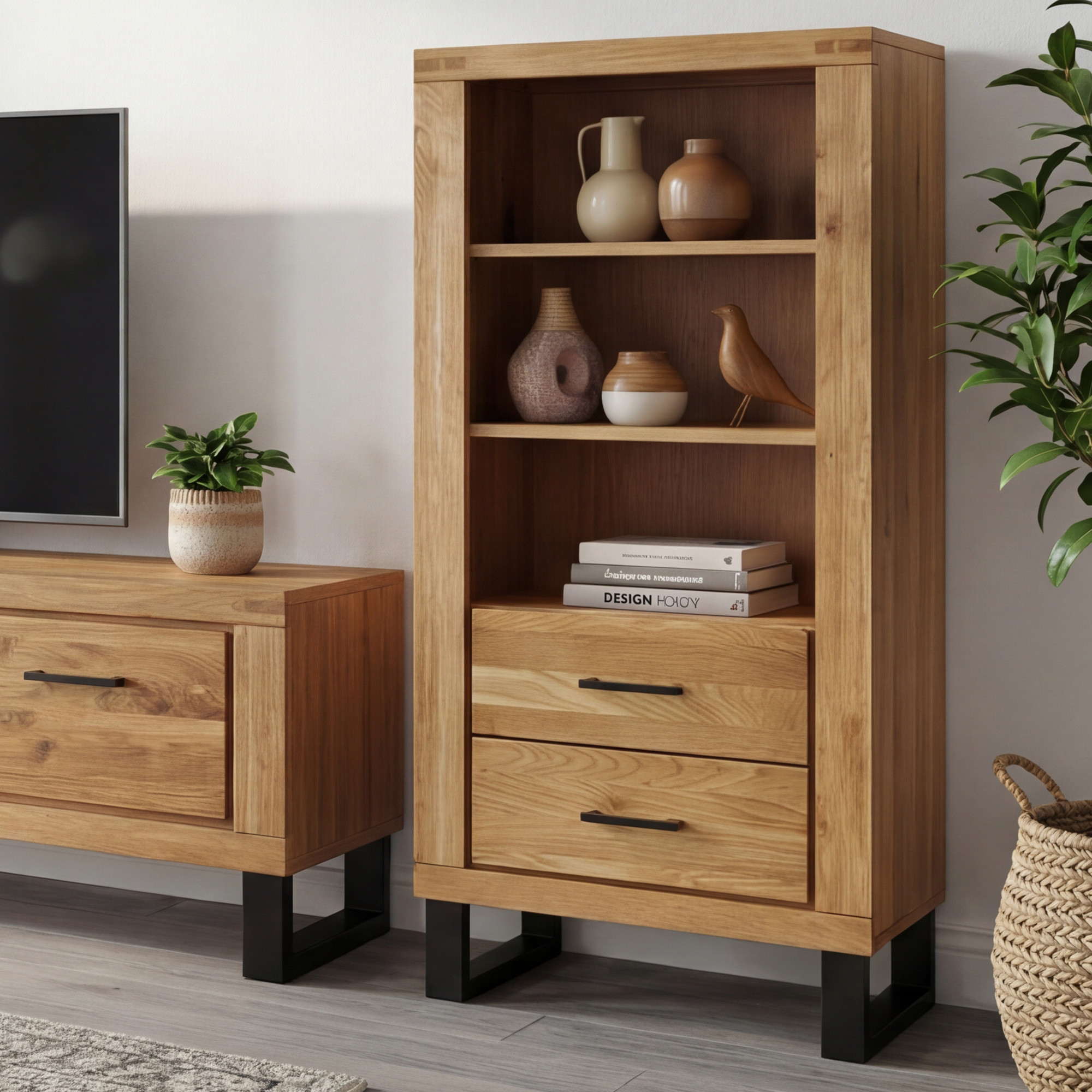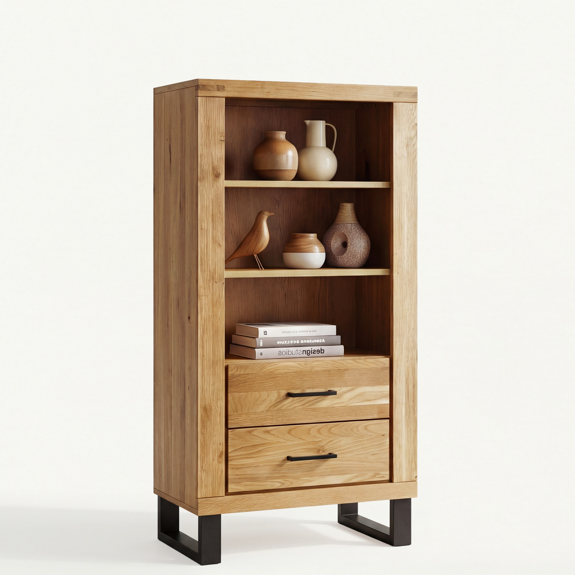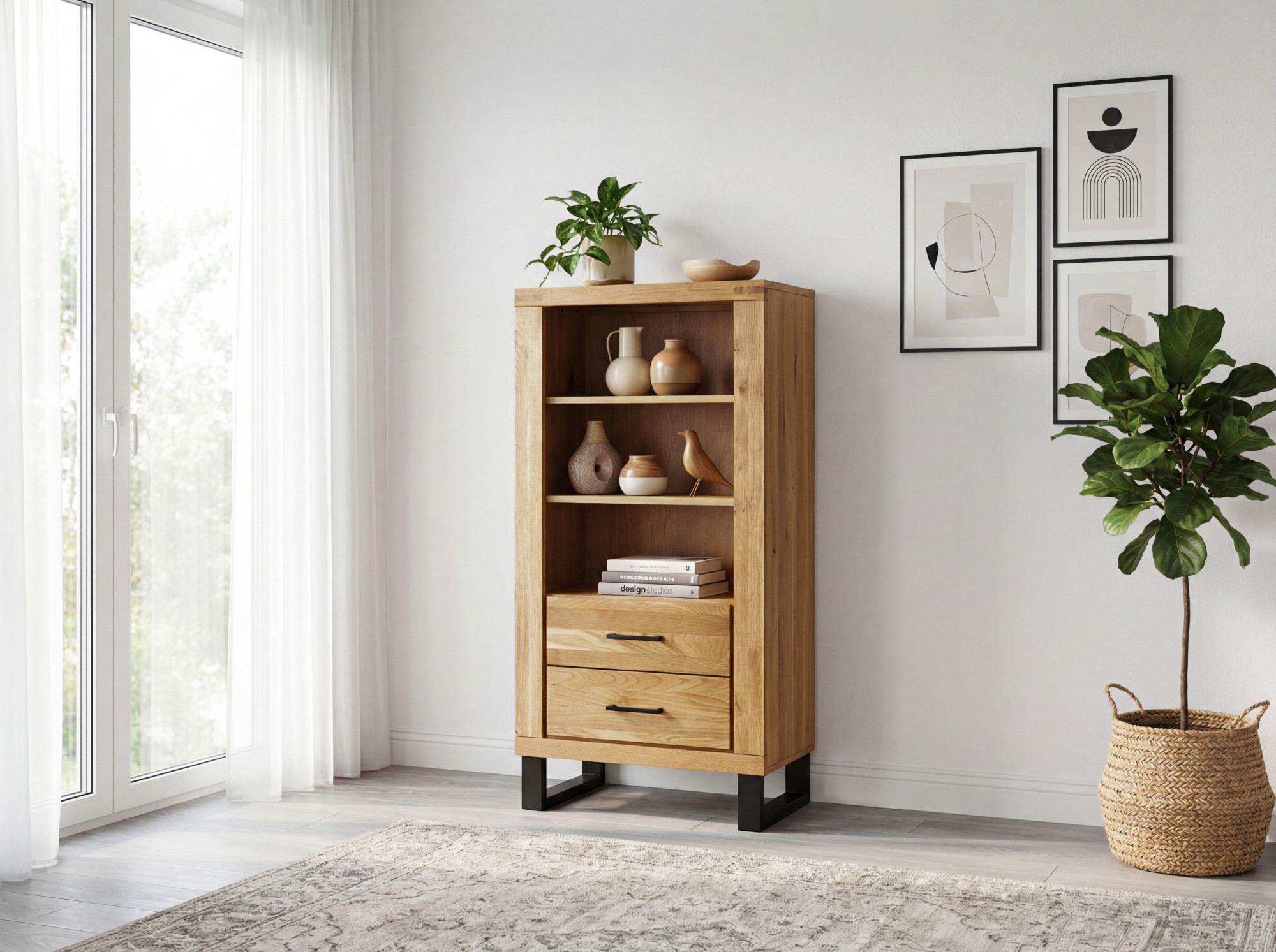 Suchen Sie ein praktisches Regal, das modernes Design mit ausreichend Stauraum verbindet? Wir stellen Ihnen das auf einer eleganten Metall-Designkonstruktion vor, das die Zierde Ihres Interieurs wird. Das Regal ist für Liebhaber minimalistischer Innenräume entworfen, die das natürliche und klare Aussehen von Holz schätzen. Die Vorderseite besteht aus massivem Eichenholz, das mit natürlichem Öl behandelt wurde, welches die Holzmaserung hervorhebt und dem Möbelstück einen authentischen Charakter verleiht. Das Regal bietet zwei offene Fächer zur Präsentation von Dekorationen und Büchern, Türen mit verstecktem Stauraum sowie drei praktische Schubladen mit Soft-Close-System für ein leises und sanftes Schließen.