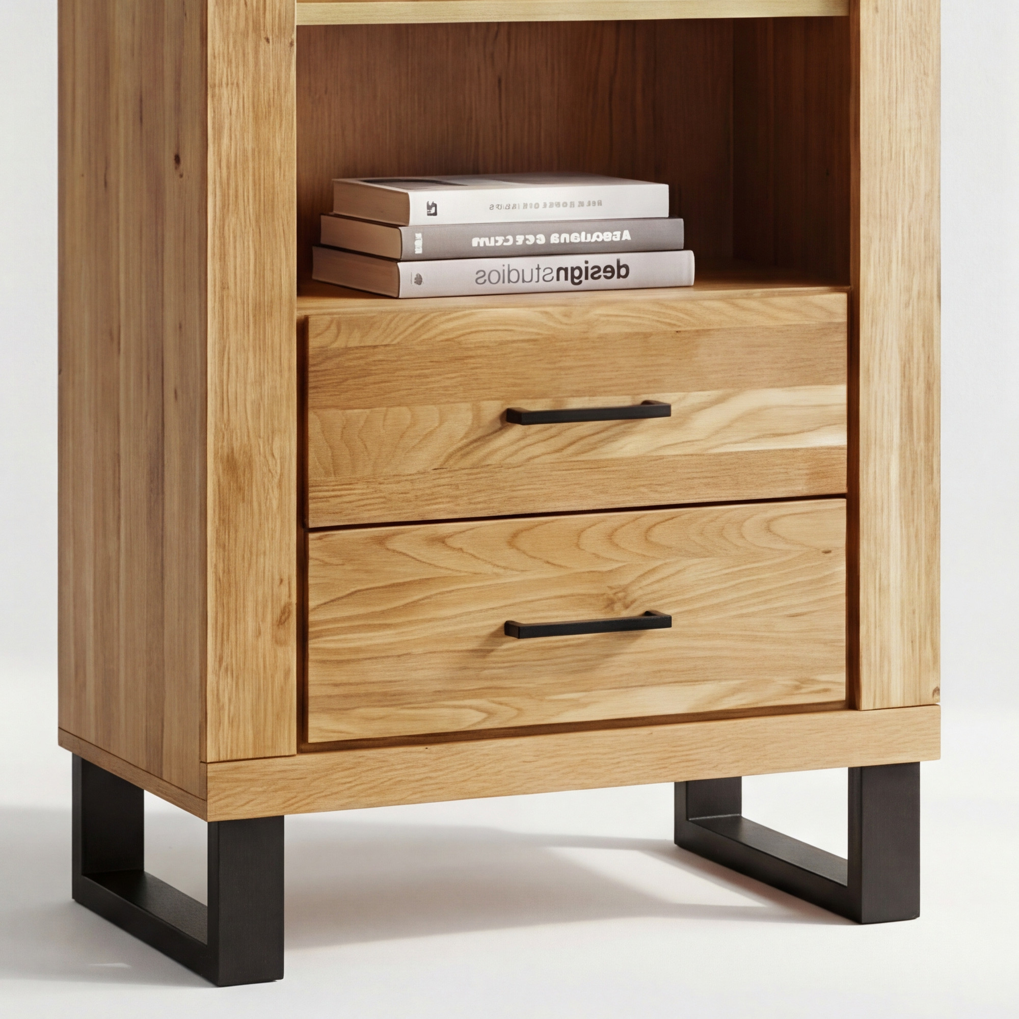 Niedriges Eichenregal mit Metallbeinen und Schubladen
