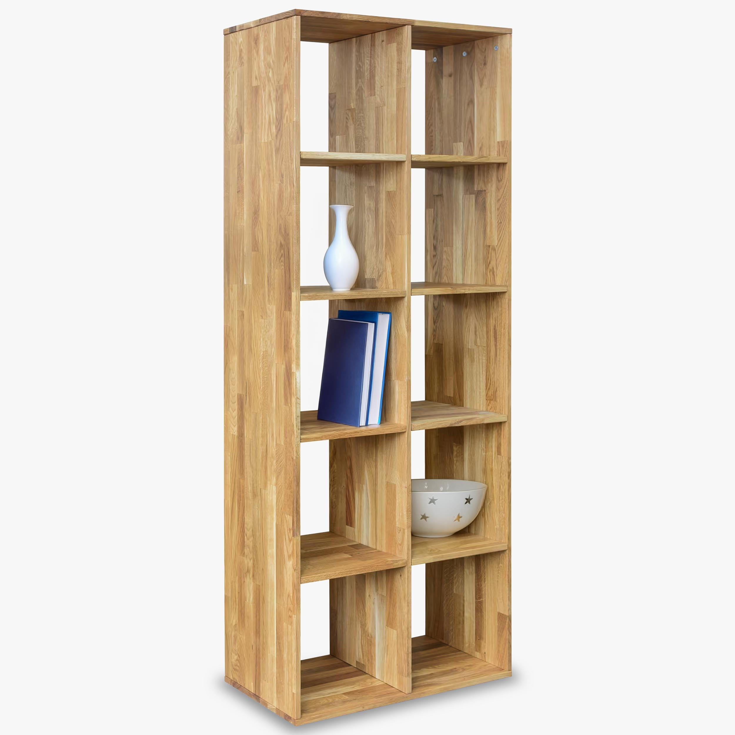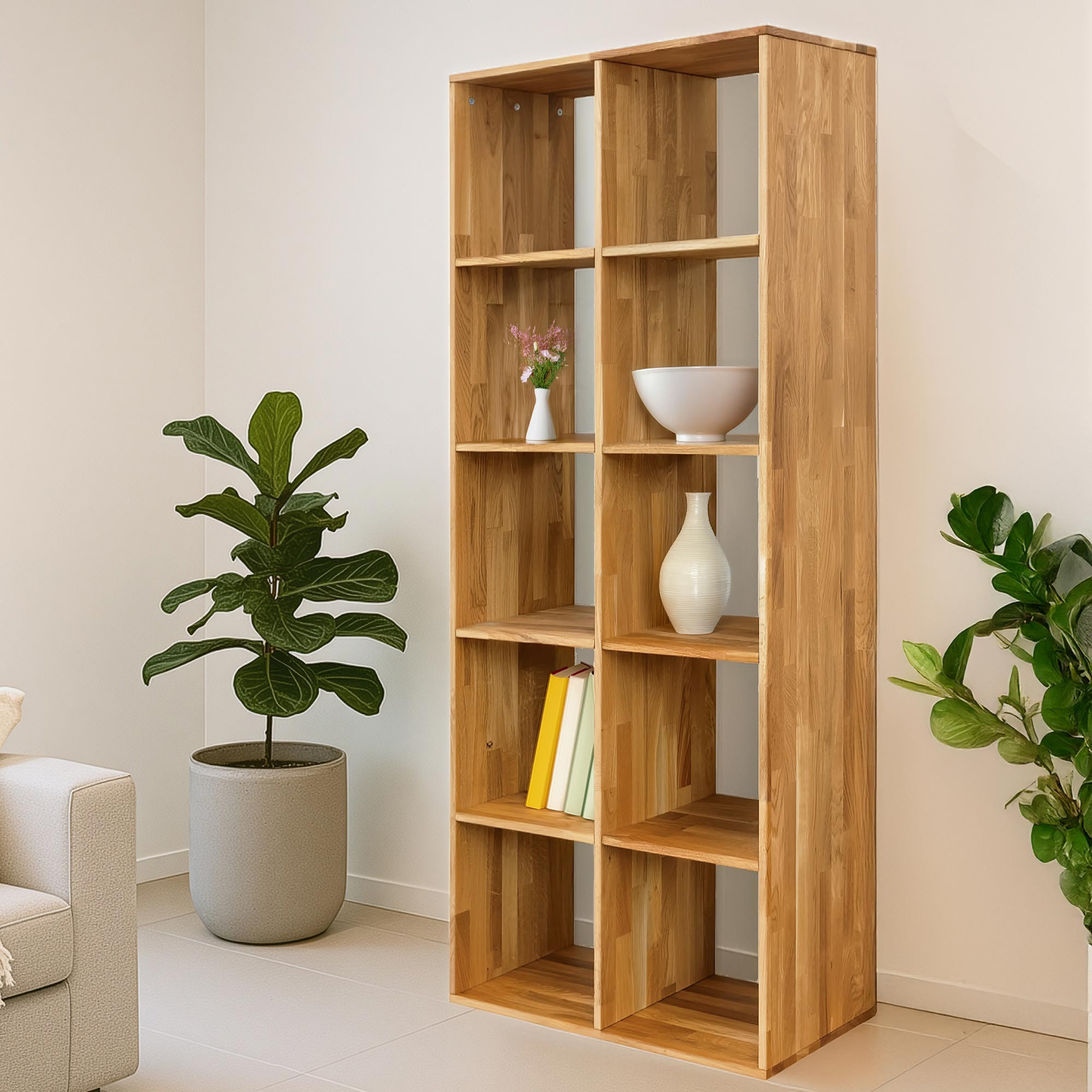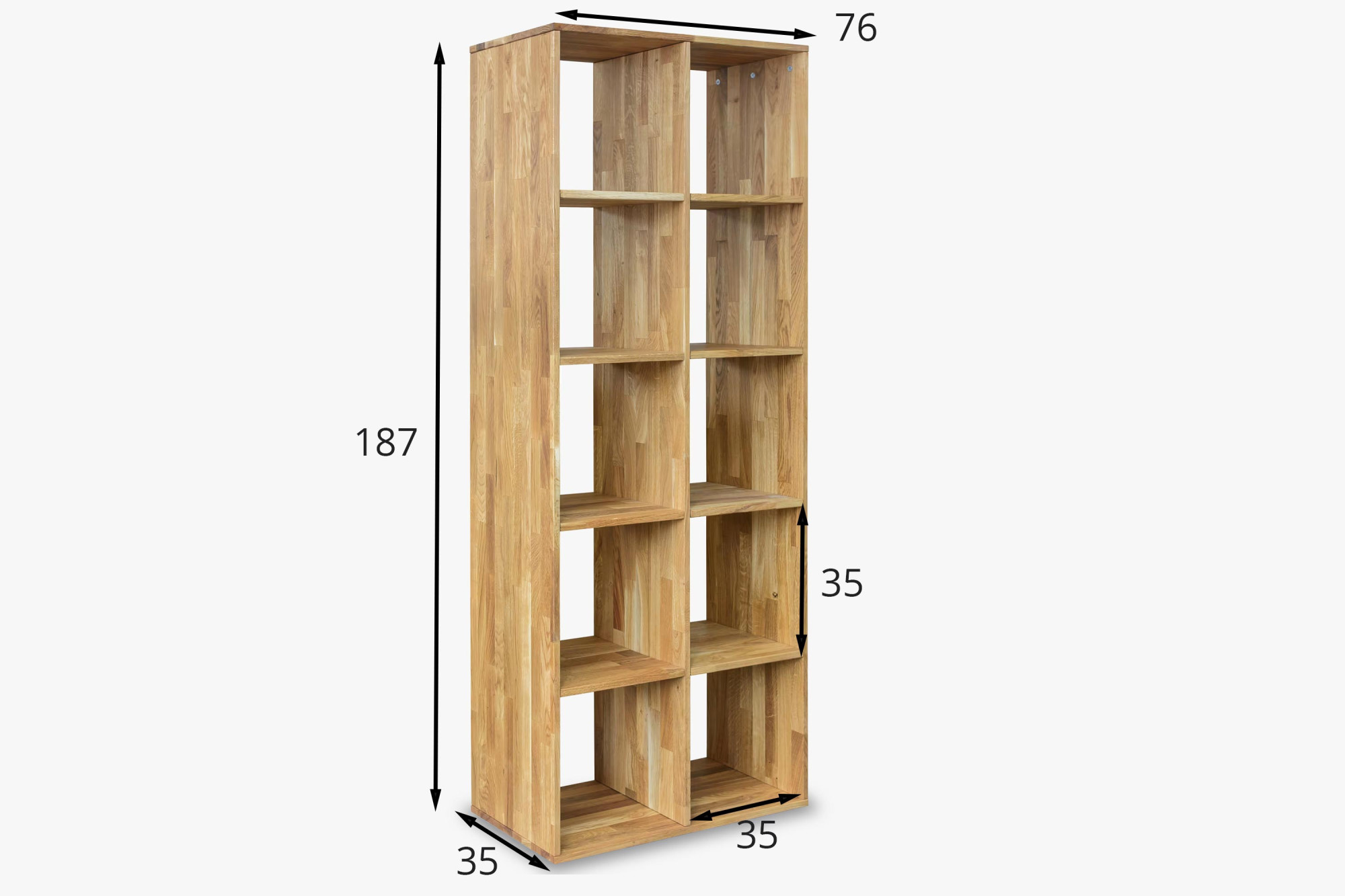 Eichenholzregal ist ein vielseitiges Aufbewahrungselement, das Wärme des natürlichen Holzes und zeitlose Eleganz in Ihr Zuhause bringt. Die Konstruktion aus massiver Eiche besticht durch Robustheit und lange Lebensdauer, die Oberfläche in der Farbnuance Eiche Natural ist mit natürlichem Öl behandelt, das die Holzmaserung betont und eine einfache lokale Auffrischung ermöglicht. Das offene Konzept mit zehn gleichen Fächern bietet übersichtlichen Platz für Bücher, Dekorationen und Boxen für Kleinigkeiten – ideal für Arbeitszimmer, Wohnzimmer und Kinderzimmer.
