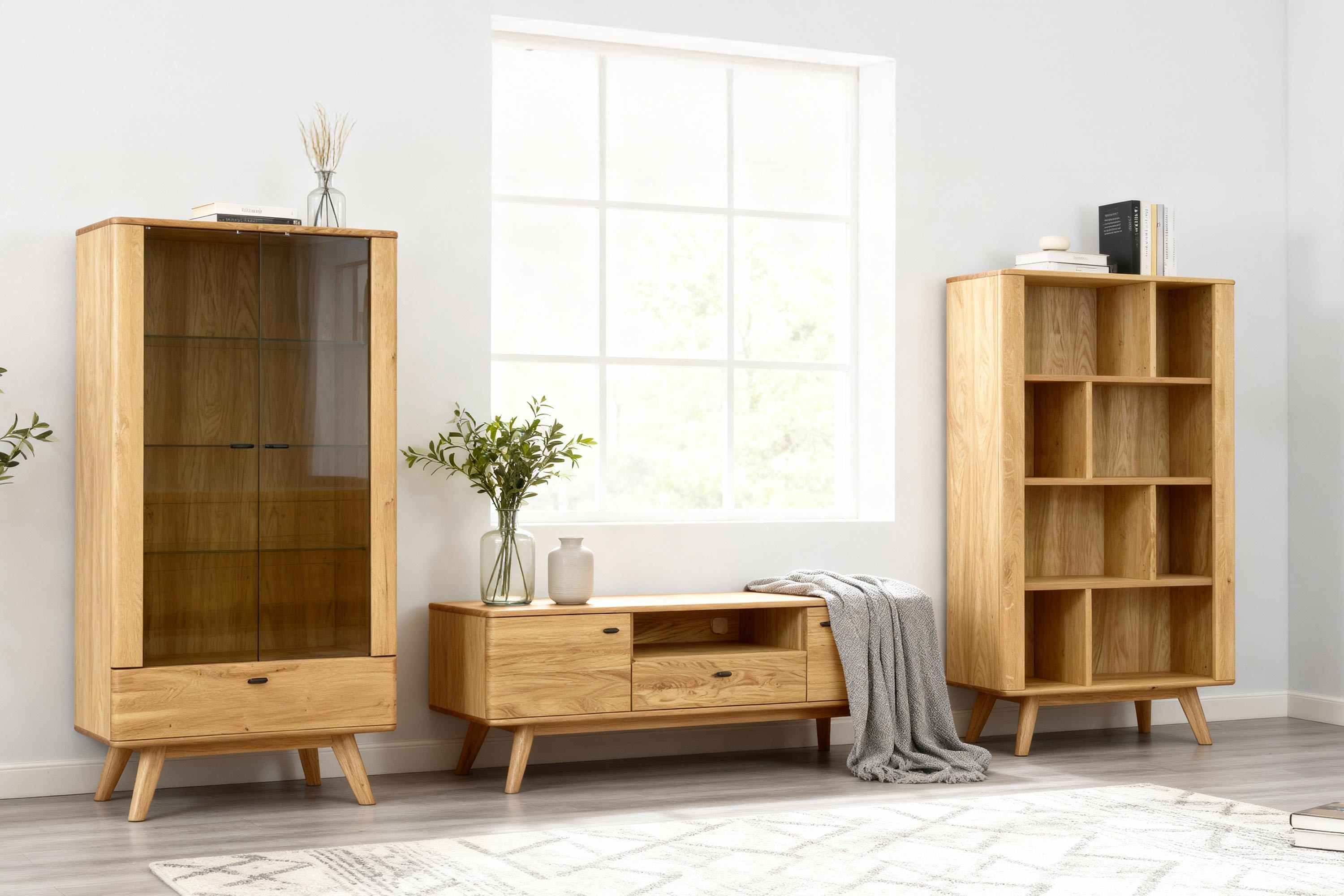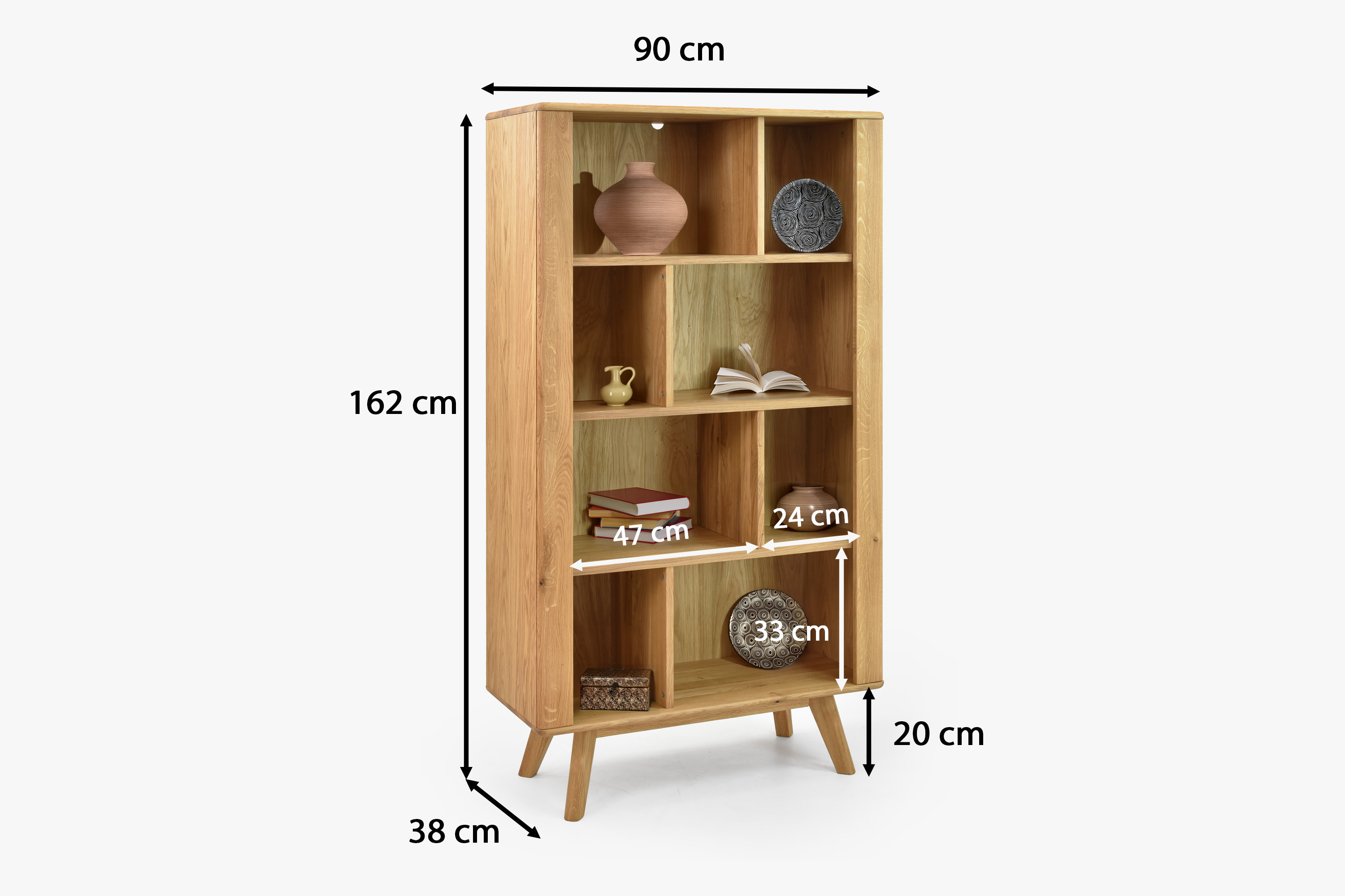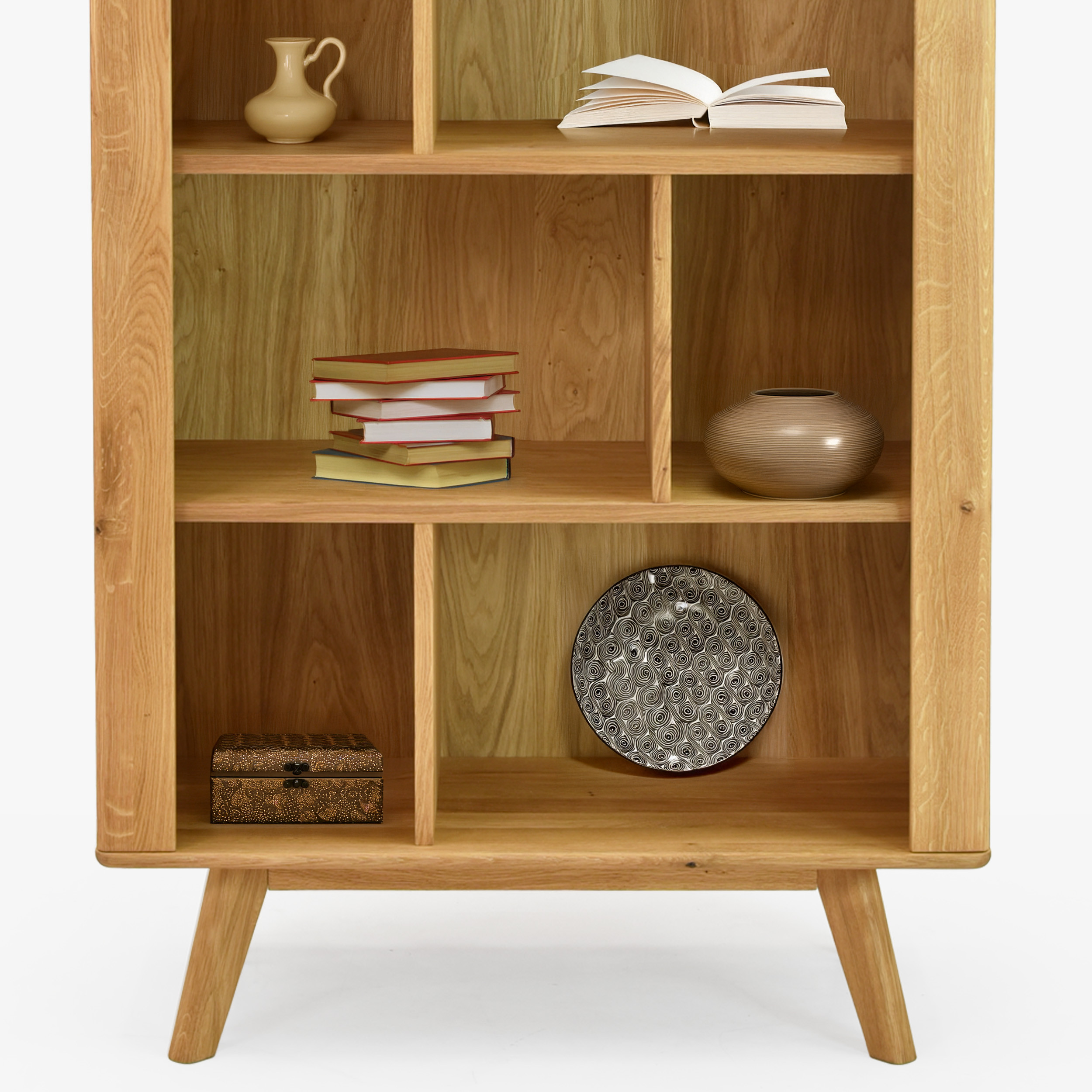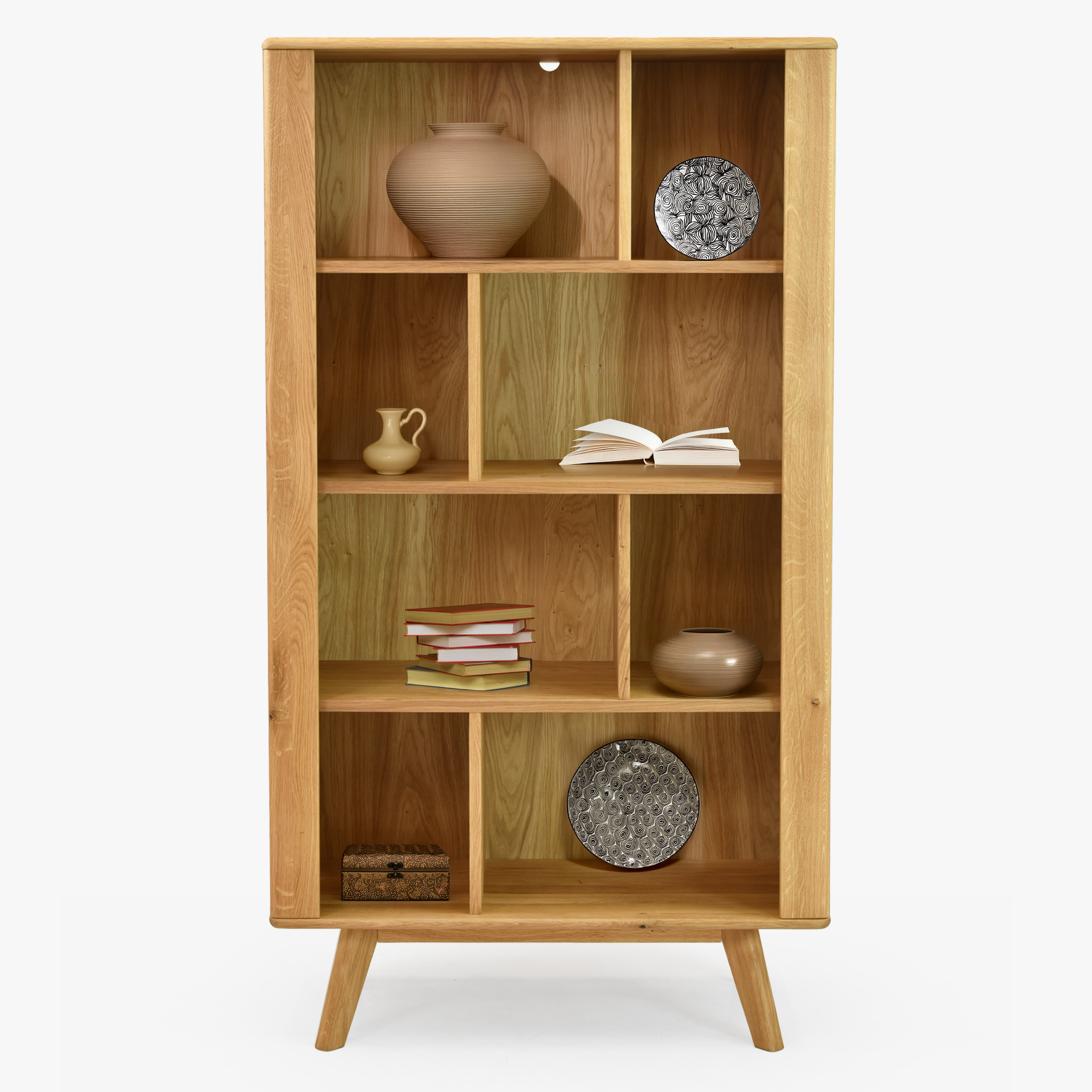 Eichenregal auf Beinen aus der Serie Jánošík stellt die ideale Verbindung von hochwertigem Naturmaterial, modernem Design und praktischer Nutzung dar. Das Regal mit einer Höhe von 162 cm ist in vier geräumige Bereiche unterteilt, die ausreichend Platz für Bücher, Dekorationen oder Accessoires bieten. Dank seines universellen Stils passt es hervorragend in jedes Interieur – von modernen Haushalten bis hin zu rustikalen Räumen. Die Konstruktion besteht aus einer Kombination aus massivem Eichenholz (Obere Platte, Beine, Vorderteile und tragende Elemente) und Premium-Eichenfurnier an den Seiten und am Korpus, was Festigkeit, Stabilität und lange Lebensdauer gewährleistet.