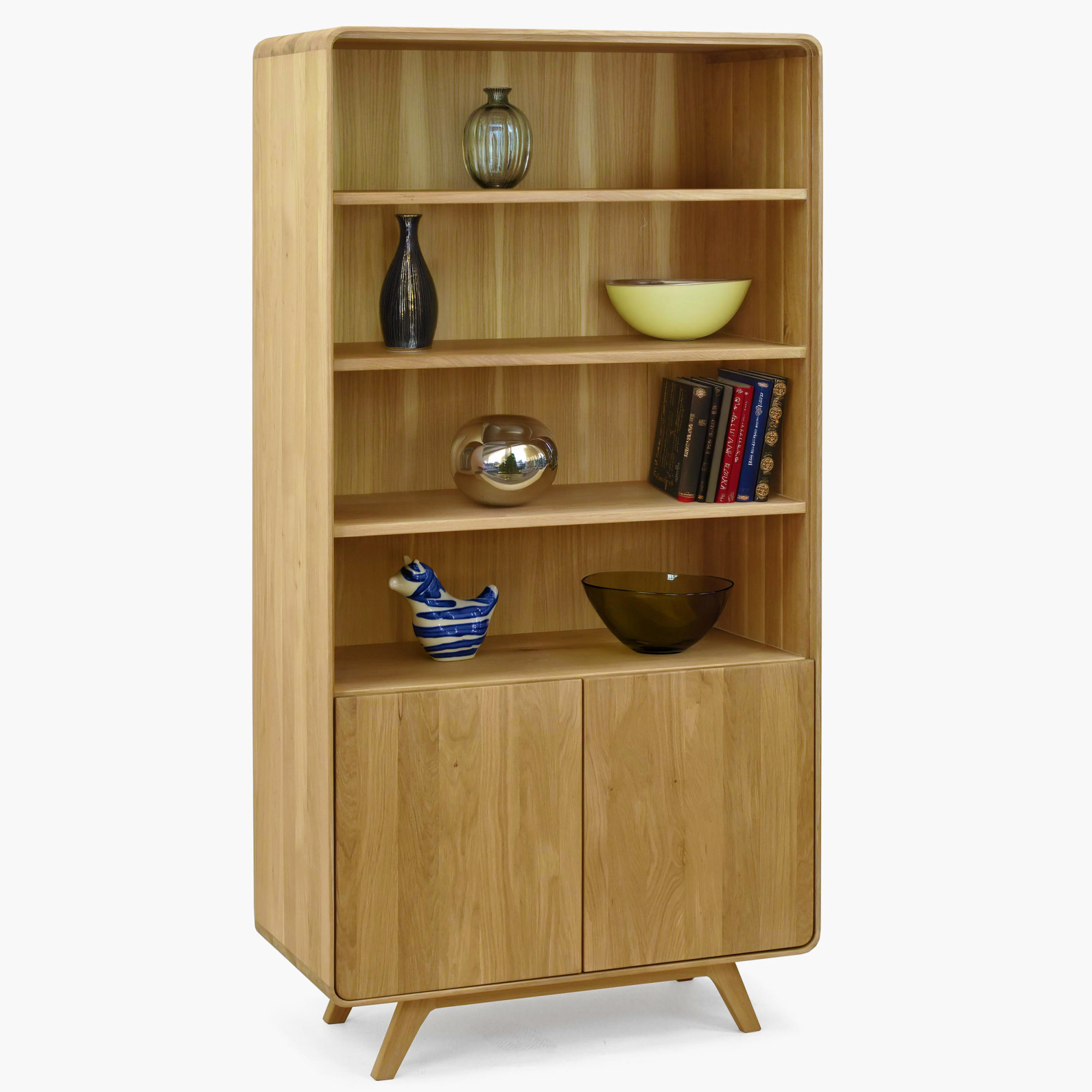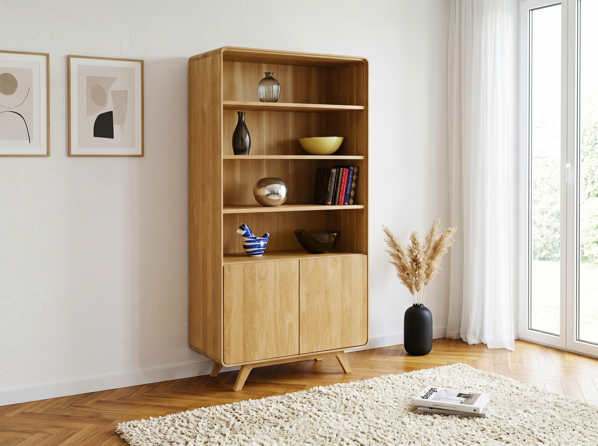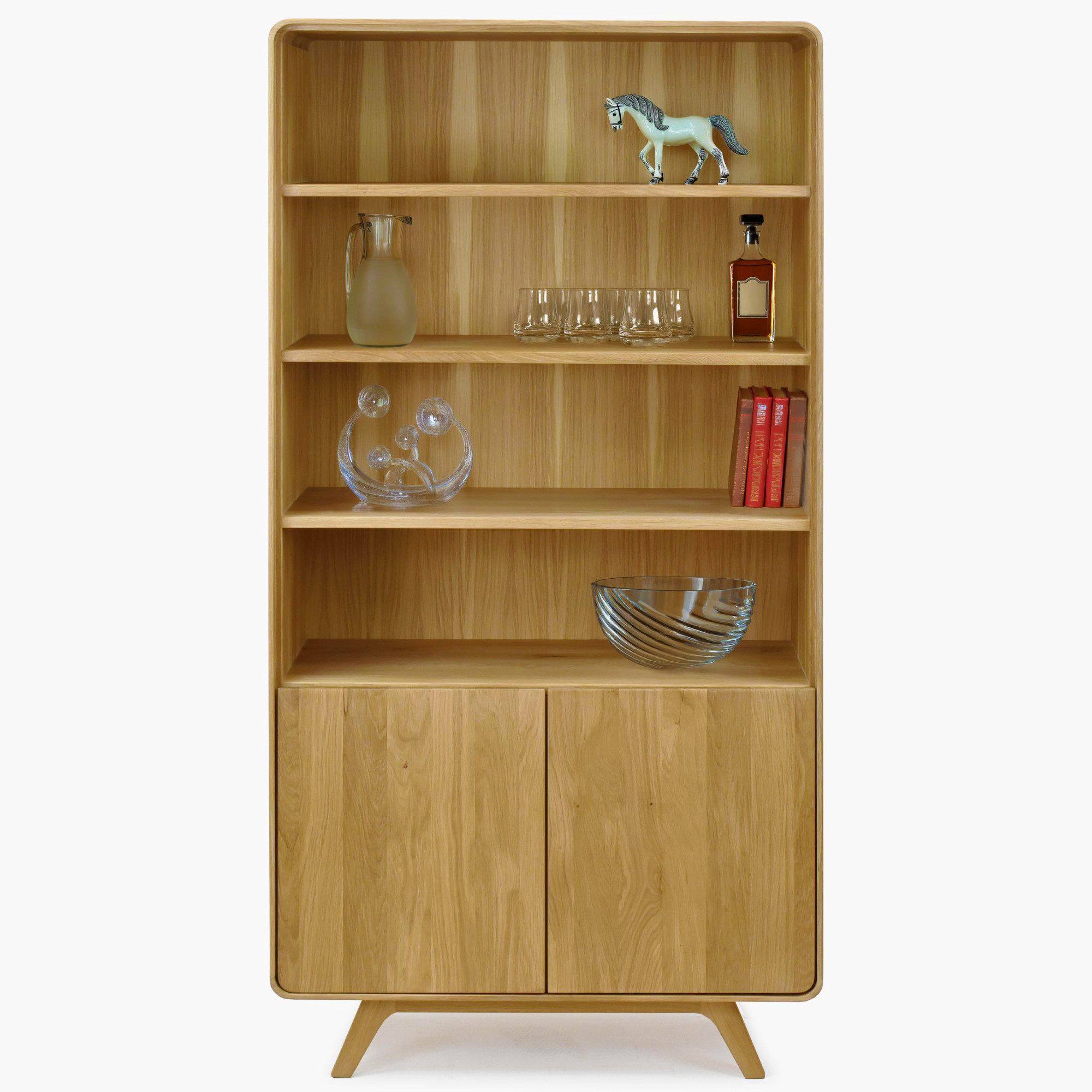 Das Regal bietet eine außerordentlich vielseitige Aufbewahrungslösung – vier offene Regalböden im oberen Bereich eignen sich ideal für Bücher, Dekoration, Glas oder Familienfotos, während der zweitürige Unterschrank mit Soft-Close-System praktische Dinge diskret versteckt. Die offenen Regalböden sind 25 und 26 cm hoch und 85 cm breit, der Innenraum des Schranks misst in der oberen Abteilung 23 cm und in der unteren Nische 24 cm bei einer Tiefe von 42 cm. Die Oberfläche ist mit naturbelassenem Öl behandelt, das die einzigartige Maserung der massiven Eiche hervorhebt und zugleich zuverlässigen Schutz gegen tägliche Abnutzung bietet. Die geölte Oberfläche lässt das Holz atmen und kann bei Bedarf leicht renoviert werden. Das Regal wird bereits komplett montiert geliefert – der Kunde befestigt vor Ort nur noch die Füße. Es lässt sich hervorragend mit weiteren Stücken der Kollektion Avalon kombinieren und schafft so ein harmonisch abgestimmtes Interieur.