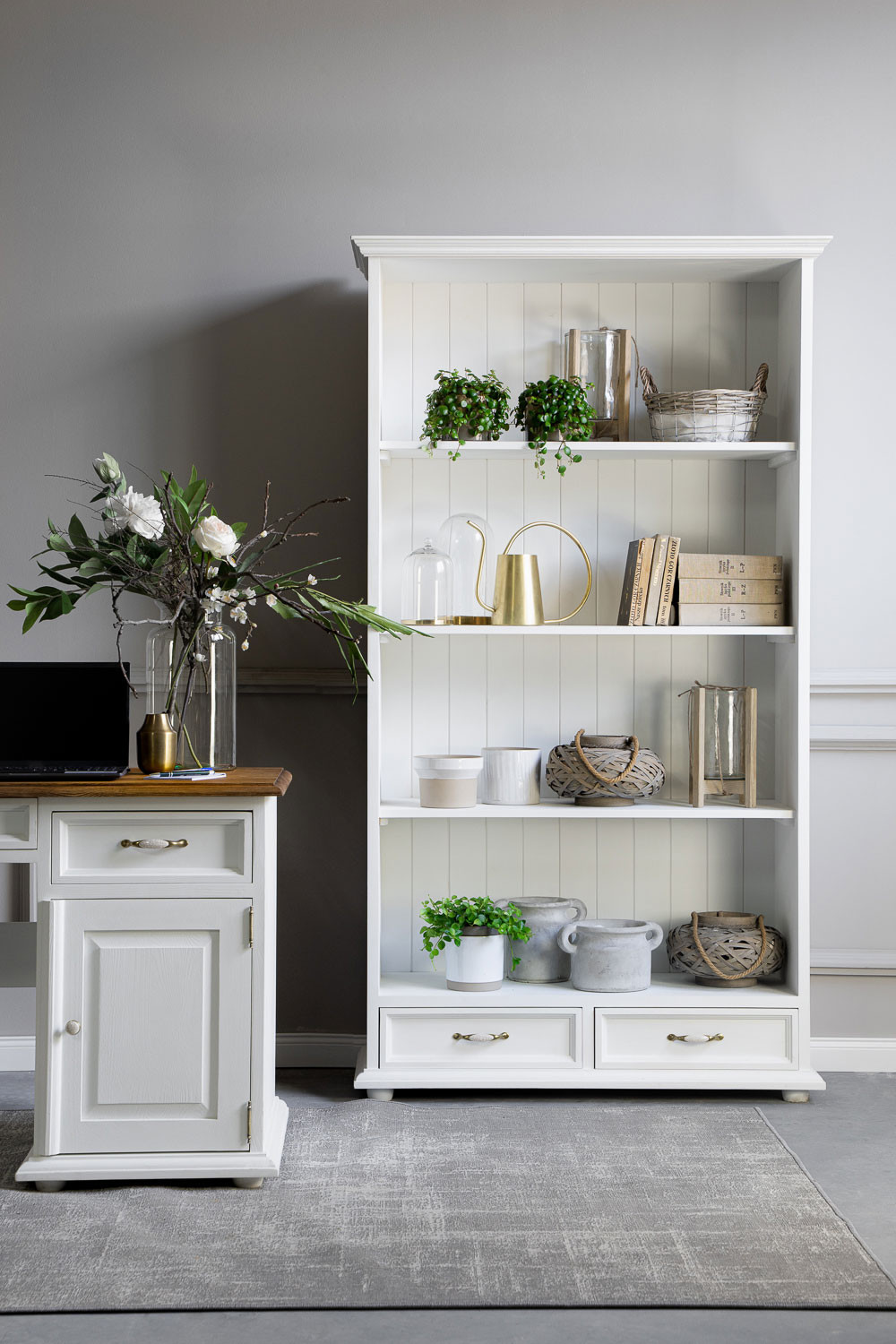 Haben Sie ein Interieur im Landhausstil eingerichtet? Dann passt genau dieser Bücherschrank hervorragend dazu. Und falls nicht, aber Sie es planen, empfehlen wir Ihnen auf jeden Fall weitere Möbel aus der Provence Kollektion, mit denen sich der Bücherschrank beliebig kombinieren lässt. Es handelt sich um originelle massive Möbel im Stil des französischen Landhauswohnens, die bei Kunden sehr beliebt sind. Alle Elemente dieser Serie, natürlich inklusive dieses Bücherschranks, sind aus Kiefernmassivholz gefertigt. Jedes Stück der Provence-Serie hat ein ganz originelles Aussehen, mit jedem Möbelstück holen Sie sich ein einzigartiges Möbel mit langer Lebensdauer und wunderschönem Design nach Hause, das auch nach Jahren nichts von seiner Schönheit verliert.
