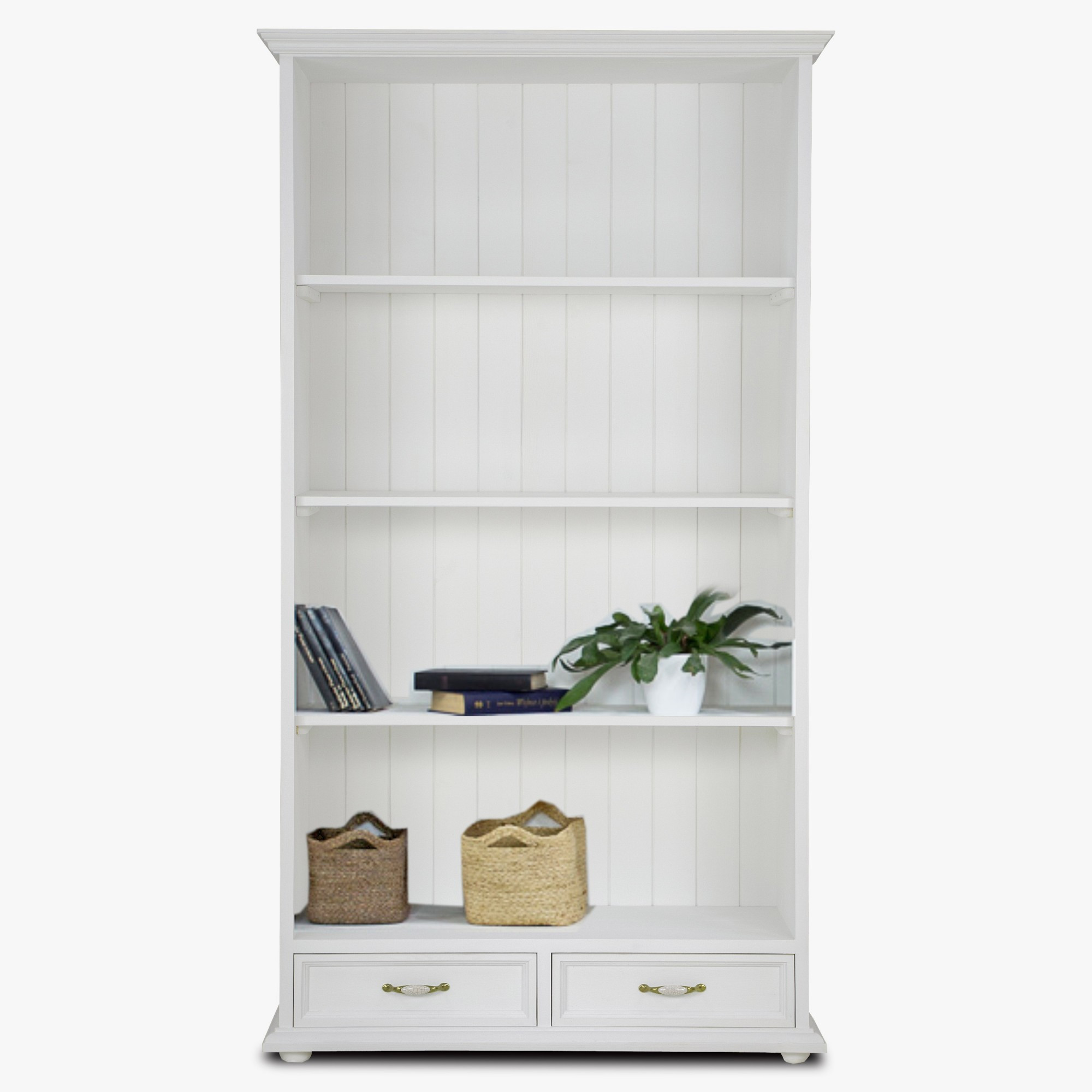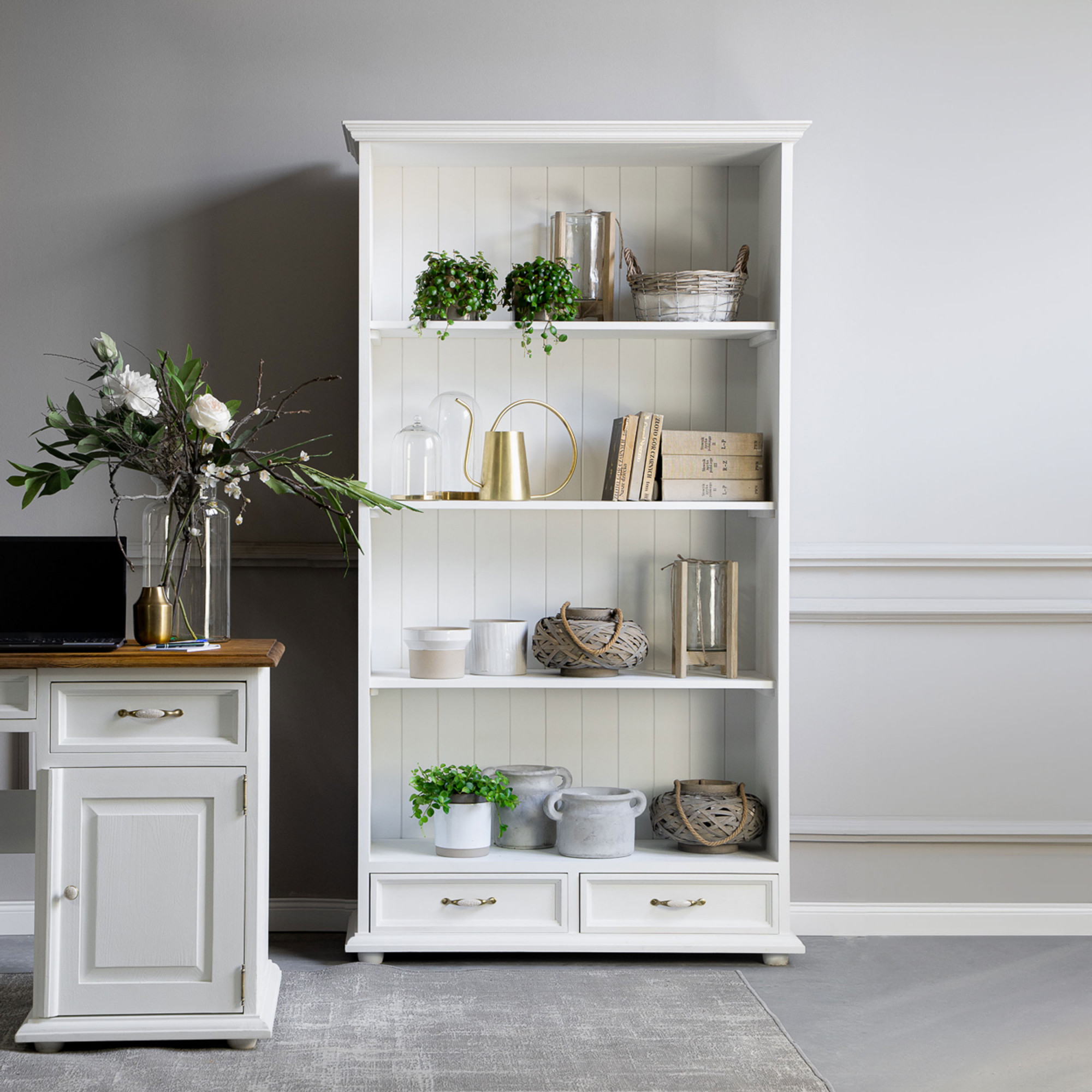 Ein Bücherschrank im provenzalischen Stil verspricht dank seiner Proportionen eine wahrhaft universelle Nutzung. Er dient Ihnen als Bücherschrank oder Regal im Arbeitszimmer. In den vier geräumigen Fächern, die durch Einlegeböden getrennt sind, können Sie auch stilvolle Dekorationen, Geschirr oder Souvenirs von Reisen ausstellen. Die unteren Schubladen mit keramischen Griffen dienen zur Aufbewahrung kleinerer Gegenstände.