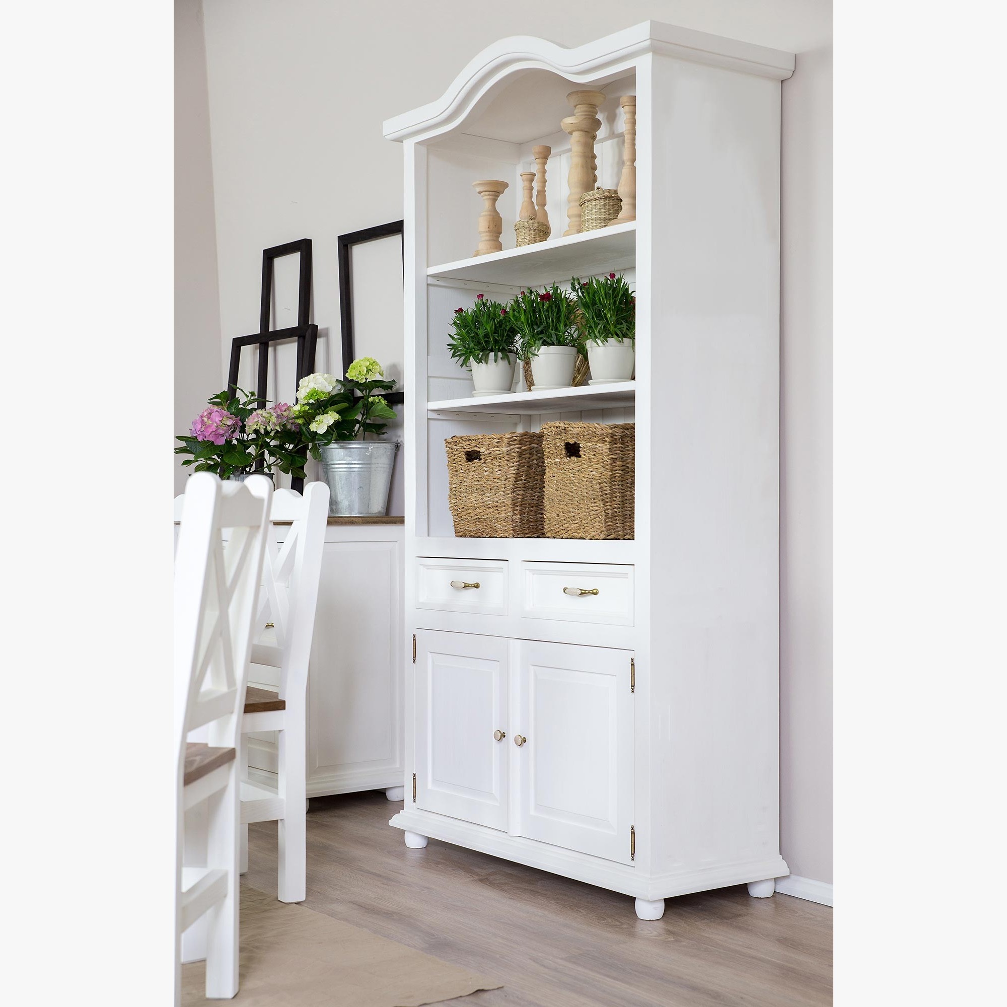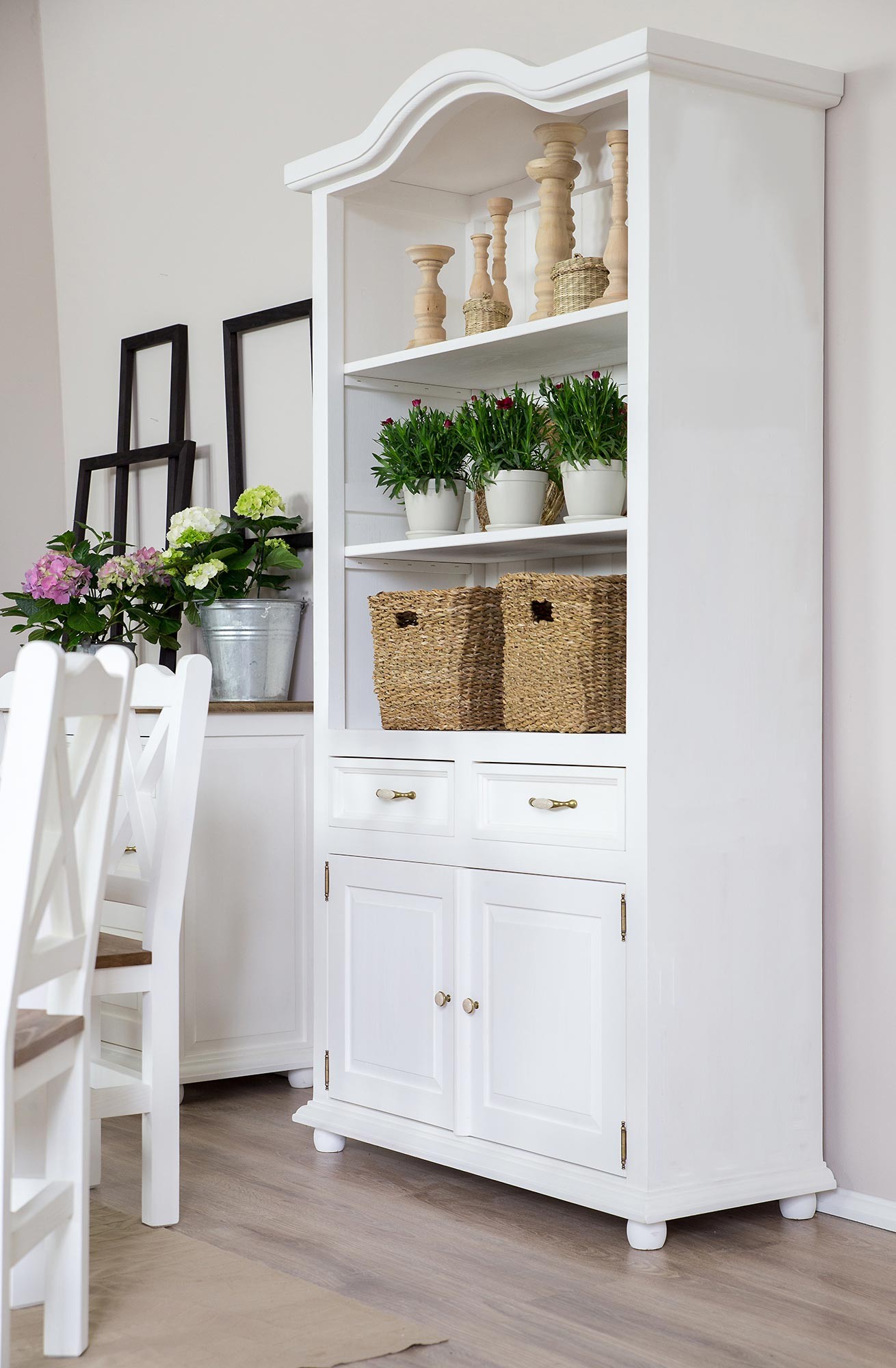 Dank des schönen Designs mit abgerundeter Oberplatte und geformten Seiten wird das Regal aus Kiefernmassivholz zum Blickfang des ganzen Raumes. Wenn Sie eine einheitliche Ausstattung wünschen, können wir wärmstens weitere Möbel aus der Provence-Kollektion empfehlen! Sie können sie nach Belieben kombinieren! Es passt hervorragend ins Wohnzimmer, Arbeitszimmer oder Esszimmer! Der Innenraum des Regals kombiniert offene Regalböden, ideal zum Ausstellen von Dekorationen, Büchern oder Geschirr, zwei Schubladen und einen unteren Schrank mit Türen. Den Türen und Schubladenfronten fehlen nicht die stilvollen Griffe, die das Design des Möbels harmonisch abrunden.