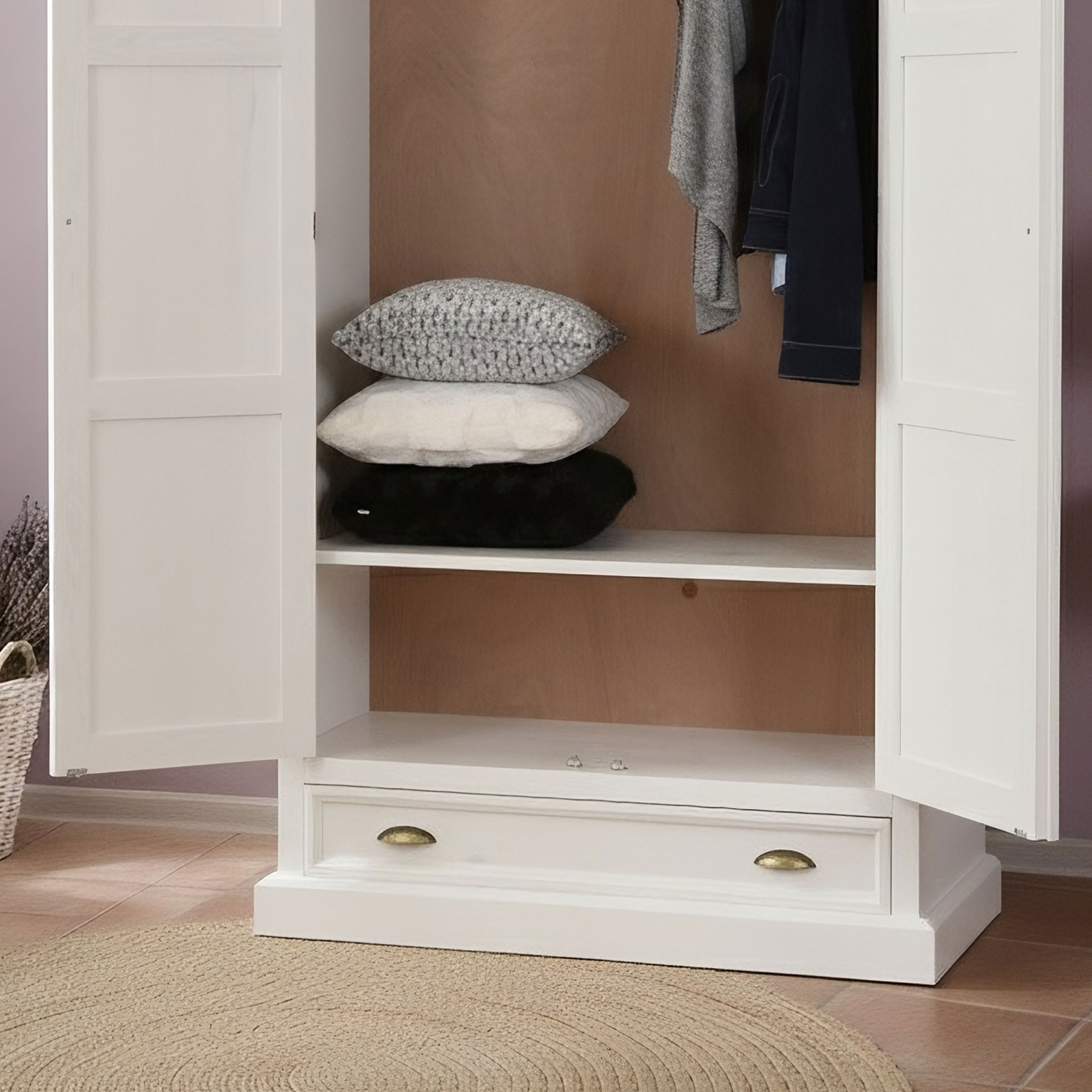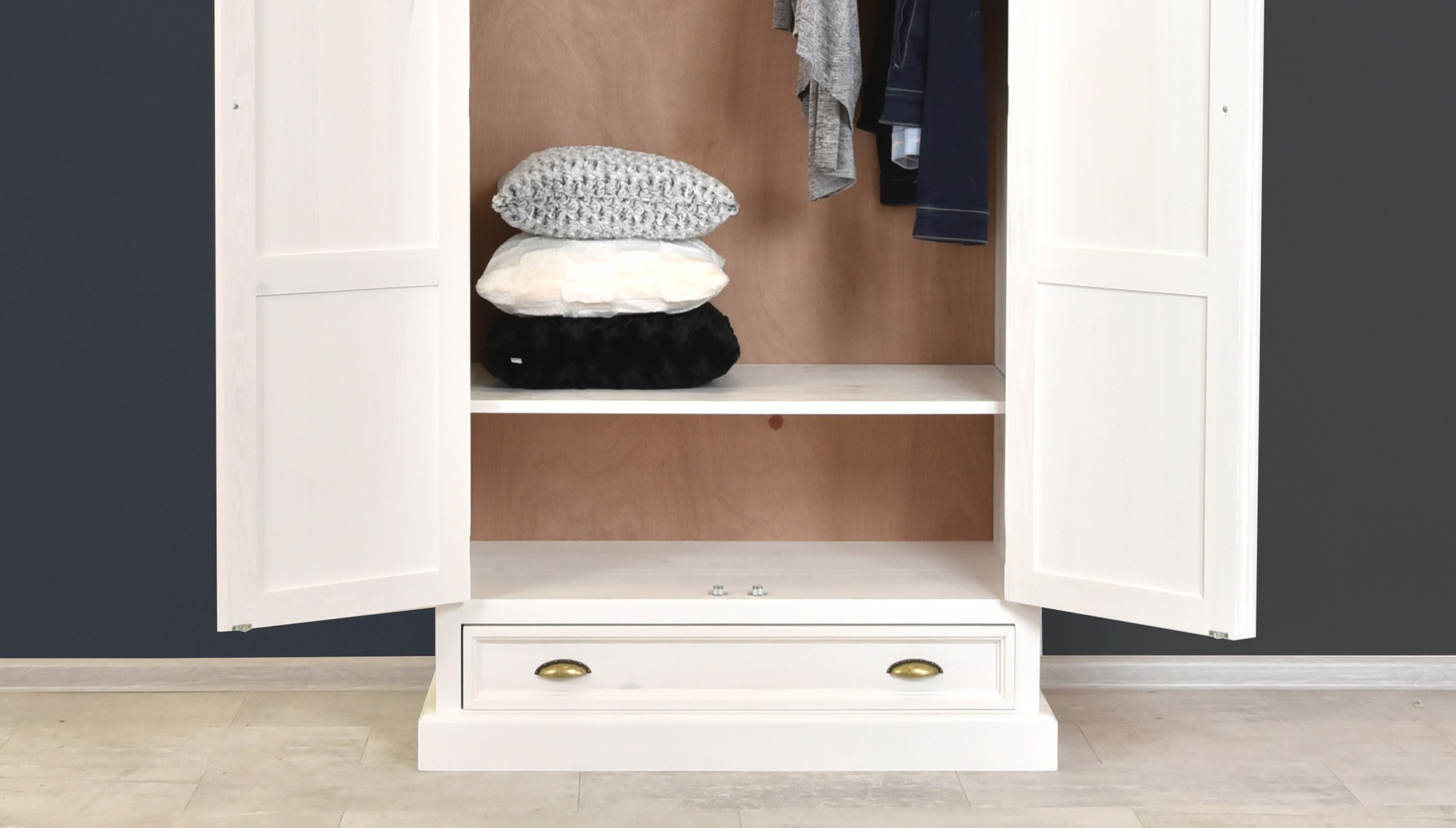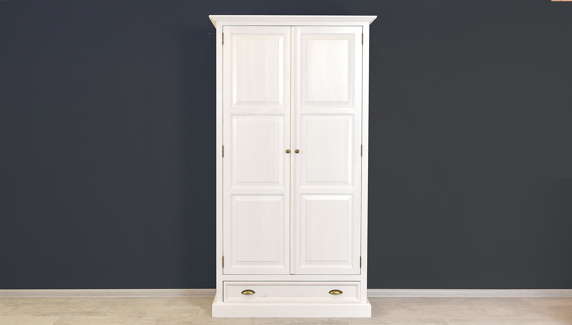 Weißer rustikaler Schrank France 2D ist ein eleganter zweitüriger Schrank aus der Kollektion Provenzalischer Möbel, die traditionellen französischen Stil mit Praktikabilität und Qualität verbindet. Er besteht aus 100% massivem Kiefernholz, wodurch er sich durch hohe Widerstandsfähigkeit und lange Lebensdauer auszeichnet. Der Innenraum des Schranks ist in ein oberes Fach und eine Kleiderstange für Hemden und Jacken unterteilt, im unteren Bereich finden Sie eine praktische Schublade für kleinere Kleidungsstücke oder Accessoires. Die Oberflächenbehandlung kombiniert weißen Wachs und braunen Lack, die das Holz schützen und gleichzeitig seine natürliche Struktur hervorheben.