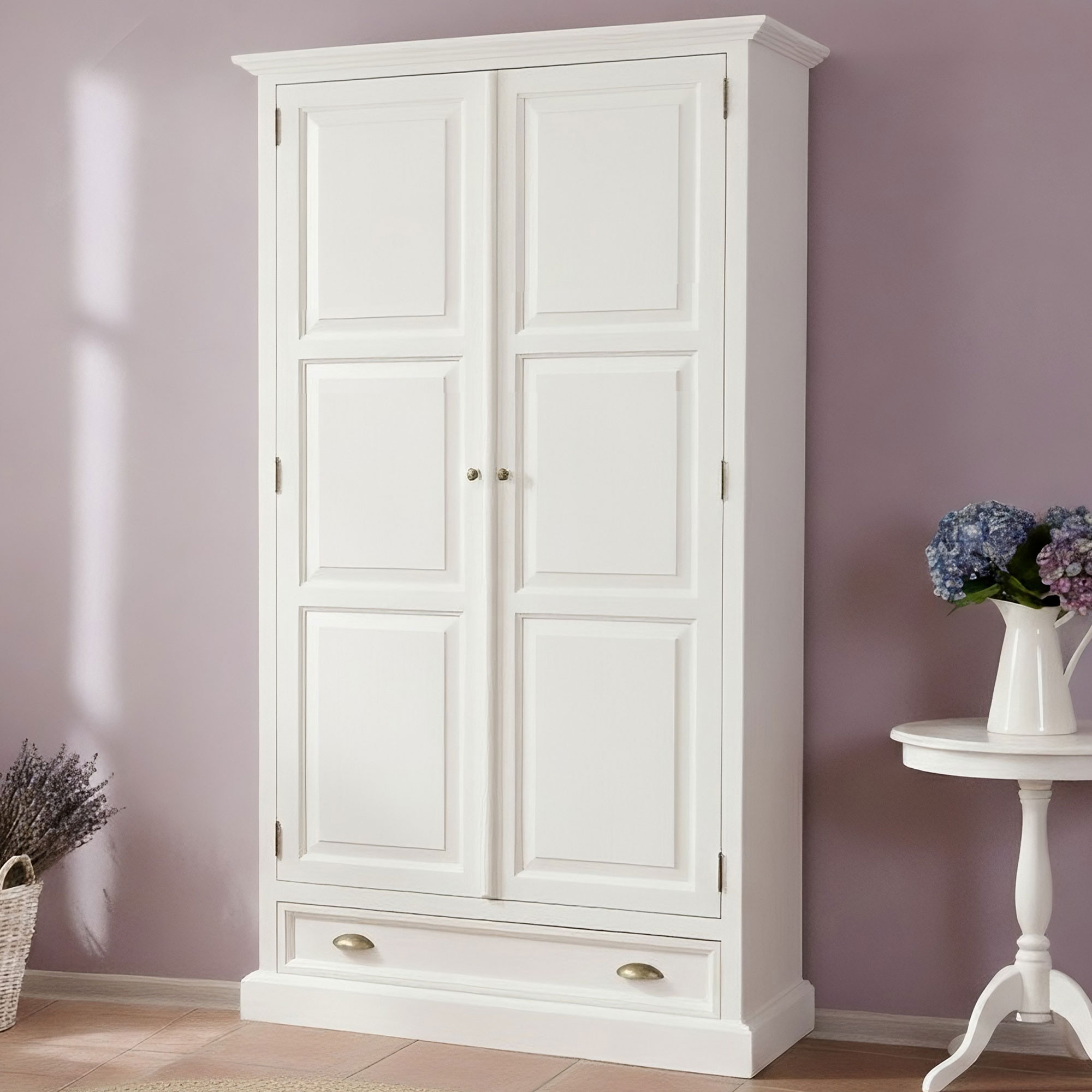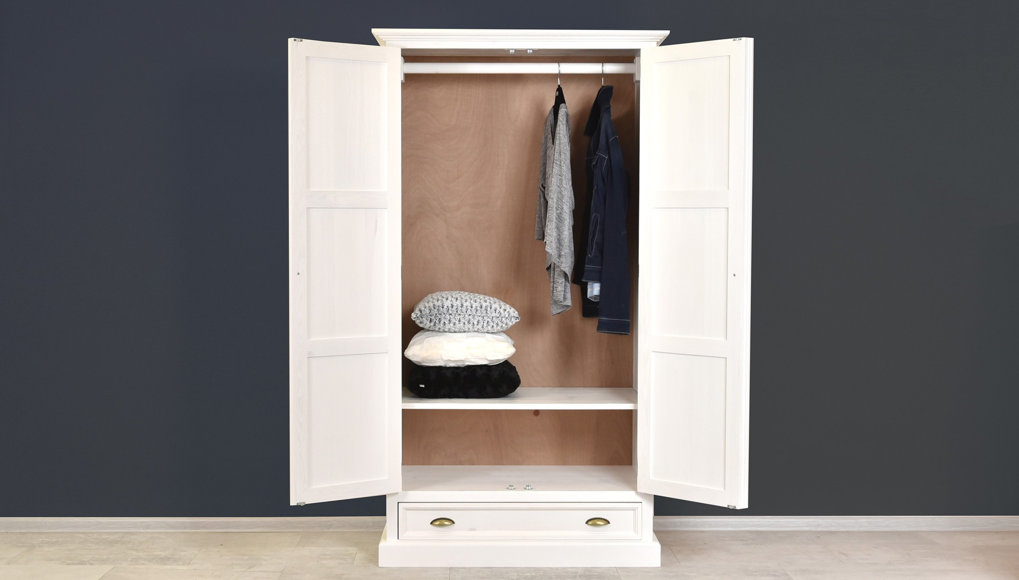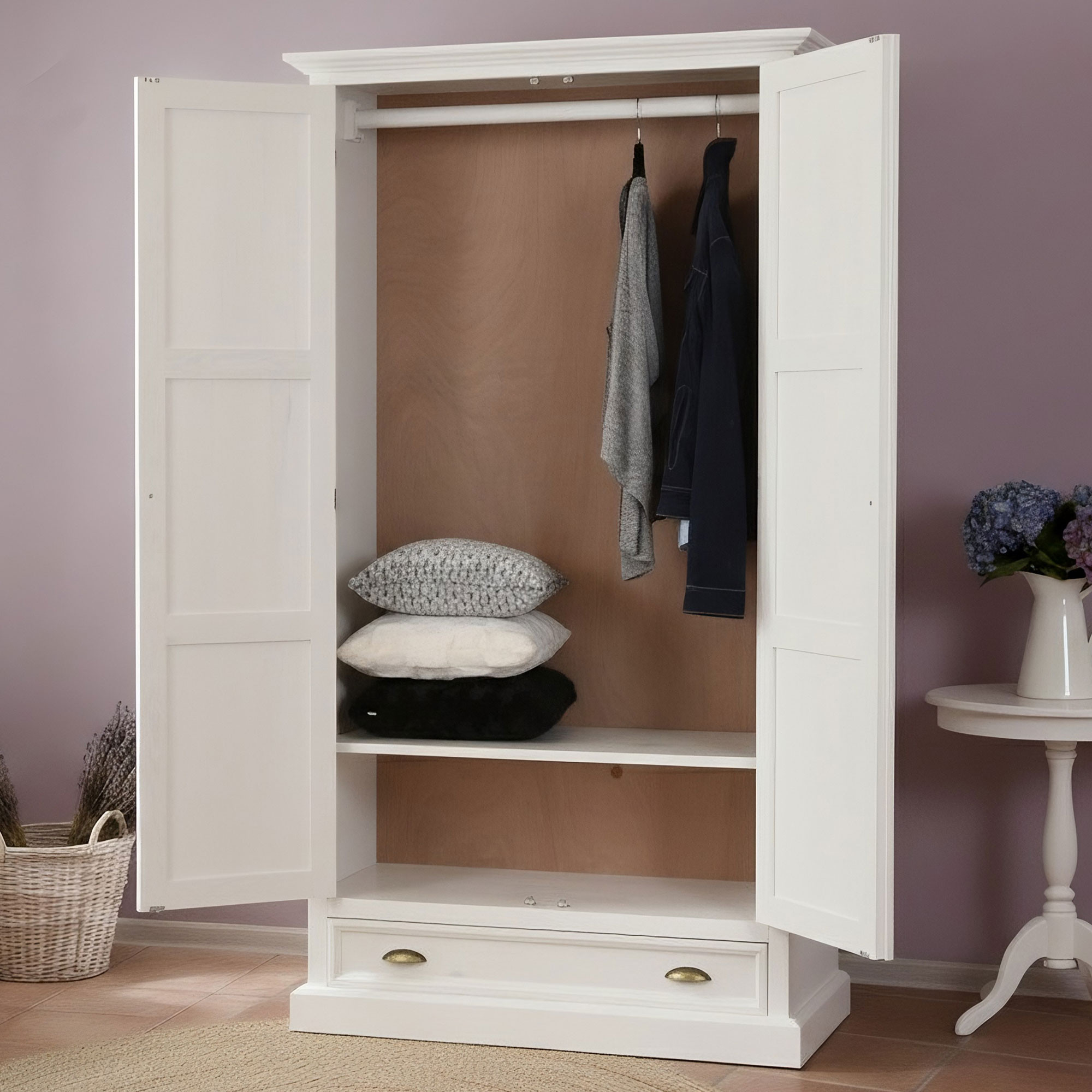 Weißer rustikaler Schrank France 2D ist ein eleganter zweitüriger Schrank aus der Kollektion Provenzalischer Möbel, die traditionellen französischen Stil mit Praktikabilität und Qualität verbindet. Er besteht aus 100% massivem Kiefernholz, wodurch er sich durch hohe Widerstandsfähigkeit und lange Lebensdauer auszeichnet. Der Innenraum des Schranks ist in ein oberes Fach und eine Kleiderstange für Hemden und Jacken unterteilt, im unteren Bereich finden Sie eine praktische Schublade für kleinere Kleidungsstücke oder Accessoires. Die Oberflächenbehandlung kombiniert weißen Wachs und braunen Lack, die das Holz schützen und gleichzeitig seine natürliche Struktur hervorheben.