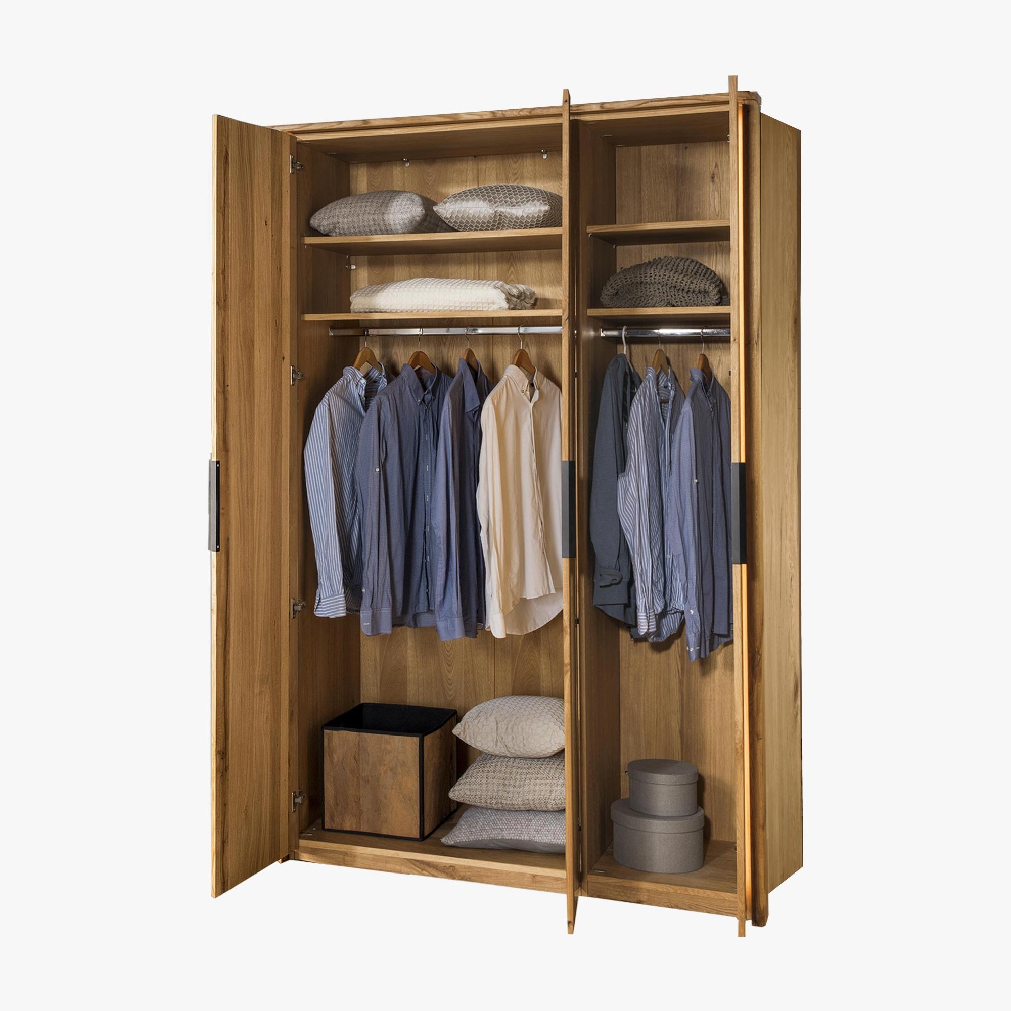 Großer drehtüriger Schrank aus massivem Eichenholz, Texas 13 Massivholzschrank aus Eichenkomposit für das Schlafzimmer aus der Möbelkollektion Texas. Ein Schrank mit wunderschönem Design natürlicher Möbel. Für die Herstellung wird exklusives ausgewähltes Eichenholz verwendet, damit das Möbelstück authentisch und natürlich wirkt. Der Schrank wird zerlegt mit einer ausführlichen Montageanleitung geliefert, die Voraussetzung für die vollständige Montage ist die Befestigung des Schranks direkt an der Wand. Das Holz ist in der Farbe Naturöl, somit kann es auch mit anderem Eichenholz-Möbel kombiniert werden.