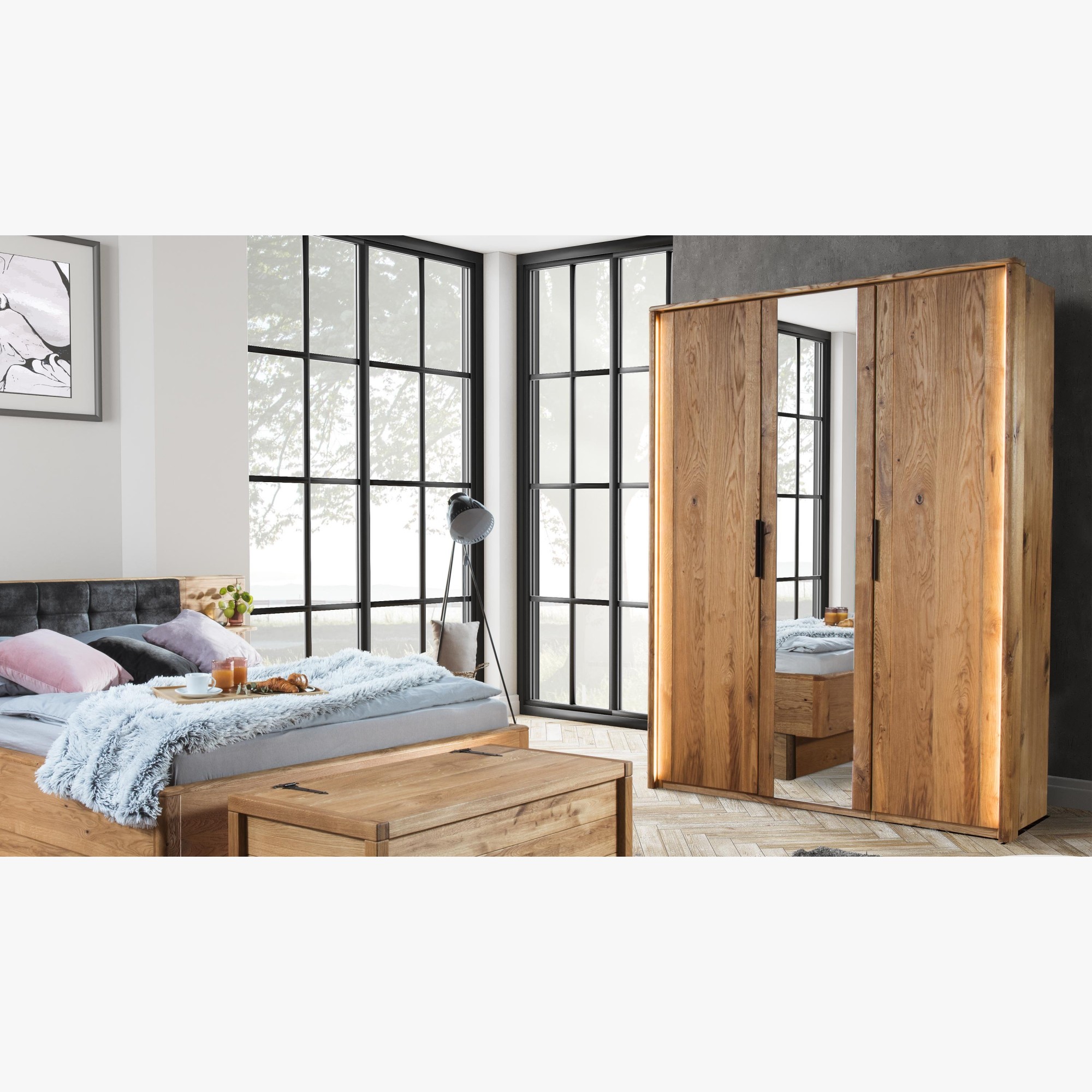 Der Schrank ist aus echtem Eichenholz gefertigt (Kompositzusammensetzung = Premium-natürliches Eichenfurnier mit Fichtenholz in der Mitte) , behandelt mit dem deutschen Markenöl LIVOS. Das für die Herstellung verwendete Holz stammt aus erneuerbaren Wäldern mit FSC-Zertifikat. Die Holzoberfläche ist leicht strukturiert. Die Möbel Texas für das Schlafzimmer sind aus Eichenholz gefertigt. In der Kollektion finden Sie Betten, Schränke oder Kommoden. Wenn Ihnen ein bestimmtes Stück fehlt, können Sie problemlos Möbel aus der Jánošík-Kollektion oder der Texas-Kollektion kombinieren. Für die Behandlung wird das deutsche Markenöl LIVOS verwendet. Die Herstellung, bei der die Möbel gefertigt werden, stellt eine der modernsten Anlagen in Europa dar, an der hochmoderne CNC-Maschinen verwendet werden. Die Möbel werden in Zusammenarbeit mit unserer Firma Möbel Mirek und einer polnischen Firma hergestellt. Vertrauen Sie dabei auf unsere mehr als 25-jährige Erfahrung im Bereich Massivholzmöbel.