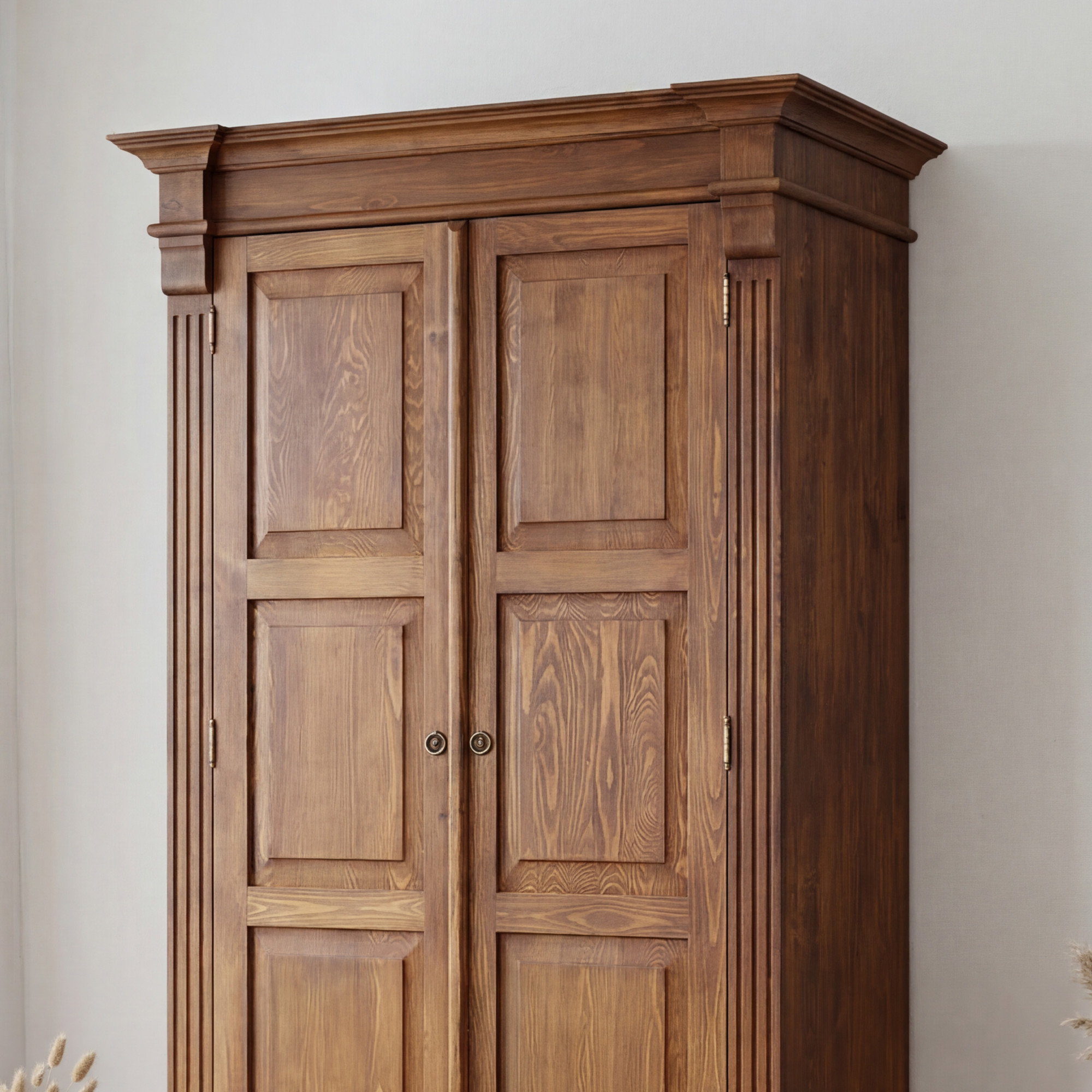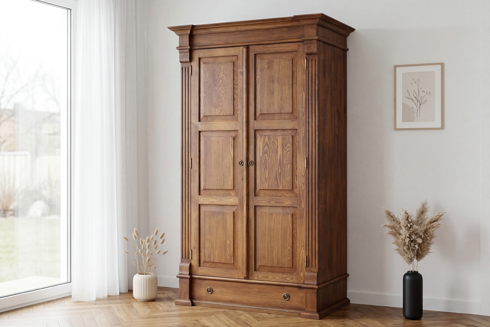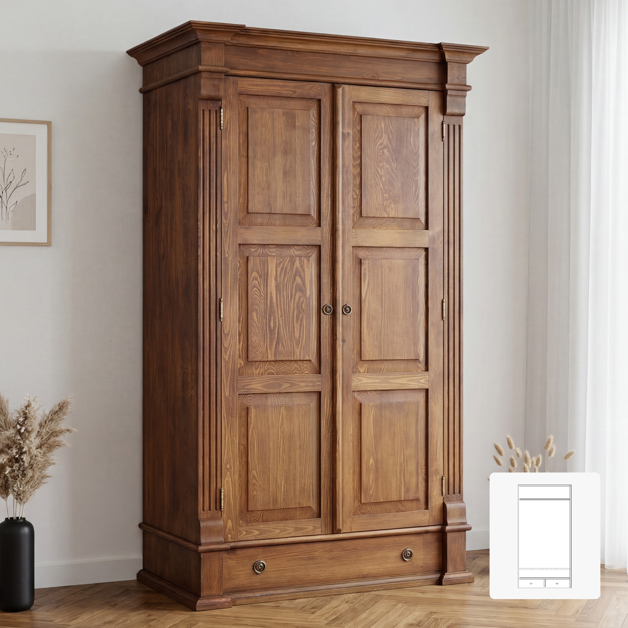 Der Holz-Garderobenschrank Prestige ist für Kunden entworfen, die hochwertige Materialien, traditionelle Optik und langfristige Zuverlässigkeit schätzen. Mit einer Tiefe von 69 cm bietet er ausreichend Platz für die bequeme Aufbewahrung von Kleidung, saisonalen Textilien und weiteren Dingen, die übersichtlich organisiert werden sollen. Die robuste Massivholz-Konstruktion sorgt für hohe Stabilität und Widerstandsfähigkeit im täglichen Gebrauch.