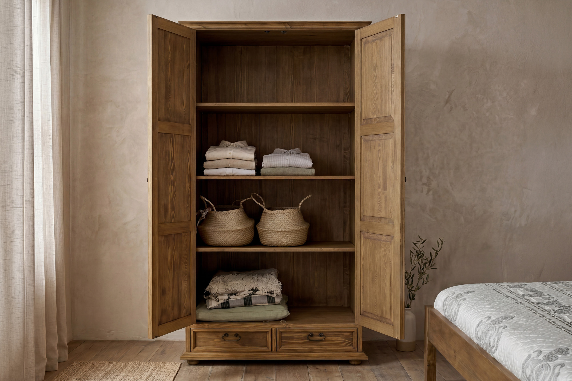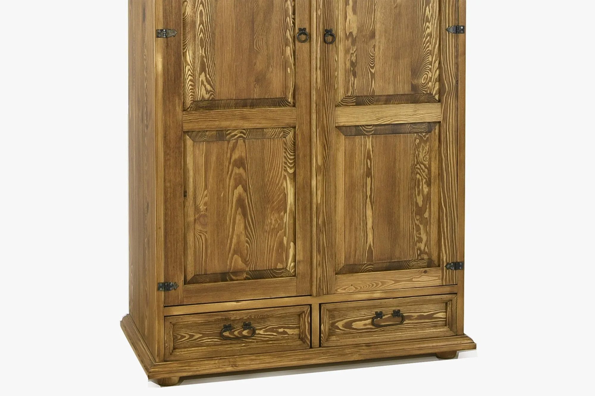 Der rustikale Schrank ist zweiteilig und bietet praktisch gestalteten Stauraum. Im Inneren befinden sich drei durchgehende Einlegeböden, die einen übersichtlich gegliederten Platz für gefaltete Kleidung, Bettwäsche, Textilien und andere Haushaltsaccessoires schaffen. Im unteren Bereich befinden sich zwei praktische Schubladen, die sich hervorragend zur Aufbewahrung von Kleinteilen, Unterwäsche oder anderen Alltagsgegenständen eignen.