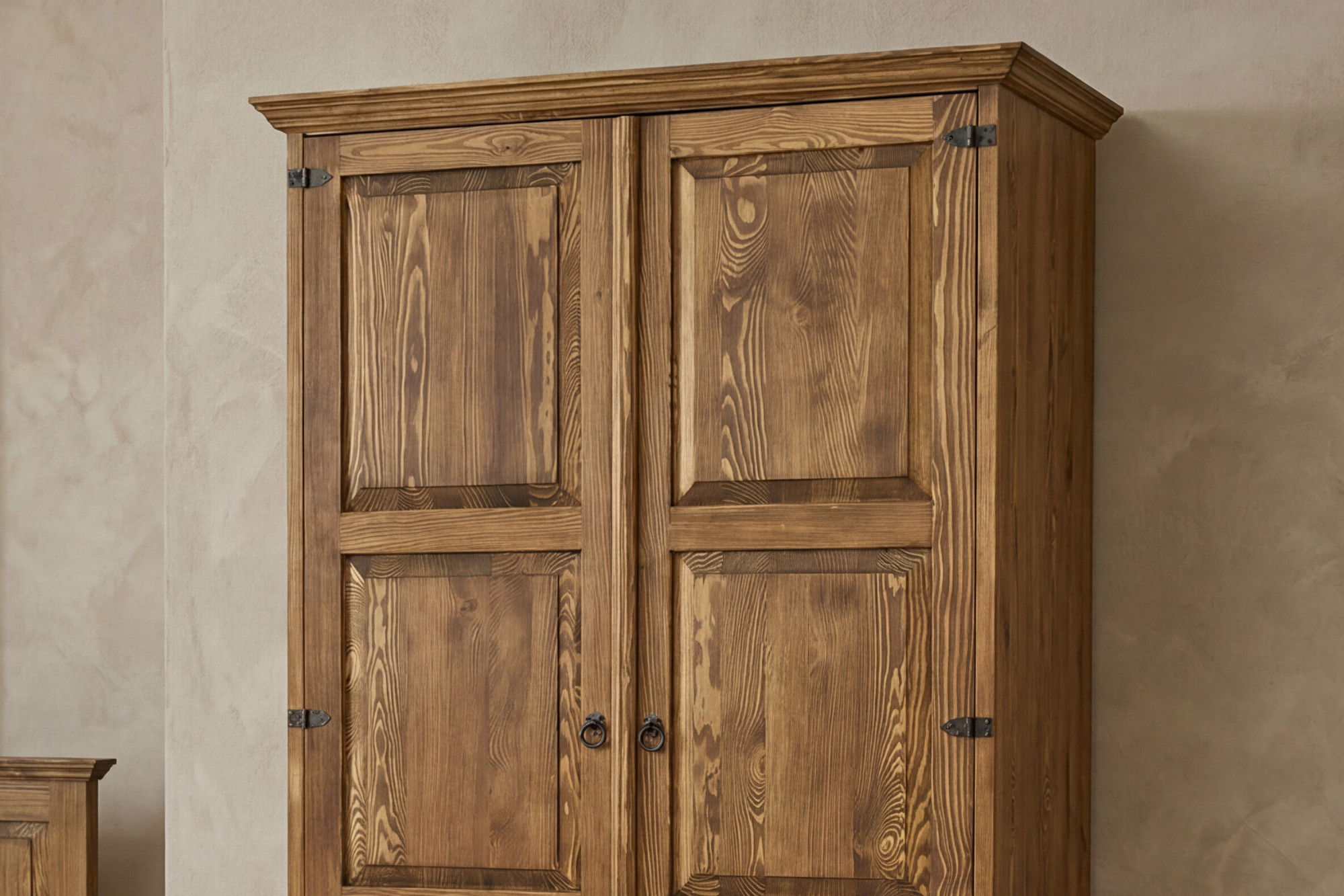 Dieser Kleiderschrank aus massivem Kiefernholz besticht nicht nur durch sein Aussehen, sondern auch durch seine lange Lebensdauer und stabile Konstruktion. Dank des hochwertigen Materials und der traditionellen Verarbeitung ist er geeignet für Schlafzimmer, Landhäuser, Ferienhäuser sowie stilvoll eingerichtete Interieurs. Er ist ideal für Kunden, die ehrliche Holzmöbel mit authentischem Aussehen und praktischer Nutzung suchen.
