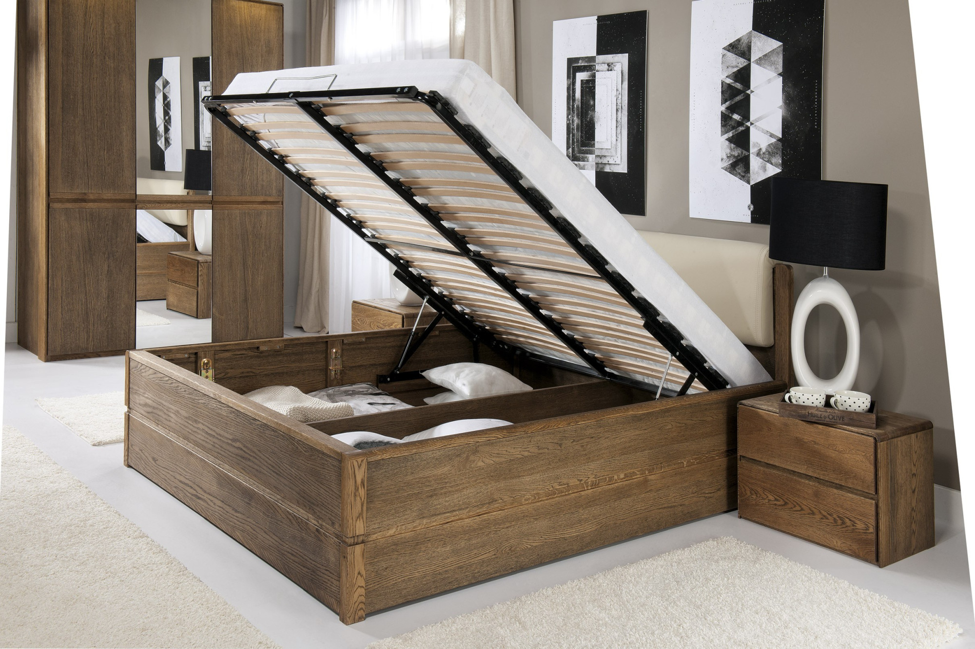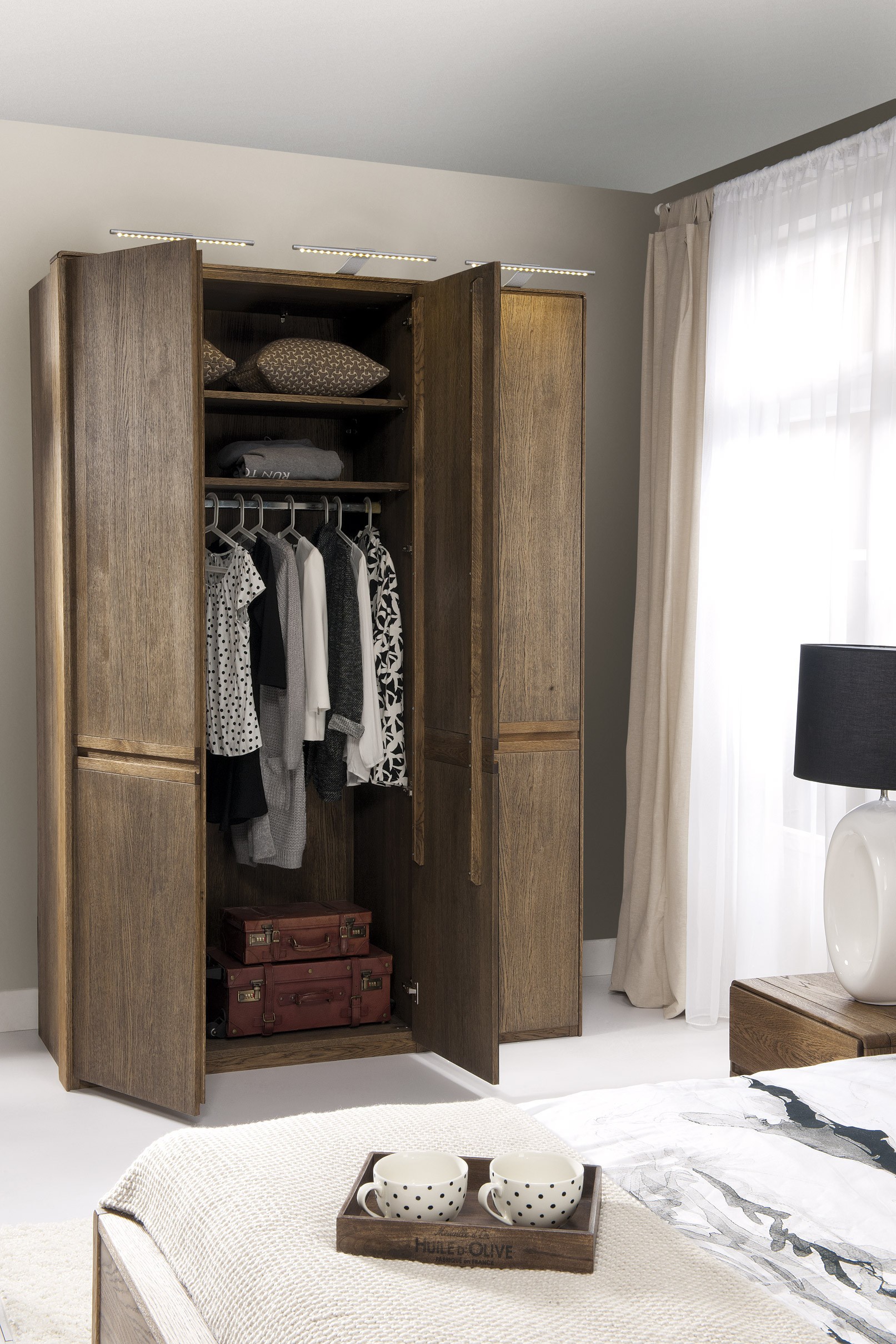 Der Kleiderschrank findet seinen Platz sowohl im Schlafzimmer als auch im Wohnzimmer oder Flur. Der Innenraum ist im oberen Teil mit einer Kleiderstange und zwei eingesetzten Einlegeböden unterteilt. Die Inneneinteilung des Schranks ermöglicht sowohl das Aufhängen von Kleiderbügeln als auch das Ablegen gefalteter Kleidung. Der Kleiderschrank ist aus natürlichem Eichenholzfurnier gefertigt. Er ist entweder in der helleren, natürlichen und ökologischen Variante Eiche geölt oder in der außergewöhnlichen Oberflächenbehandlung gebrannte Eiche erhältlich.