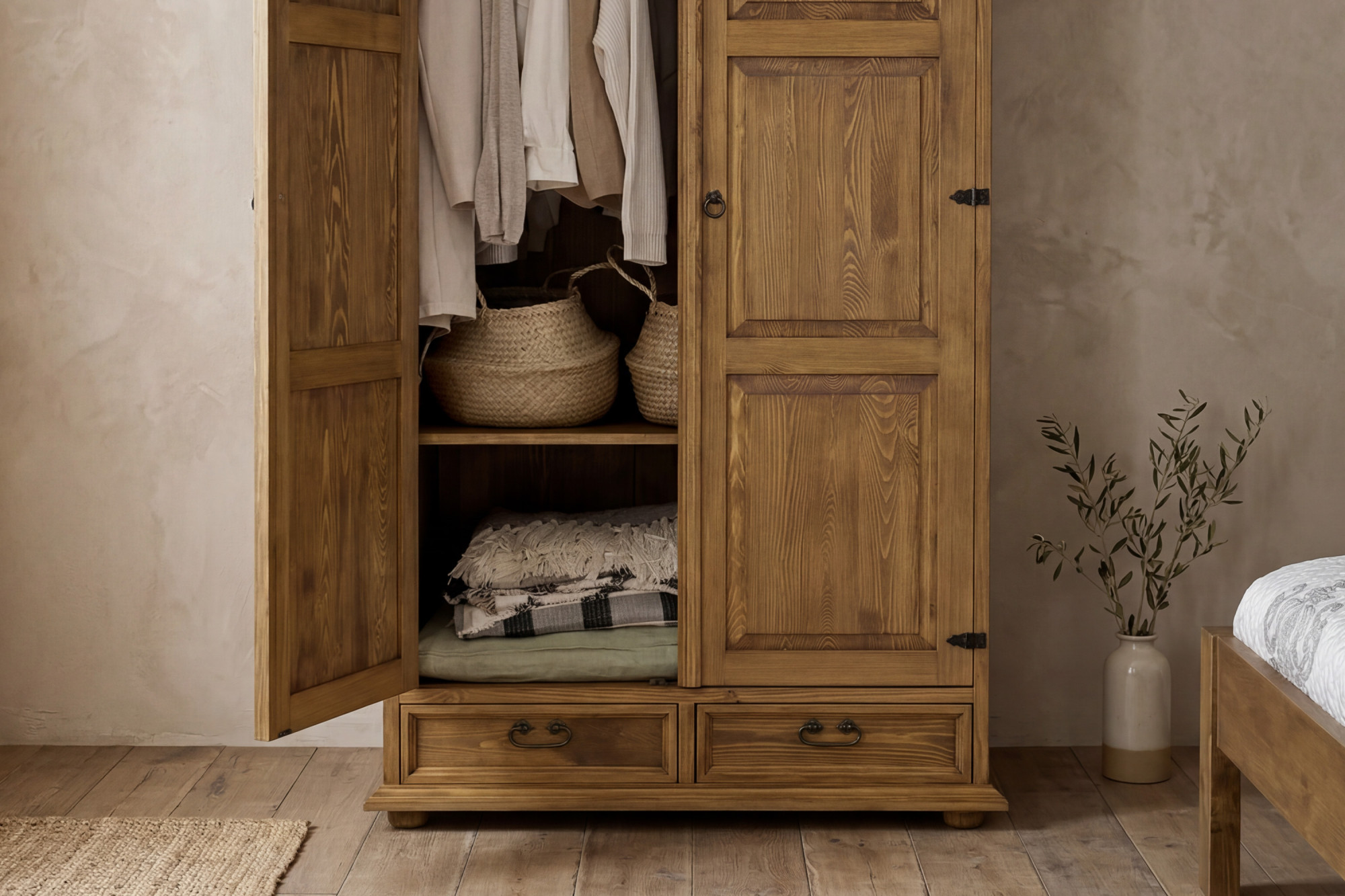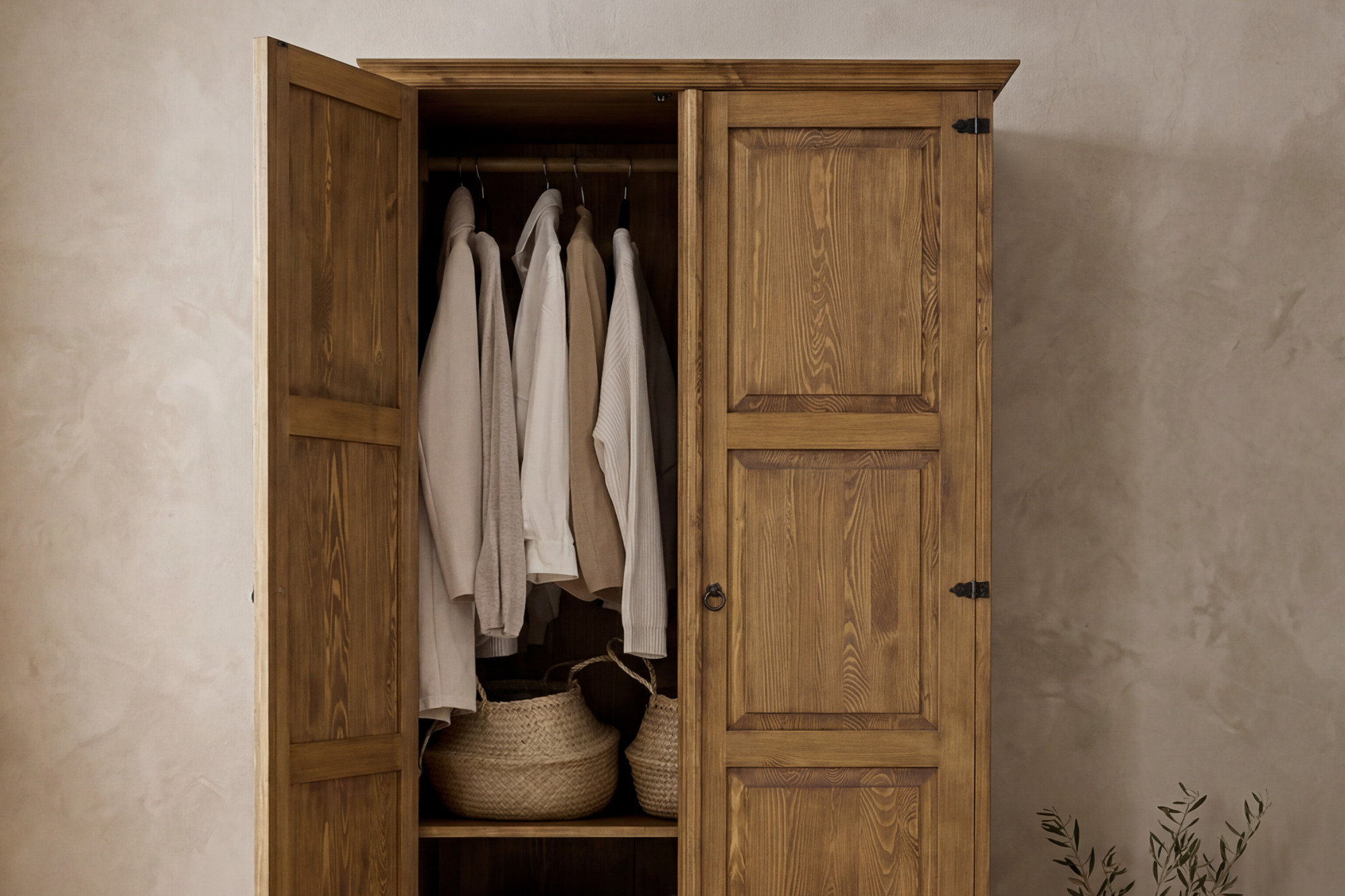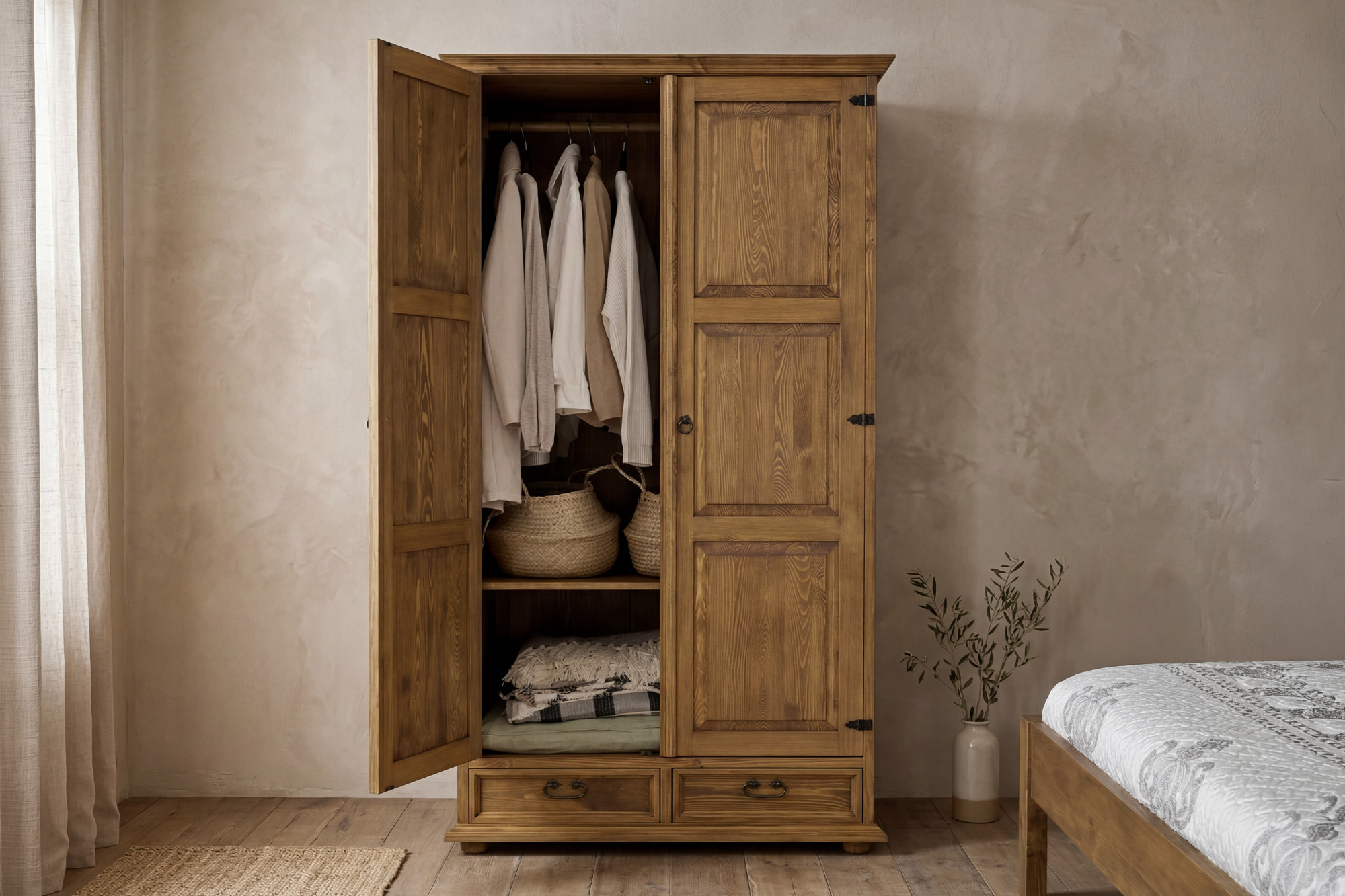 Dieser massive Kleiderschrank ist eine ausgezeichnete Wahl für Kunden, die ehrliche Holzmöbel den industriell hergestellten Alternativen vorziehen. Er überzeugt durch eine stabile Konstruktion, traditionelles Aussehen und praktische Nutzung. Dadurch eignet er sich nicht nur für das Schlafzimmer, sondern auch für stilvoll eingerichtete Landhäuser, Ferienhäuser oder Apartments im provenzalischen oder französischen Stil.
