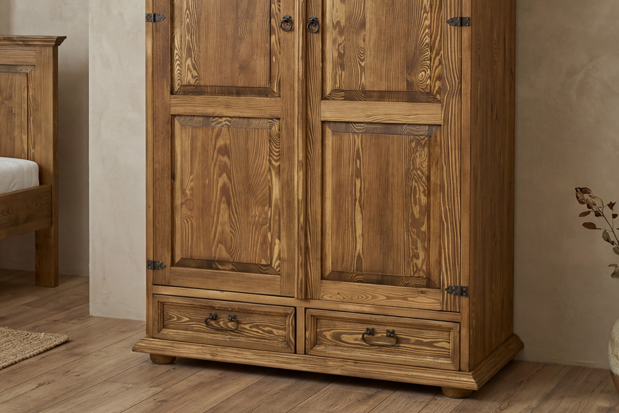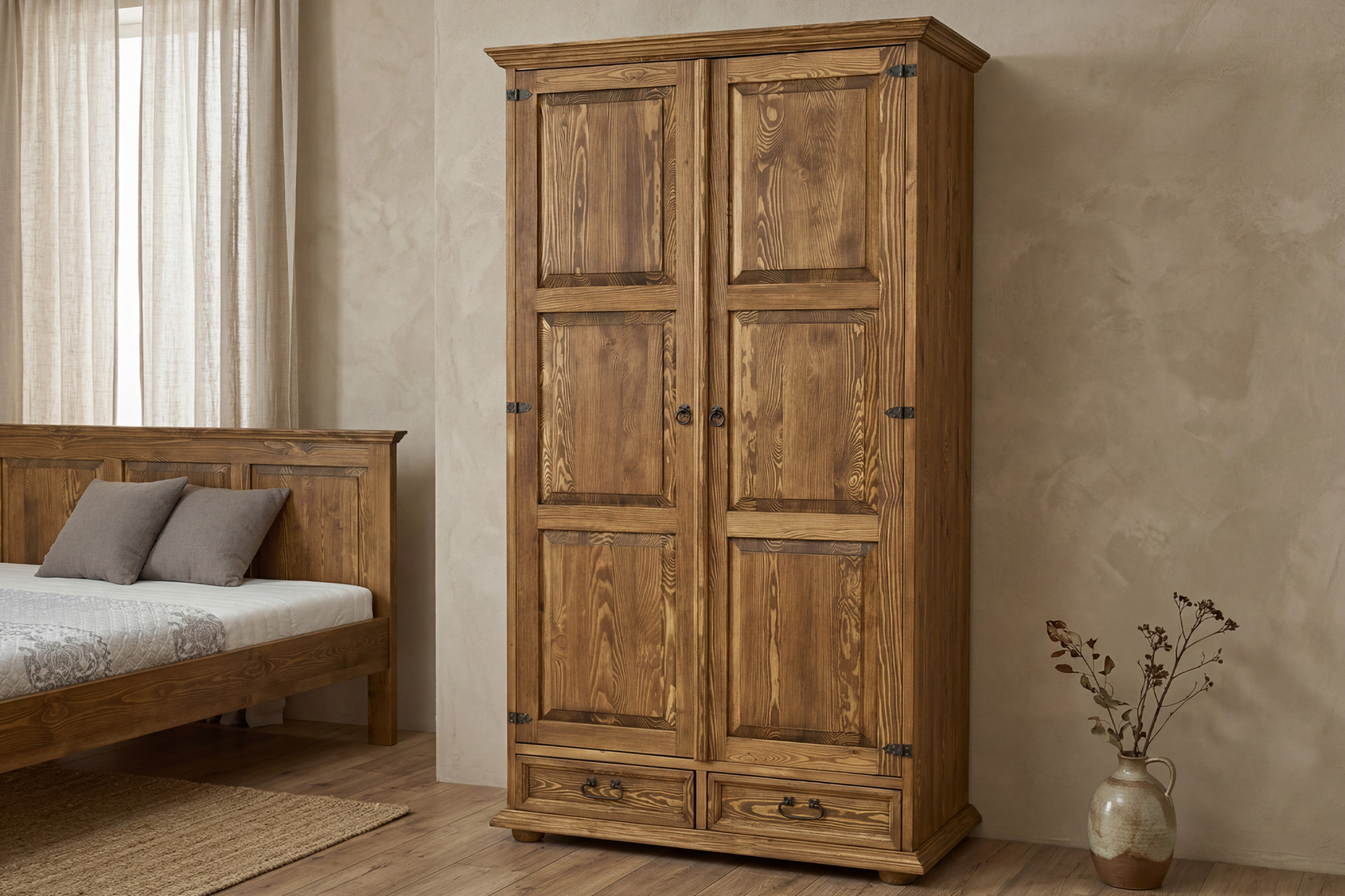 Entdecken Sie einen wunderschönen rustikalen Kleiderschrank im französischen Stil, der Ihrem Schlafzimmer den Charme des Landlebens, handwerkliche Qualität und zeitlose Eleganz verleiht. Dieser Zweittürige Kleiderschrank aus massivem Kiefernholz ist die ideale Wahl für alle, die auf der Suche nach hochwertigem Möbelstück mit Charakter, langer Lebensdauer und praktischem Innenraum sind. Durch sein authentisches Aussehen wird er nicht nur zu einem nützlichen Stauraum, sondern auch zu einem markanten Designelement Ihres Interieurs.