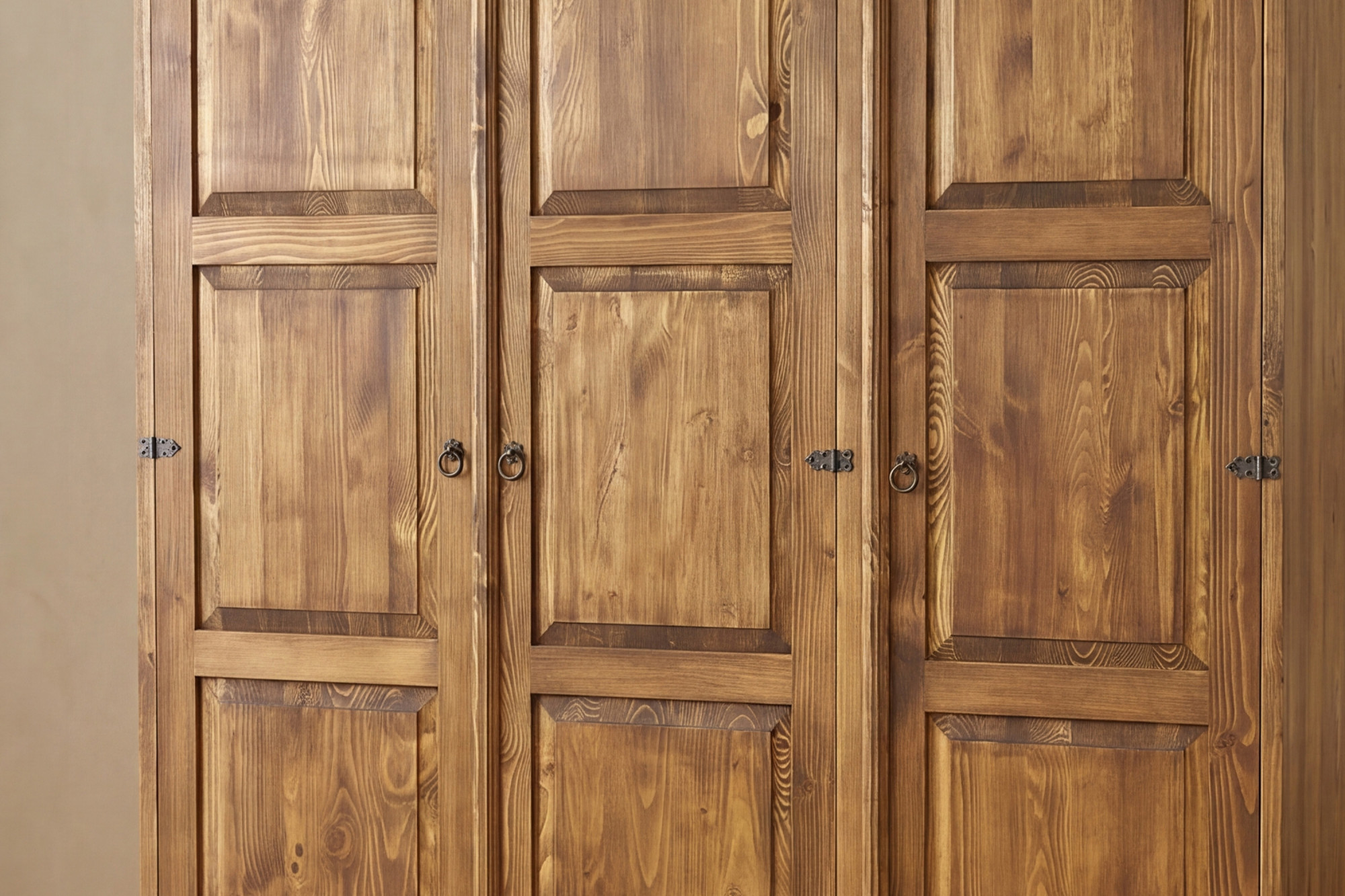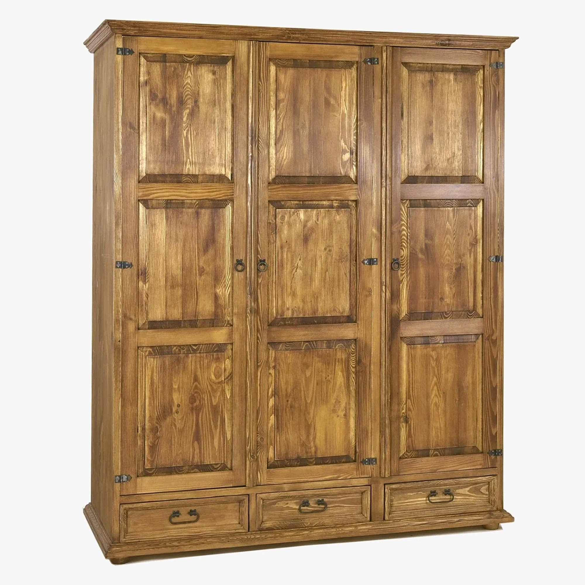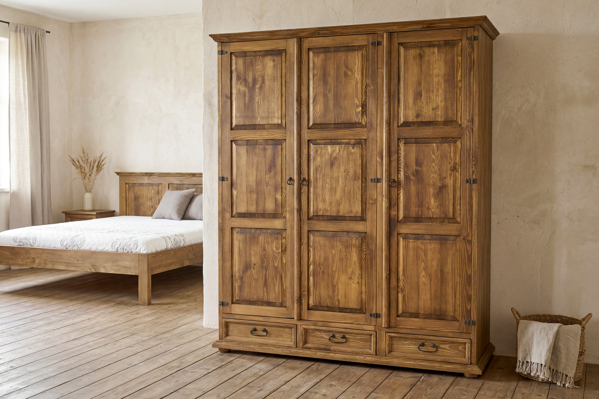 Entdecken Sie den Charme ehrlicher Landhausmöbel mit diesem dreitürigen rustikalen Schrank im französischen Stil, der dem Schlafzimmer die Atmosphäre der echten französischen Provinz verleiht. Der Schrank ist aus hochwertigem massivem Kiefernholz gefertigt, was ihm Festigkeit, eine lange Lebensdauer und einen authentischen natürlichen Charakter verleiht. Die elegante rustikale Ausführung, die ausgearbeiteten Details und der warme, dunkle Honigton machen aus diesem Schrank nicht nur einen praktischen Stauraum, sondern auch ein markantes Designelement im Raum.