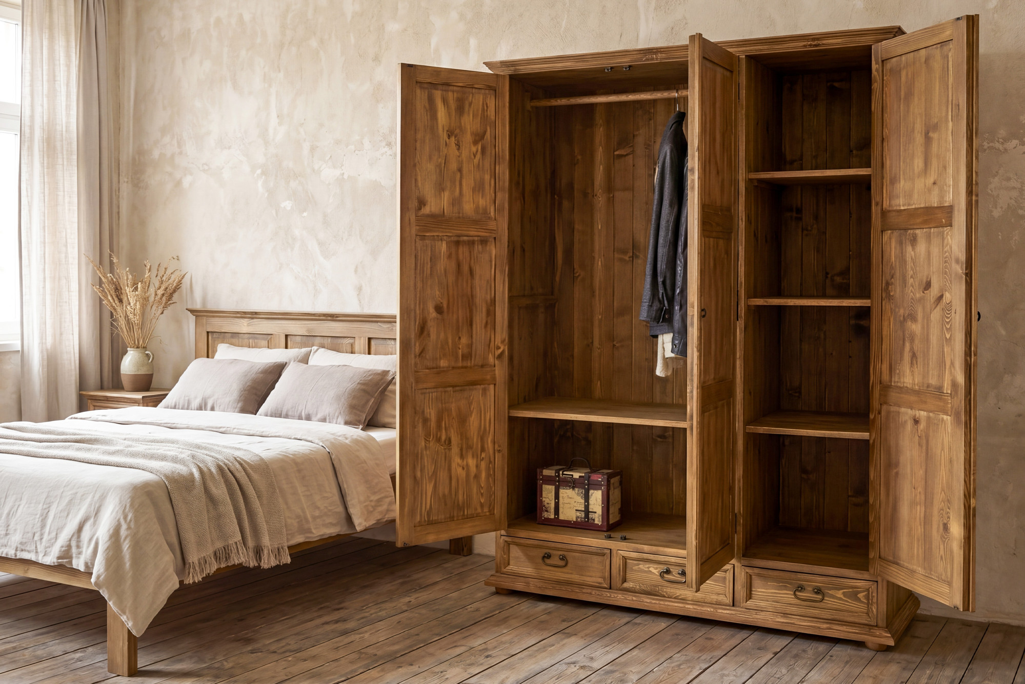 Der Schrank ist aus hochwertigem massivem Kiefernholz gefertigt, das wegen seiner Festigkeit und natürlichen Optik beliebt ist.