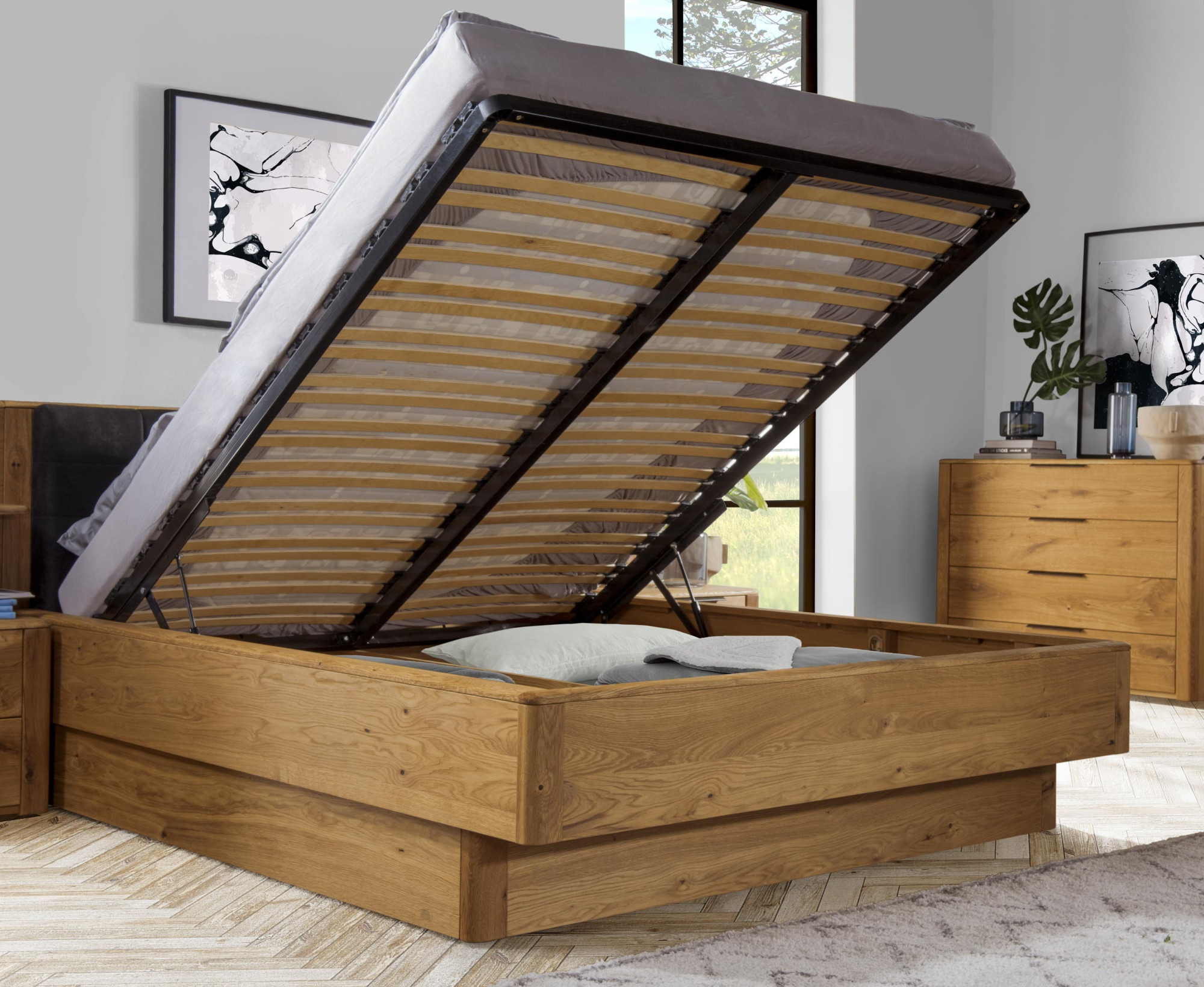Massivholz-Eichenbett mit Stauraum, Texas