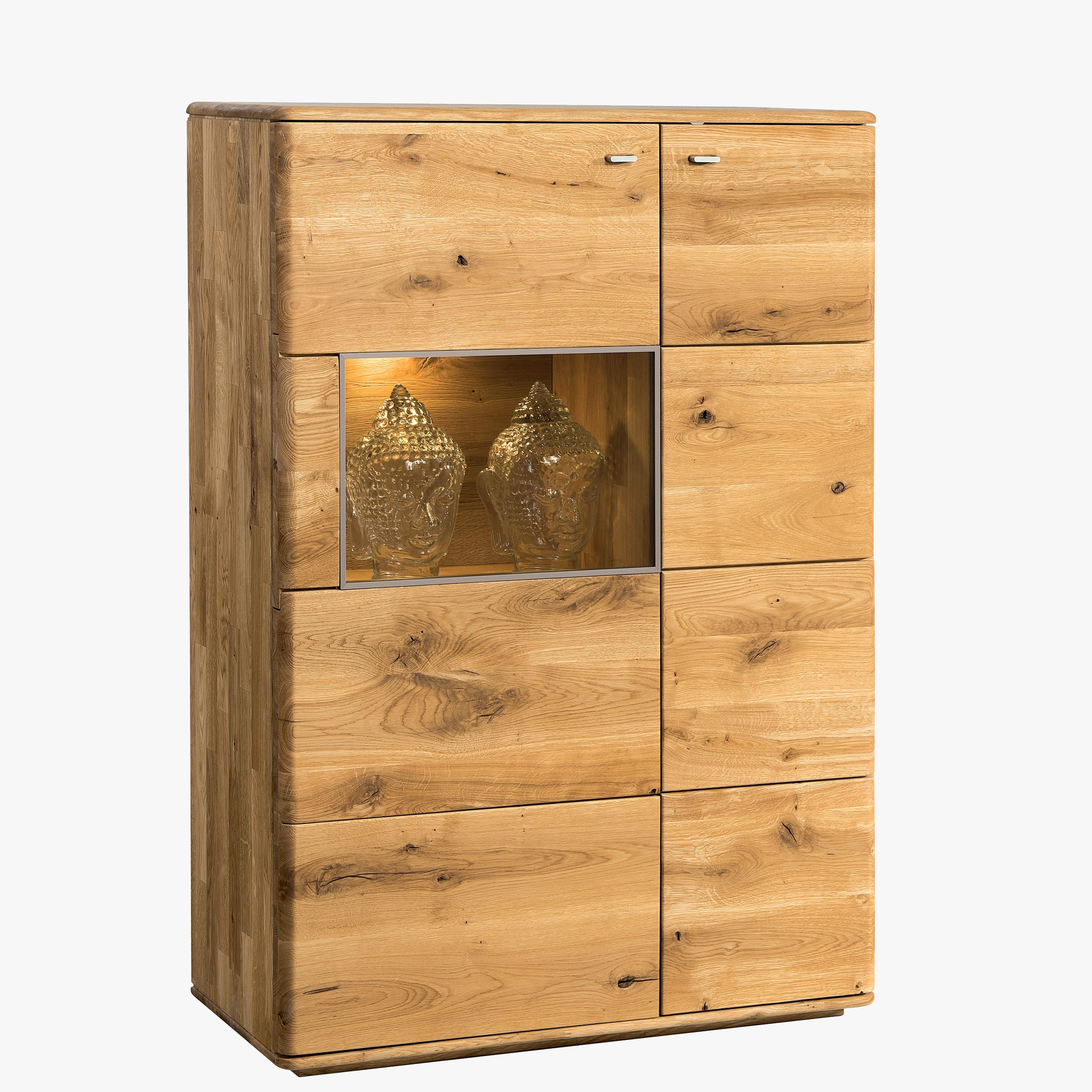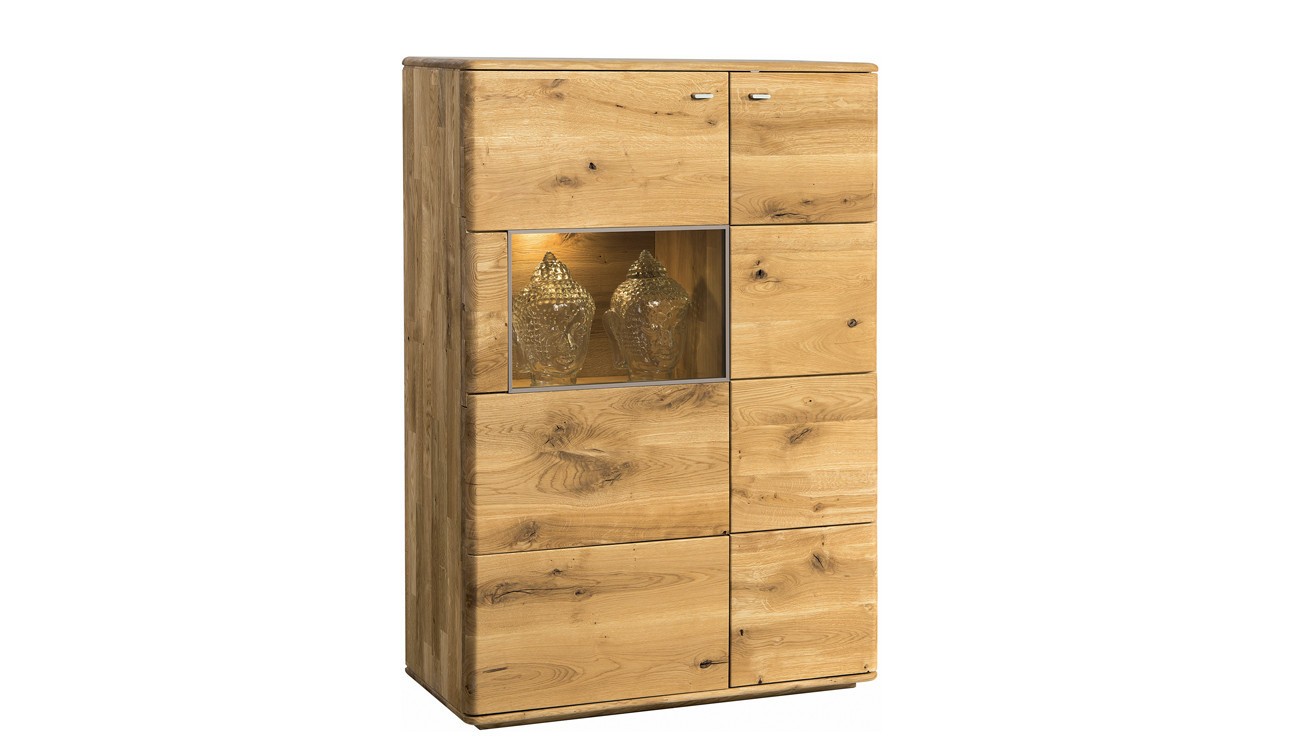 Hohe Kommode Texas mit Glasvitrine und Beleuchtung, Holz