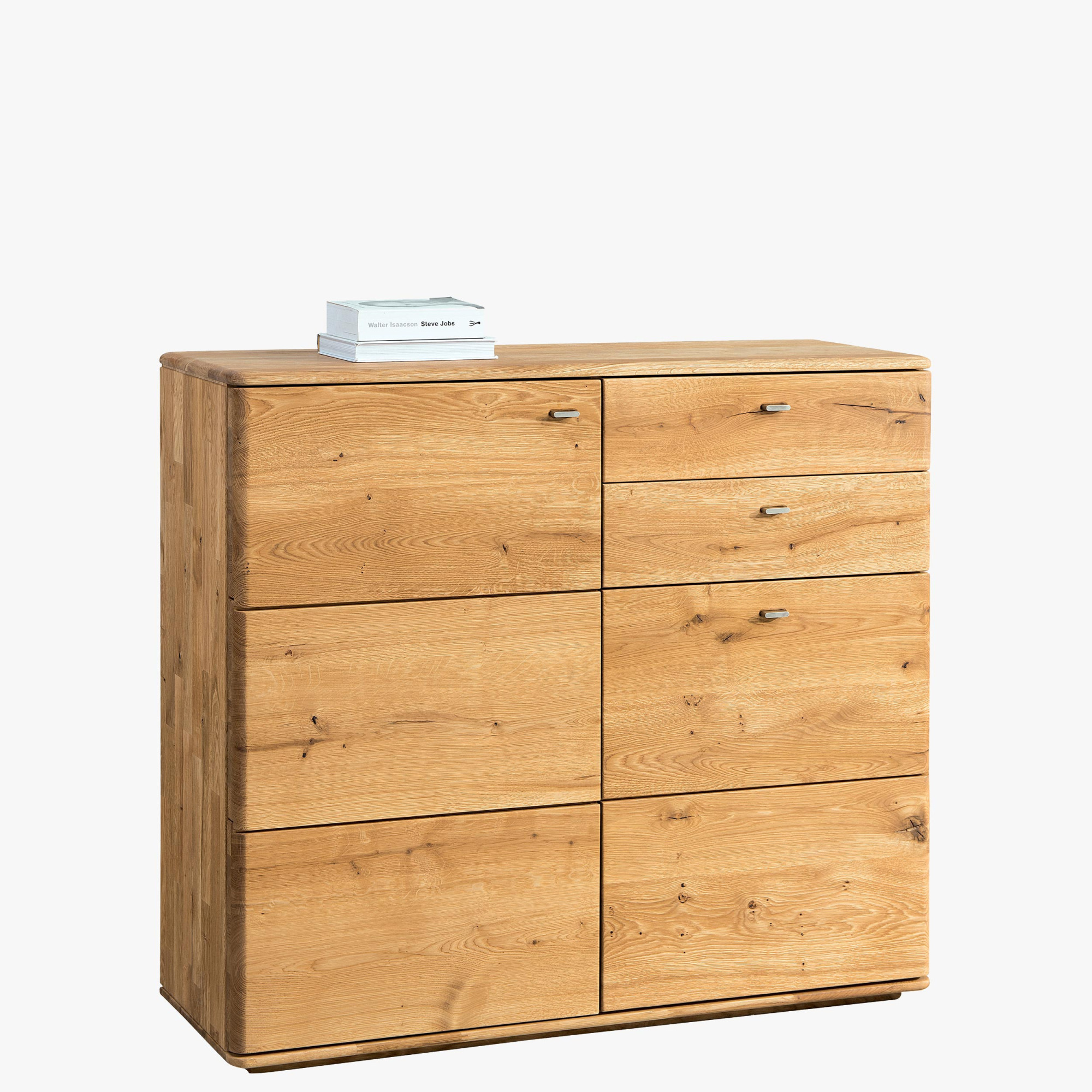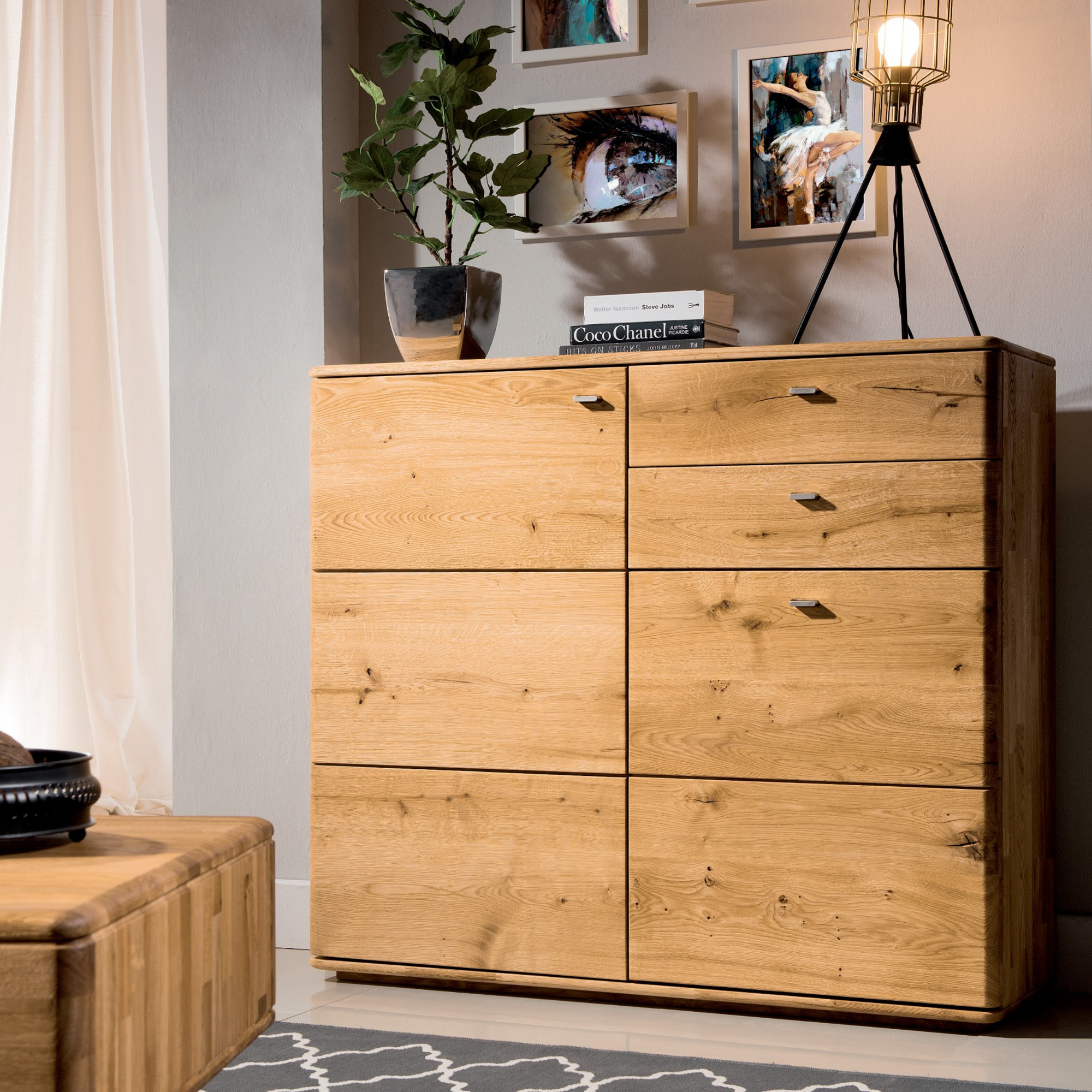 Die Kommode Texas wird Sie mit ihrem Design überzeugen. Natürliches Eichenholz können Sie in zwei Farbvarianten wählen. Die Hersteller haben der Kommode absichtlich natürliche Unvollkommenheiten wie Astlöcher und Risse belassen, um die Authentizität der natürlichen Verarbeitung zu betonen. Neben dem schönen Aussehen bietet die Kommode ihren Nutzern auch eine ausreichend große Ablagefläche oben sowie viel Stauraum in Form von Schubladen und einem Schrankteil. Mit der Kommode werden Sie sich zweifellos gut verstehen.