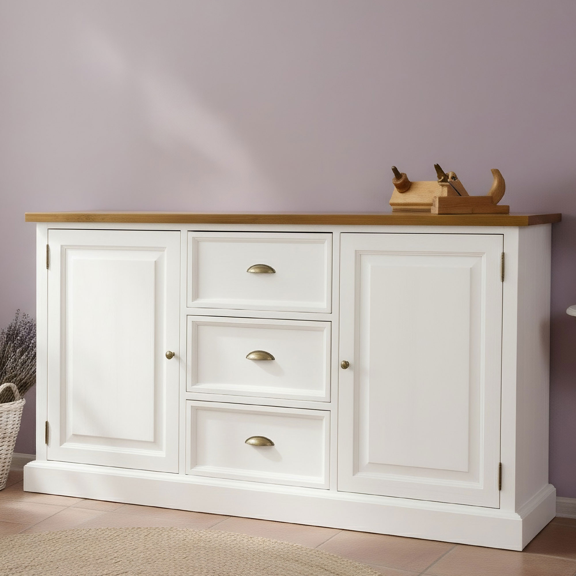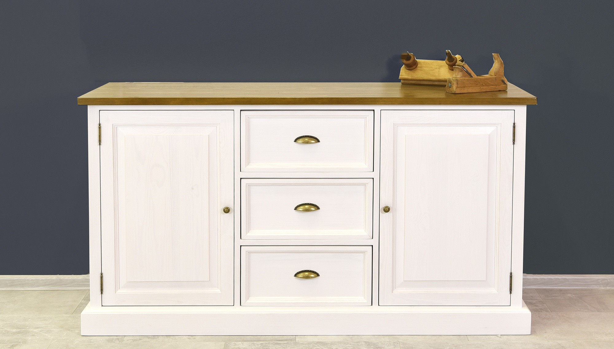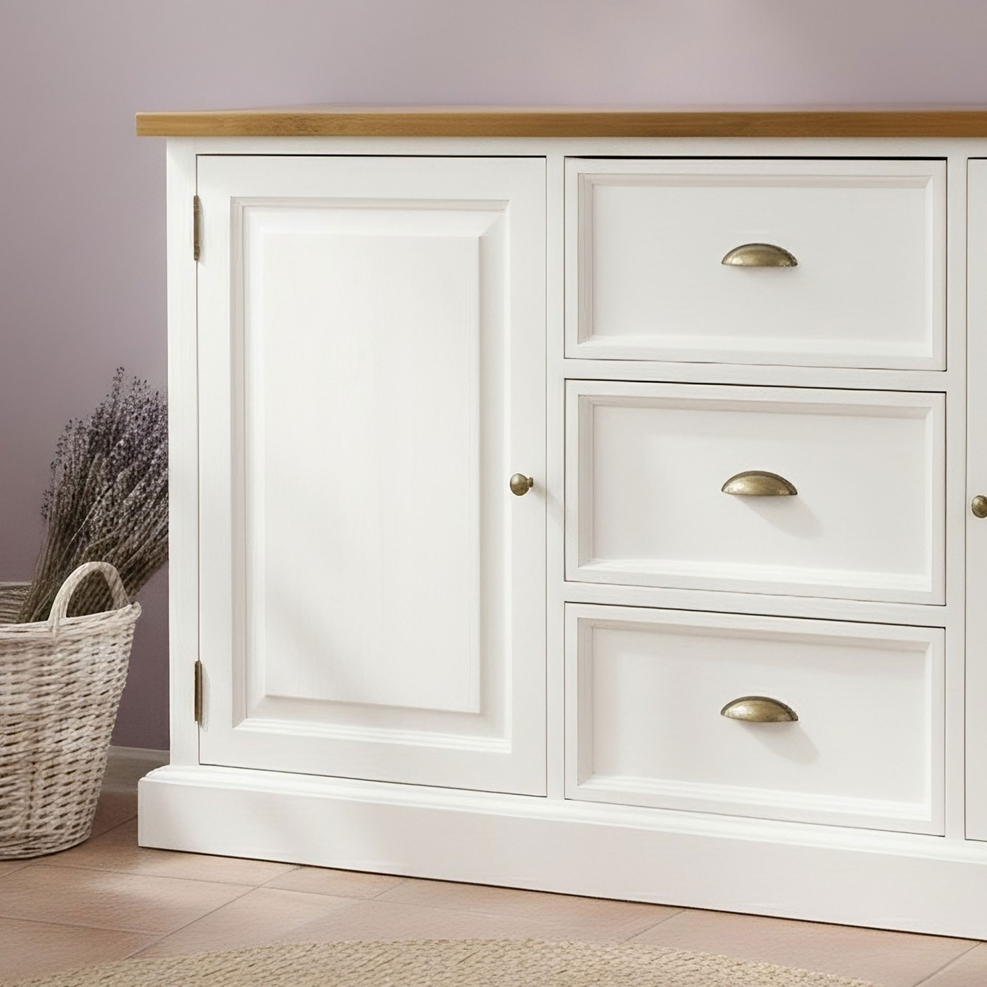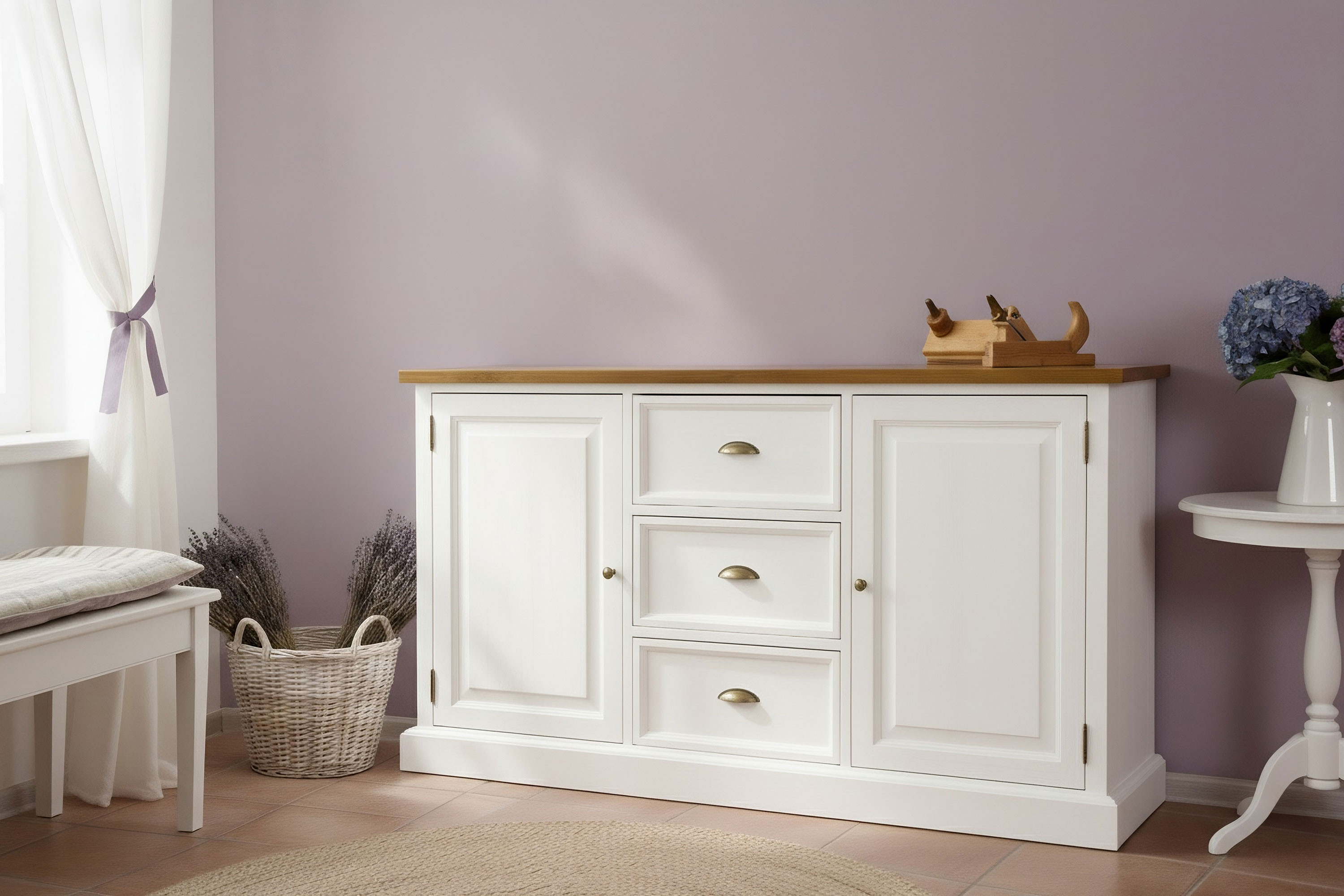 Die Kommode bietet eine praktische Aufteilung – in der Mittelpartie befinden sich drei geräumige Schubläden, an den Seiten finden Sie Türen mit einem Innengestell, wo Sie Kleinigkeiten und auch größere Gegenstände bequem aufbewahren können. Der rustikale Look wird durch handgeschmiedene Griffe unterstrichen, die oberflächlich behandelt, widerstandsfähig und farbecht sind. Die weiß-braune Farbkombination wirkt harmonisch und lässt sich leicht mit weiteren Möbelstücken der Provence-Kollektion kombinieren. Selbstverständlich verfügt die Kommode auch über ein FSC-Holzzertifikat, das die verantwortungsbewusste und ökologische Herkunft der verwendeten Materialien bestätigt. Diese Kommode ist die ideale Lösung für Haushalte, die Eleganz, Funktionalität und Qualität direkt vom Hersteller suchen.