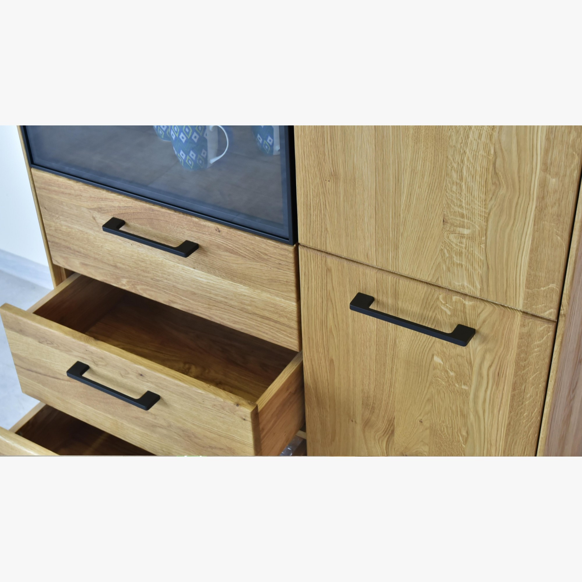 Hohe Eichenkommode mit Glas im Loft-Stil, bestimmt für moderne Innenräume. Die Kommode mit Glas steht auf schwarzen Metallfüßen und wirkt dadurch industriell. Gerade die Kombination von Metall und Holz ist außergewöhnlich attraktiv. Die Kommode wird bereits montiert geliefert. Die Beleuchtung ist nicht im Lieferumfang enthalten, kann jedoch gegen Aufpreis erworben werden. Möbel werden mit modernsten CNC-Maschinen hergestellt, was höchste Qualität garantiert. Sehen Sie sich alle Arten und Modelle der Lagos Kollektion an.