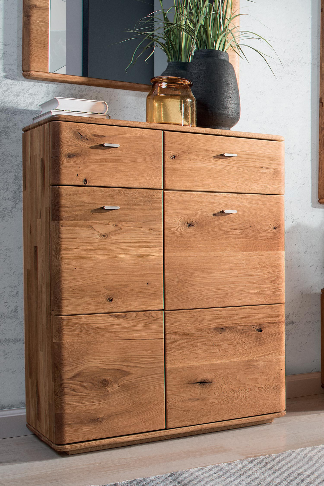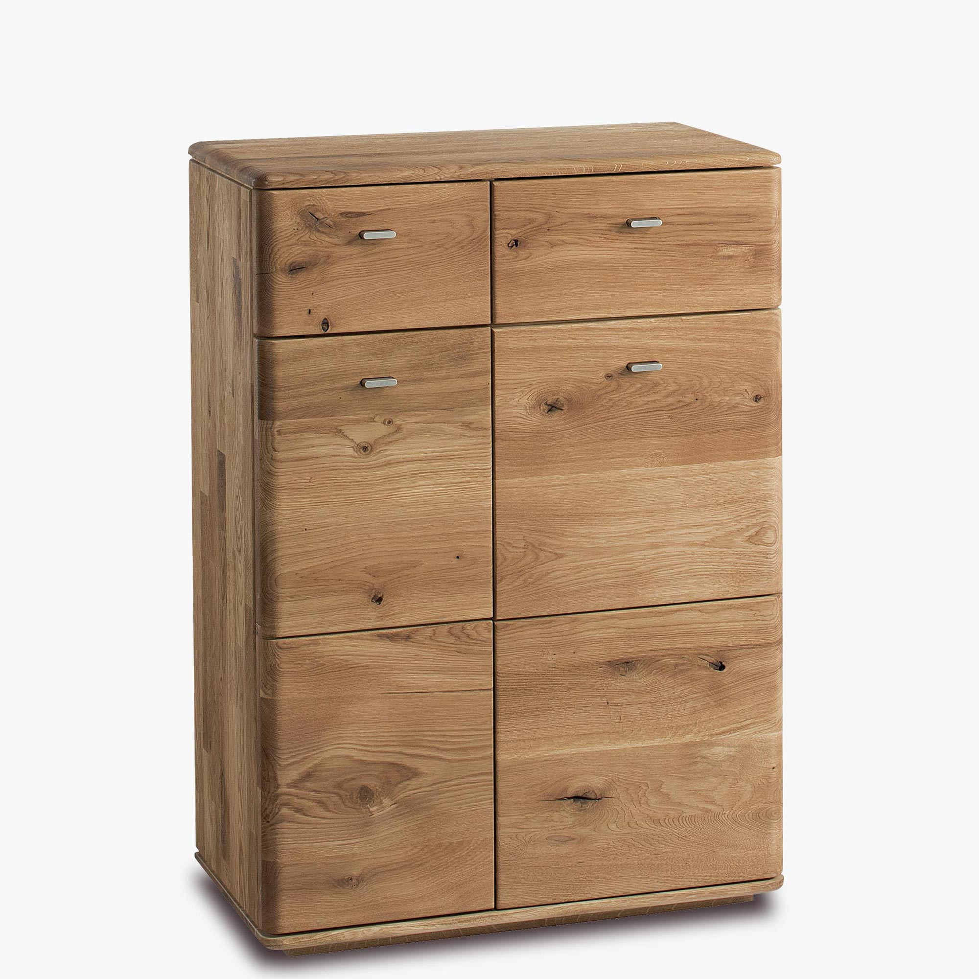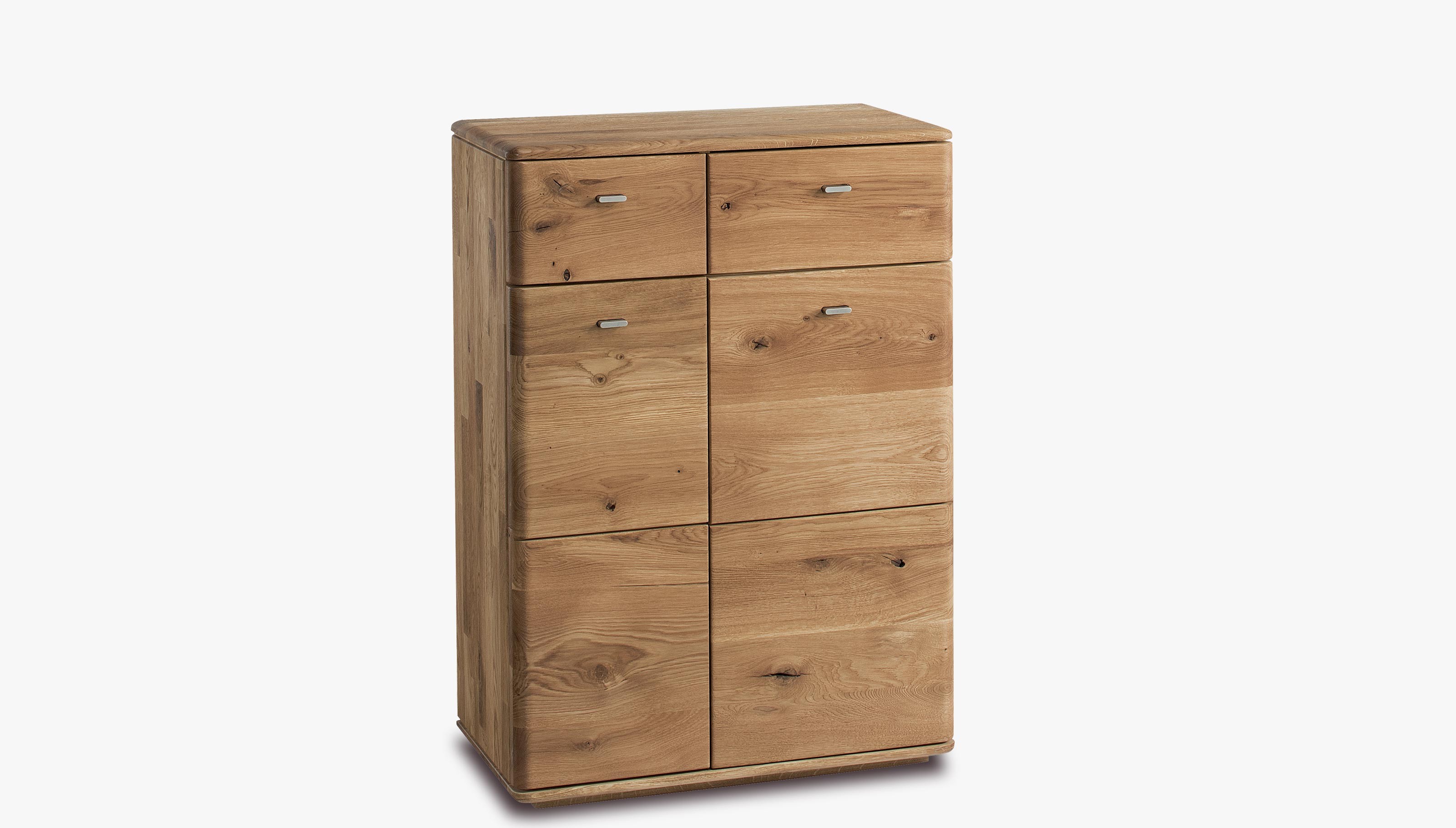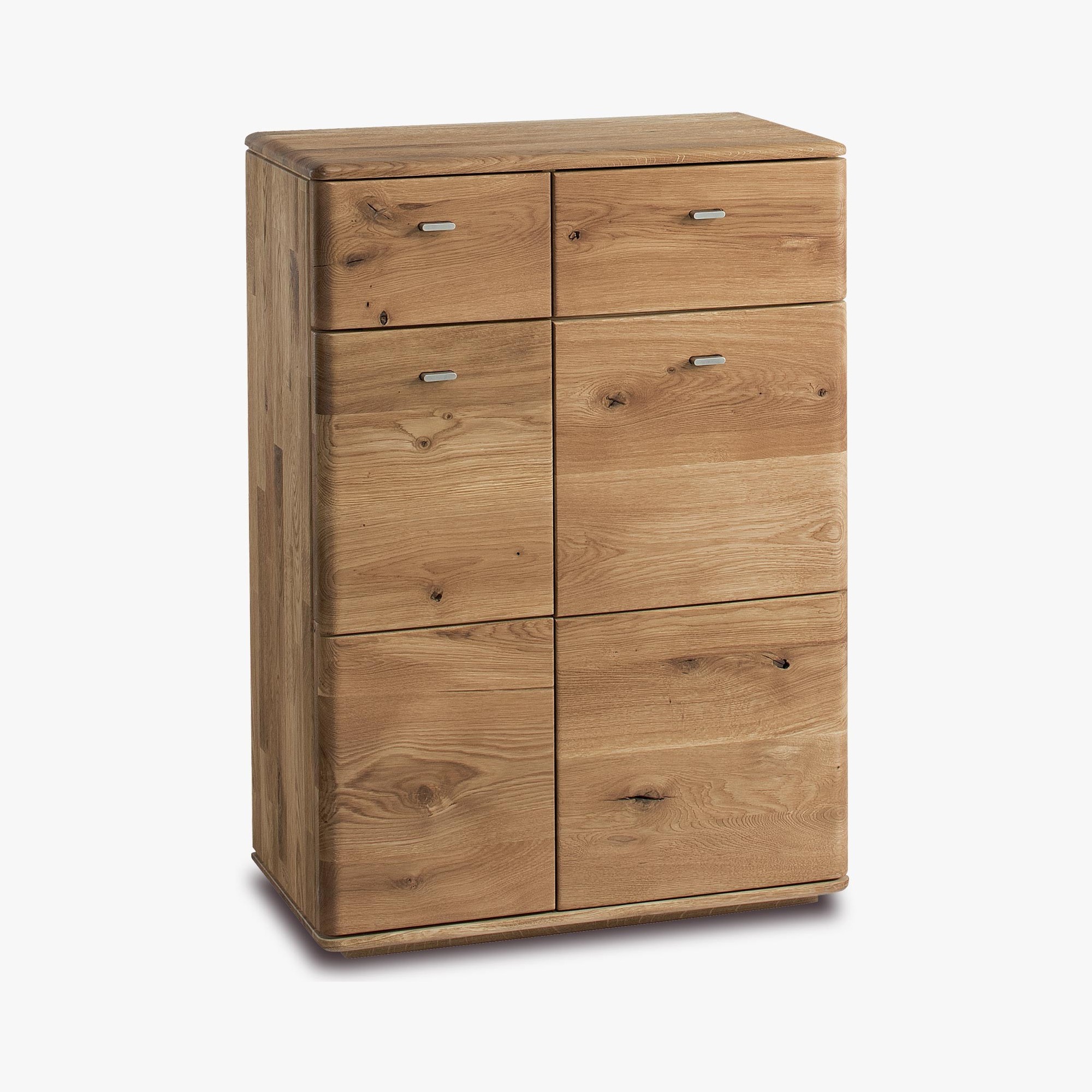 Kommode für den Flur, die auch als Schuhschrank aus Eichenholz dienen kann. Das Modell Typ 10 ist ein exklusives Stück für Ihren Flur, wo Sie eine Garderobenwand zusammenstellen können. Die Kommode hat im oberen Teil 2 Schubladen, im unteren Teil befinden sich Türen, hinter denen sich 3 Regalböden befinden. Die Höhe zwischen den einzelnen Regalböden können Sie natürlich nach Belieben bestimmen. Türen und Schubladen haben eine geräuscharme Soft-Close-Funktion soft-close.