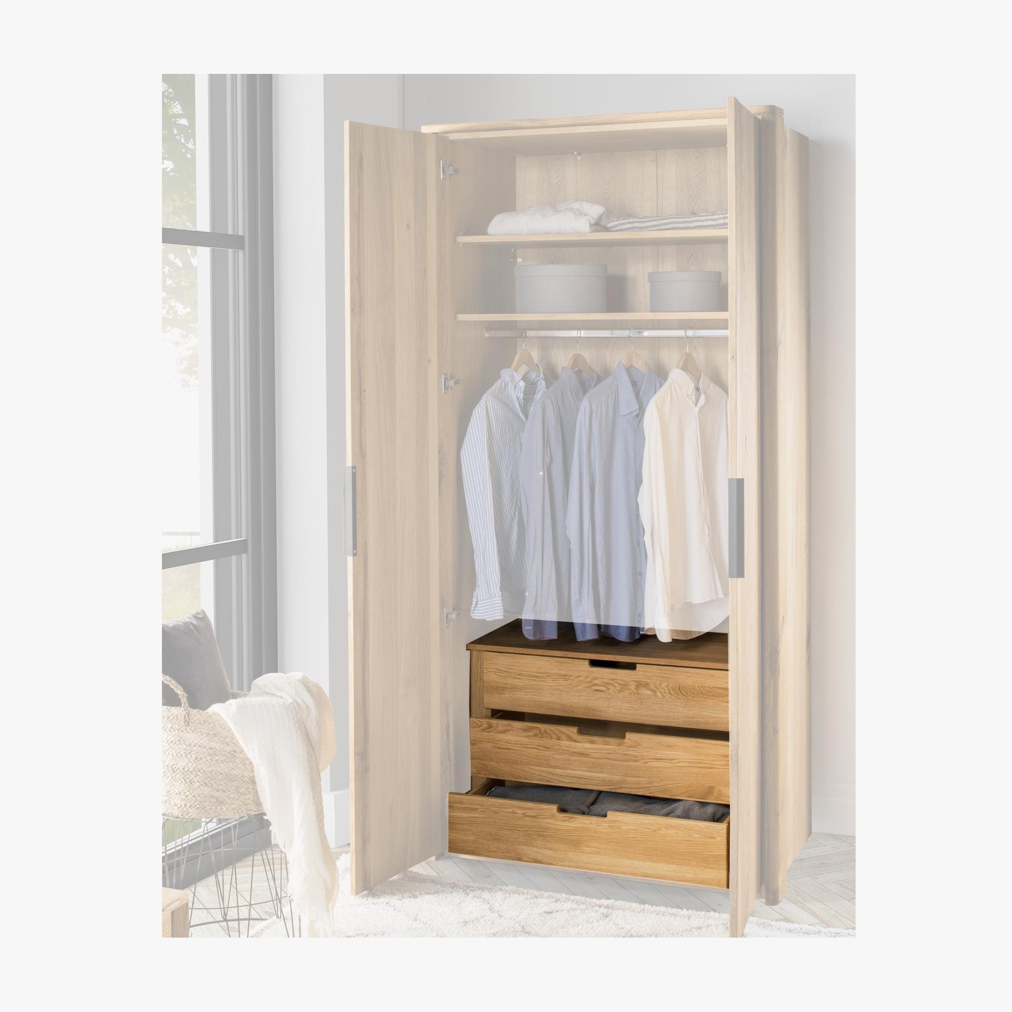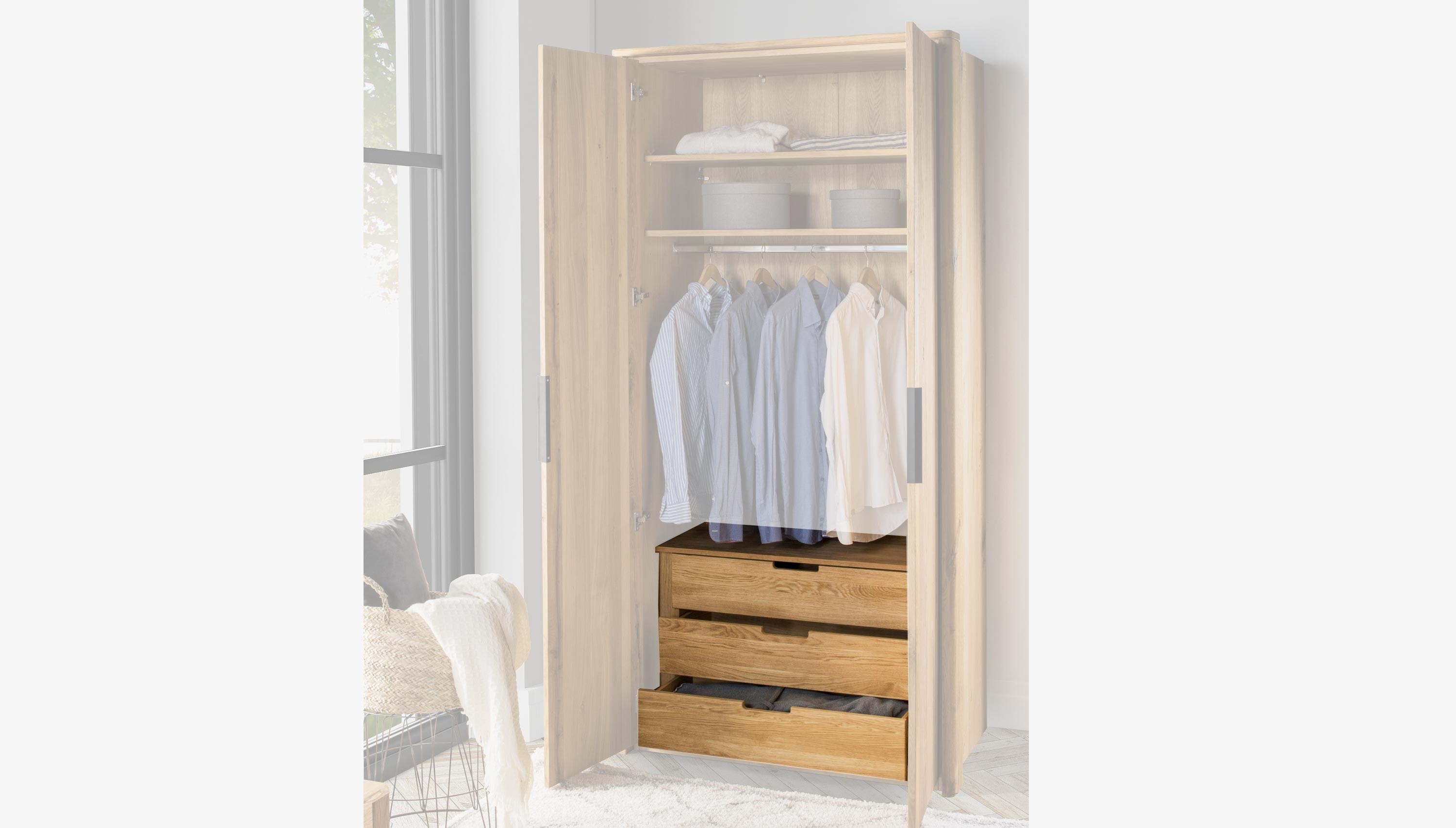 Original Zubehör für den Kleiderschrank Texas. Die Kommode hat 3 Schubladen und wird bereits montiert geliefert, sie wird direkt in den Schrank eingesetzt. Die Kommode wird in den Schrank eingesetzt, wenn an dem Schrank noch keine Türen montiert sind. Die Schubladen der Kommode verfügen über eine geräuscharme Soft-Close-Schließung.
