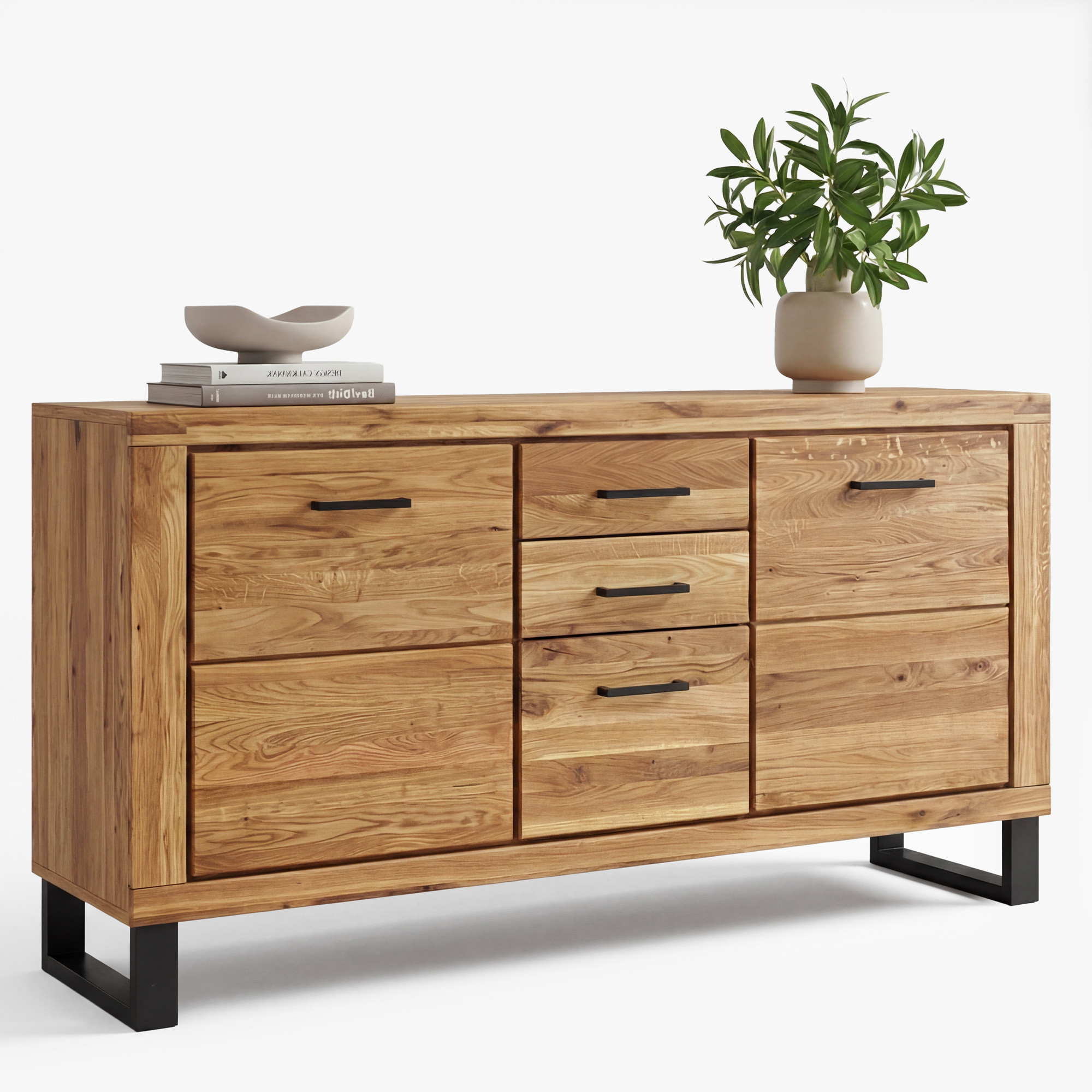 Der Korpus der Kommode besteht aus einer eichenfurnierten Platte mit einem inneren Korpus aus Eichenlaminat, was ein optimales Preis-Leistungs-Verhältnis gewährleistet. Die Kommode steht auf eleganten Stahlbeinen, die dem Möbelstück ein luftiges und modernes Aussehen verleihen und gleichzeitig die Reinigung des Bodens erleichtern. Mit den Maßen 158,5 × 40 × 82 cm ist die Kommode geräumig genug für Ihre Sachen und eignet sich sowohl für das Einfamilienhaus als auch für die geräumige Wohnung. Das Möbelstück wird bereits montiert geliefert, sodass Sie es sofort nach der Lieferung verwenden können.